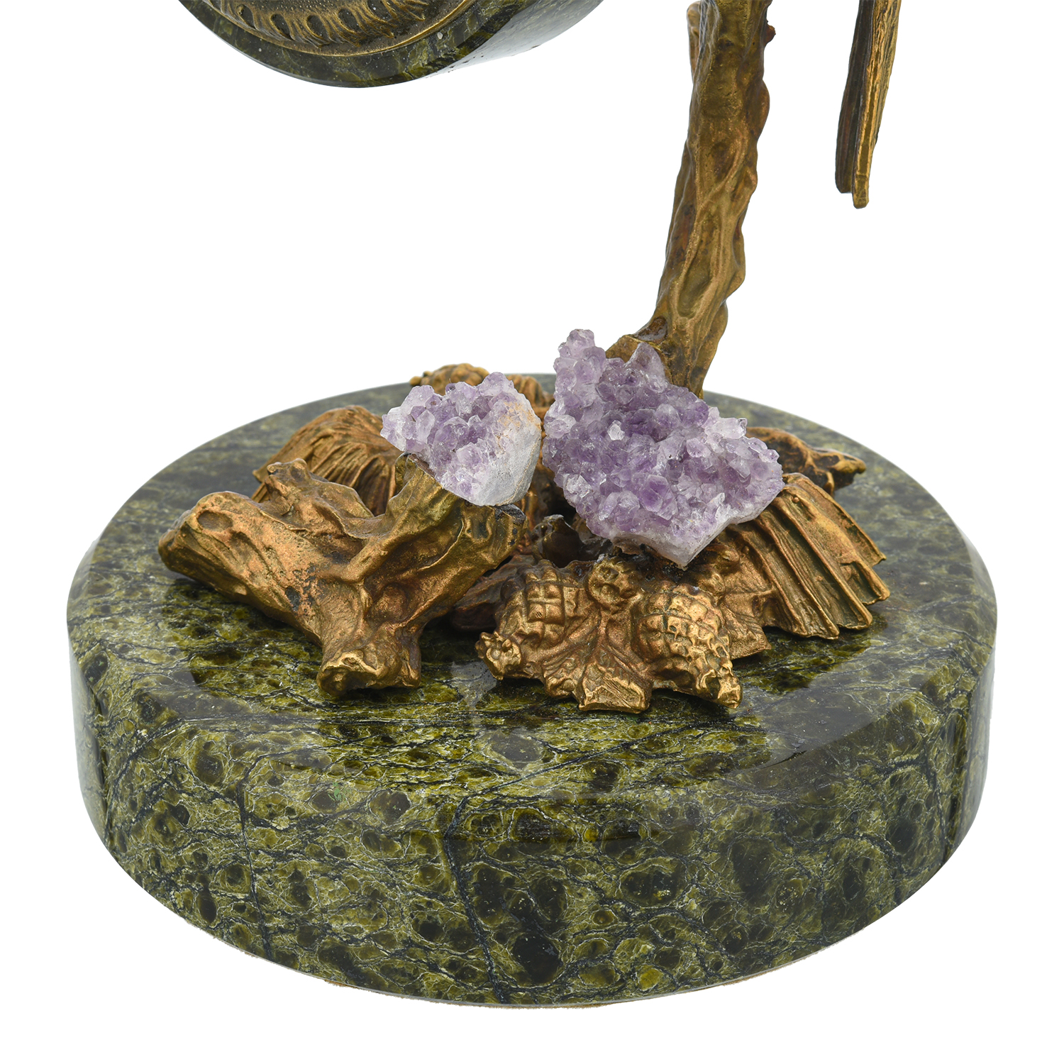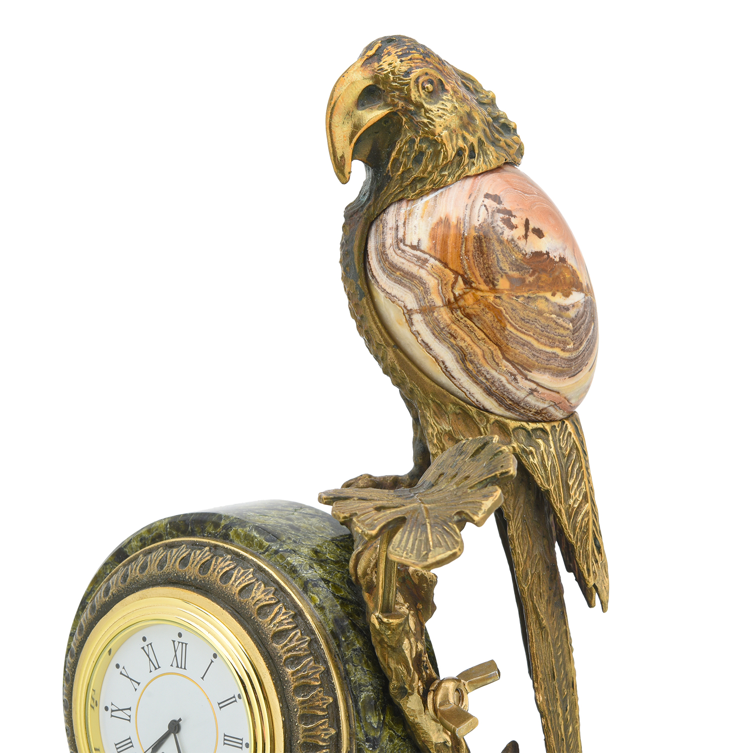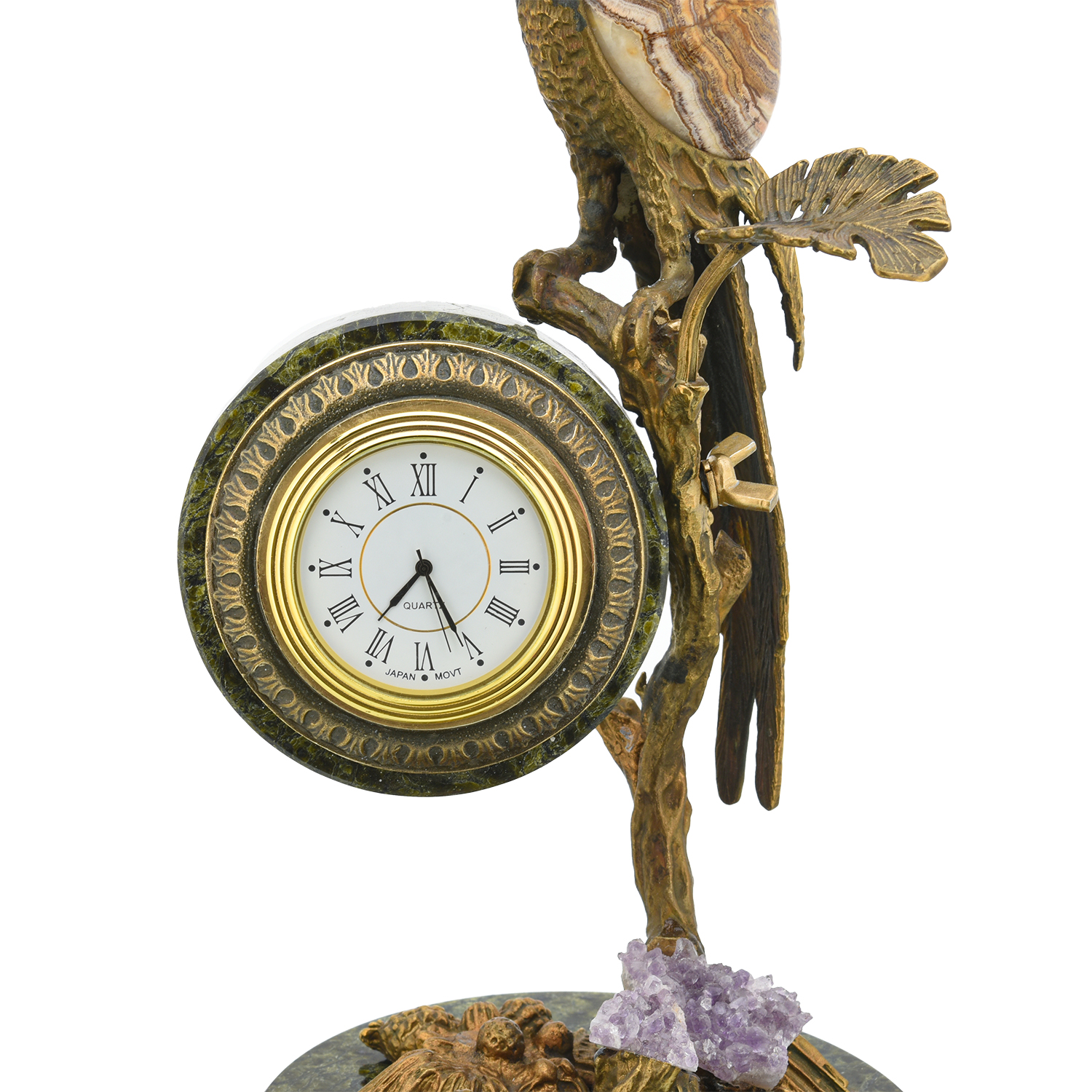 Часы настольные из камня "Попугай".Материалы: змеевик, яшма, горный хрусталь, бронза.