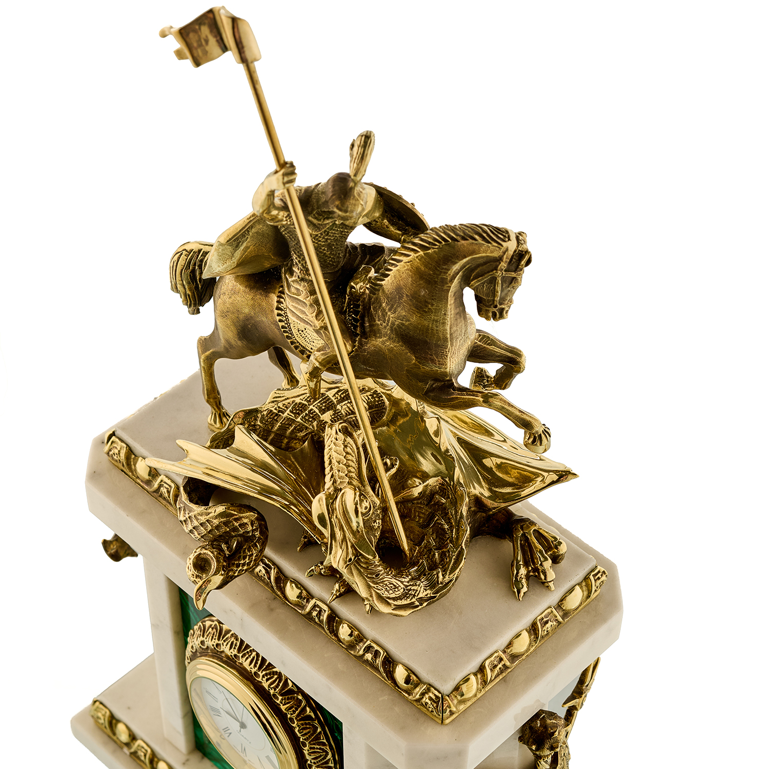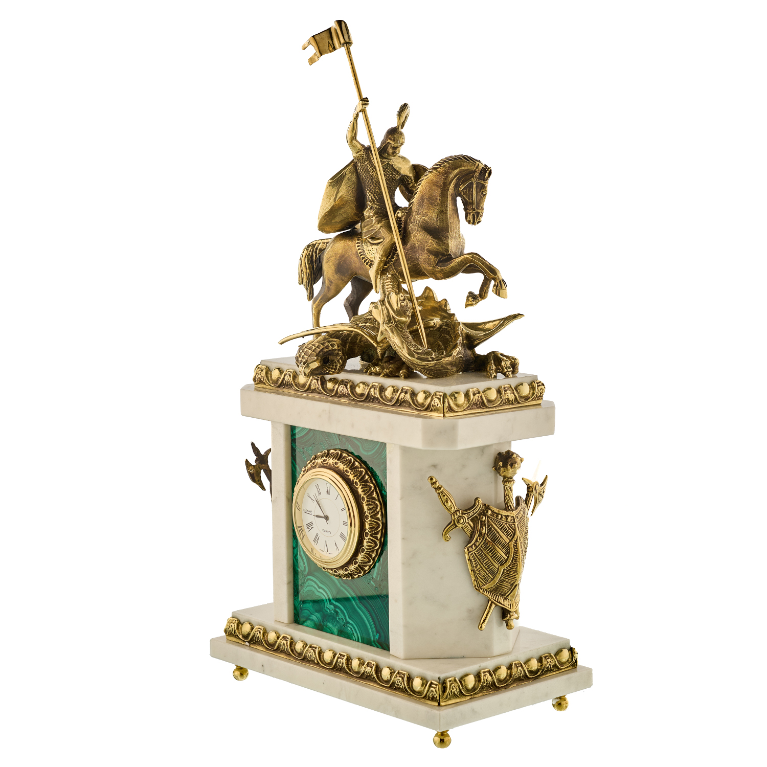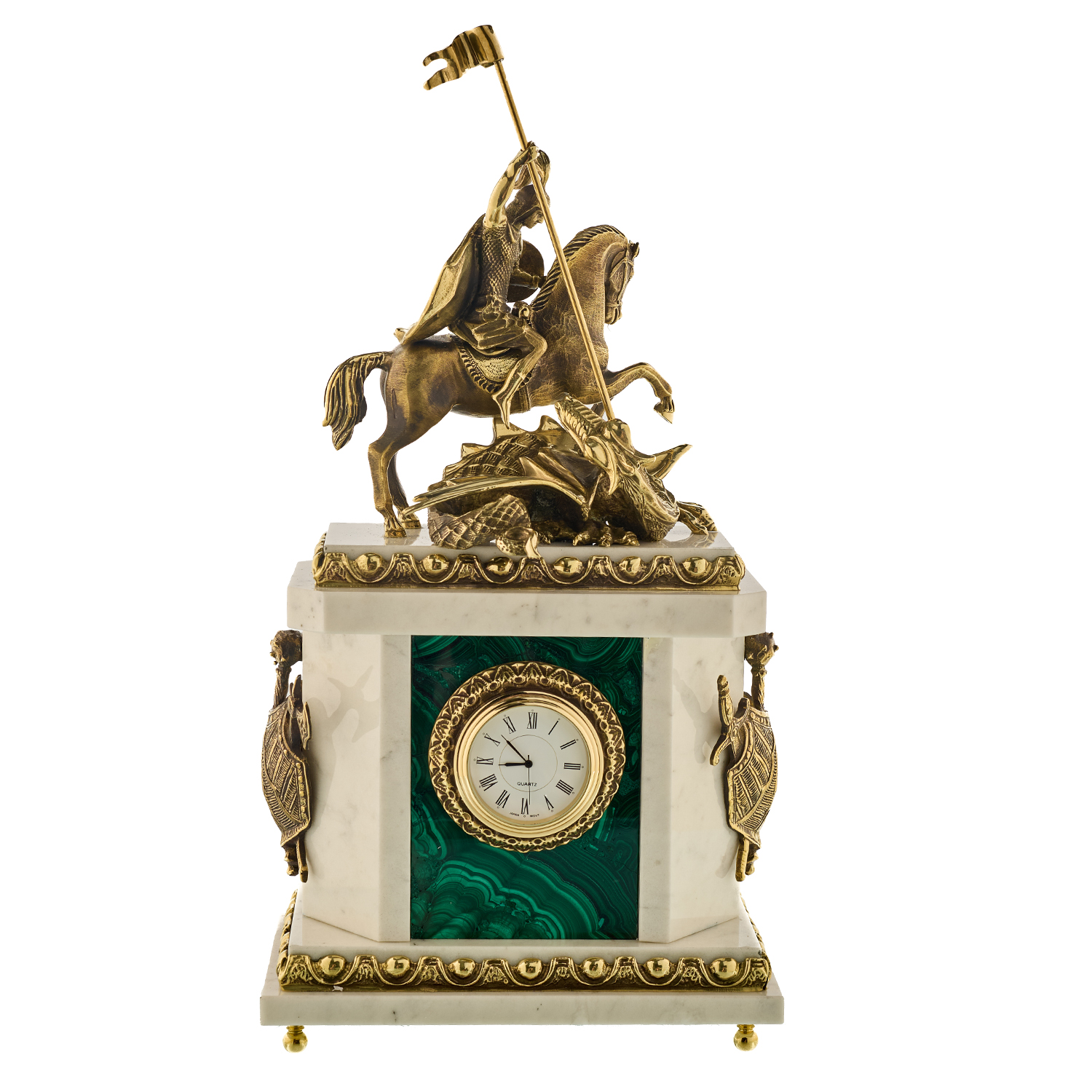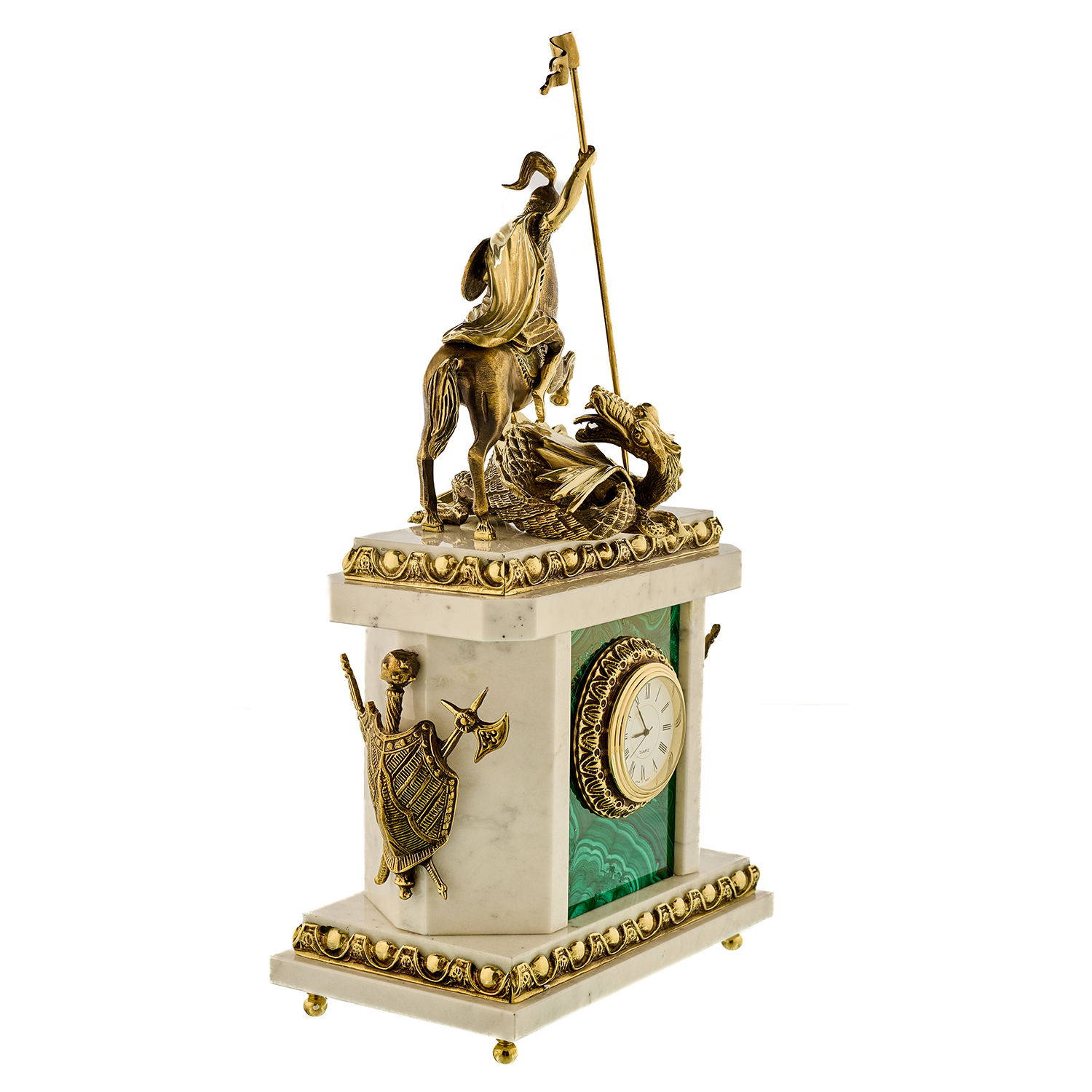 Часы каминные из малахита "Георгий Победоносец". Златоуст.Материалы: малахит, мрамор, бронза, золочение.