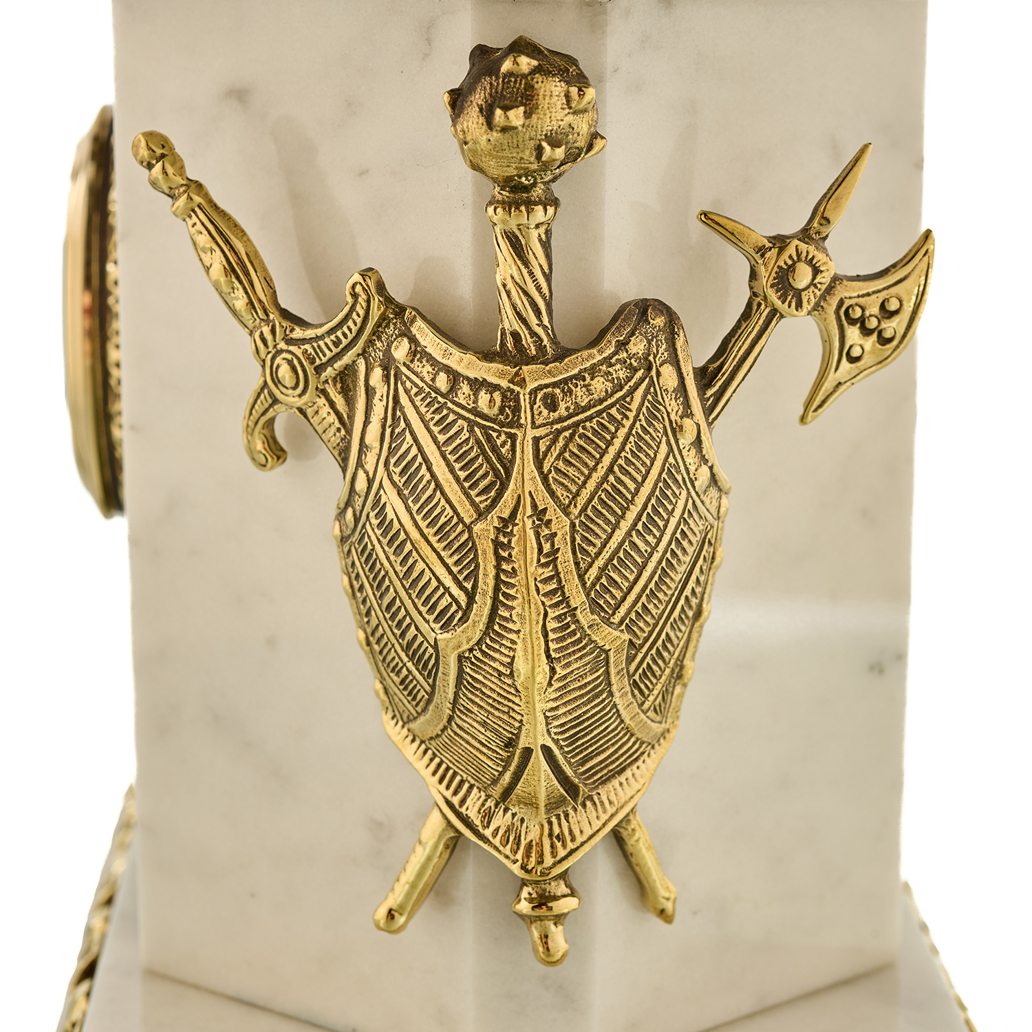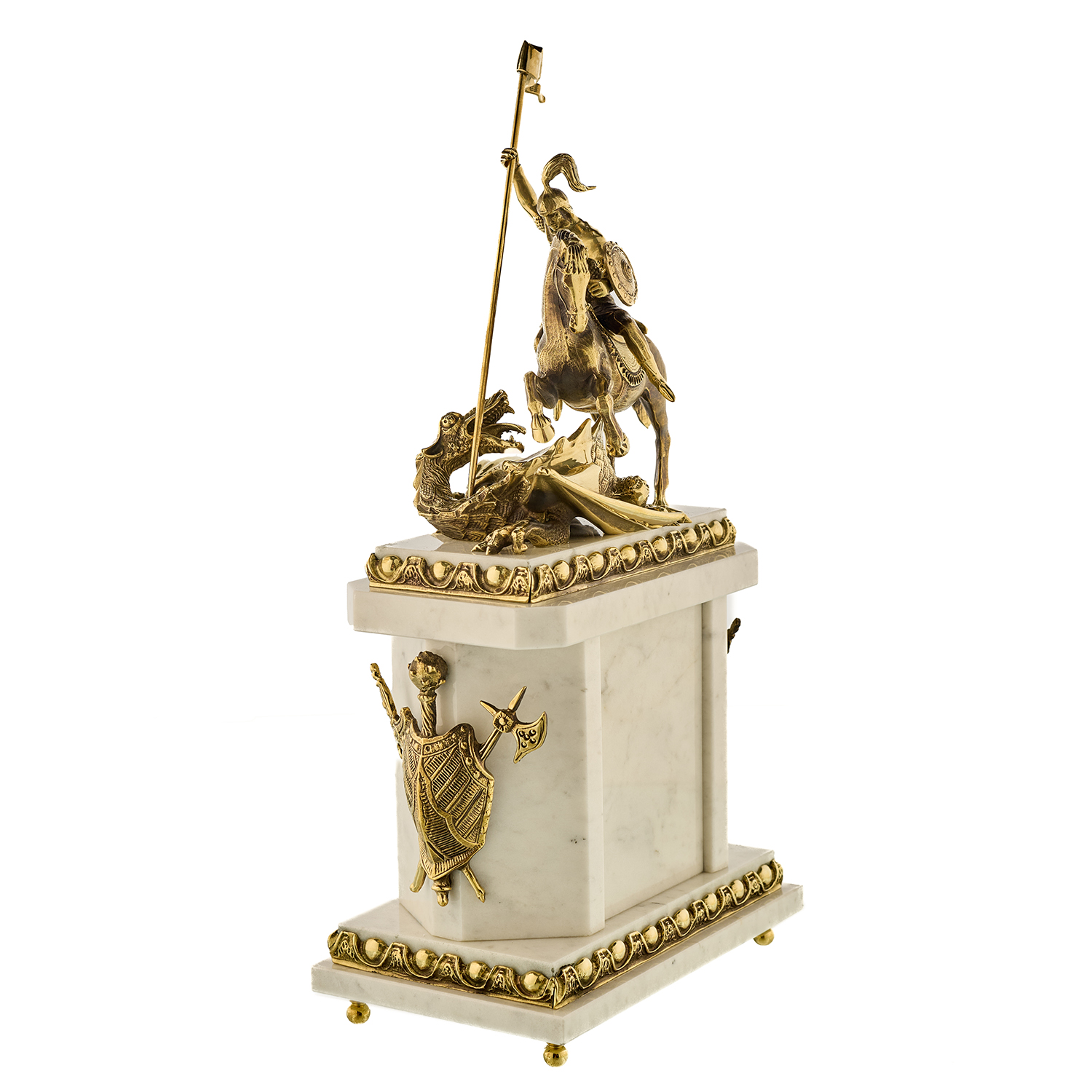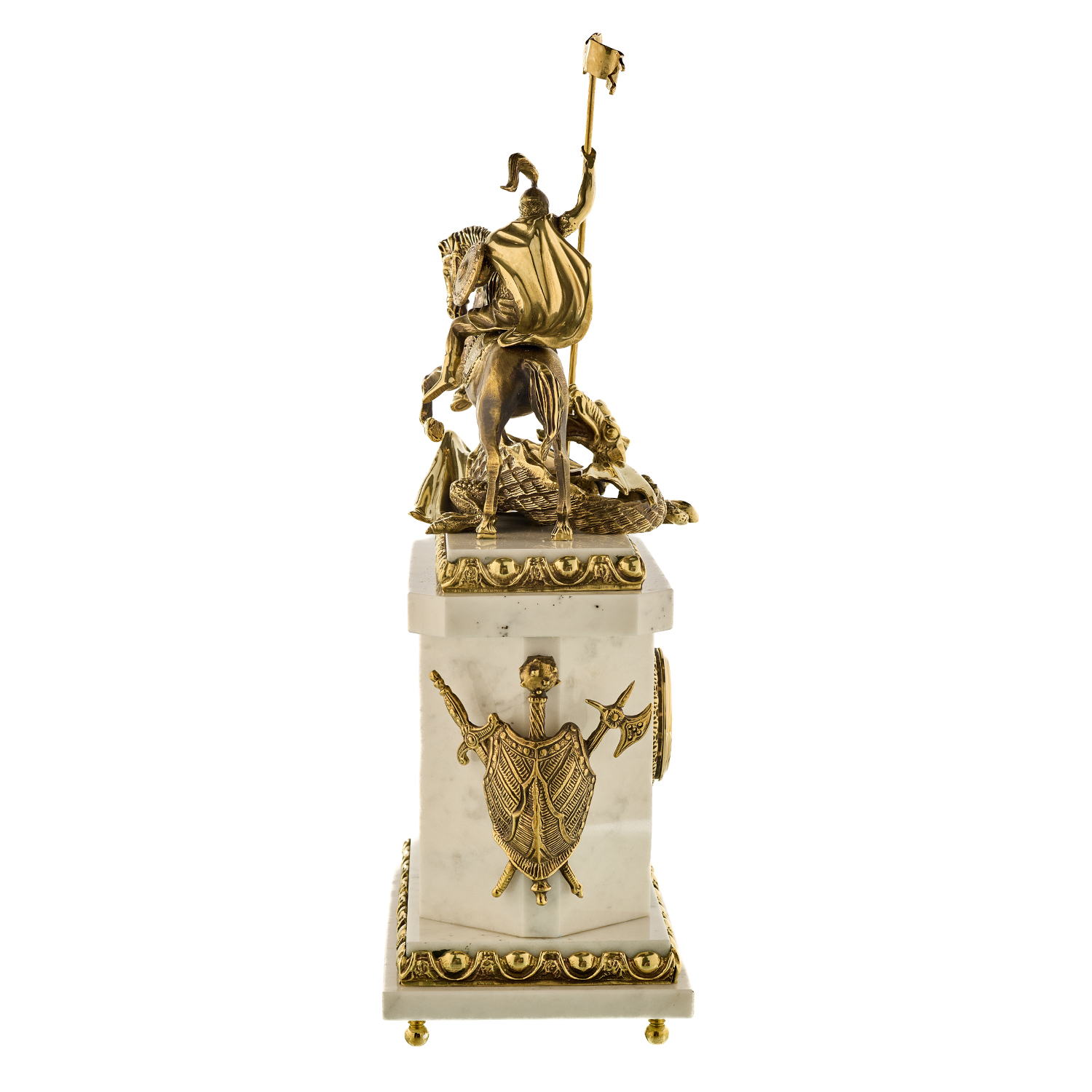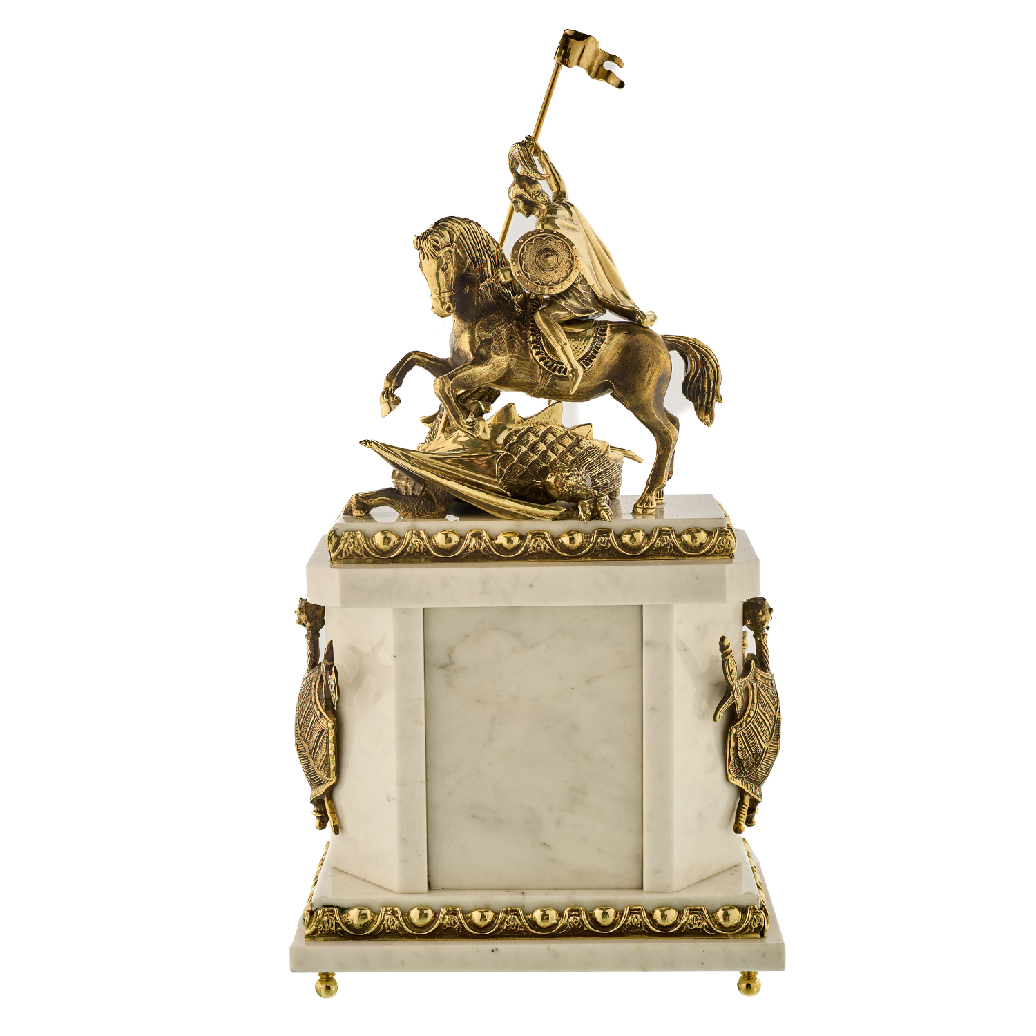 Часы каминные из малахита "Георгий Победоносец". Златоуст.Материалы: малахит, мрамор, бронза, золочение.
