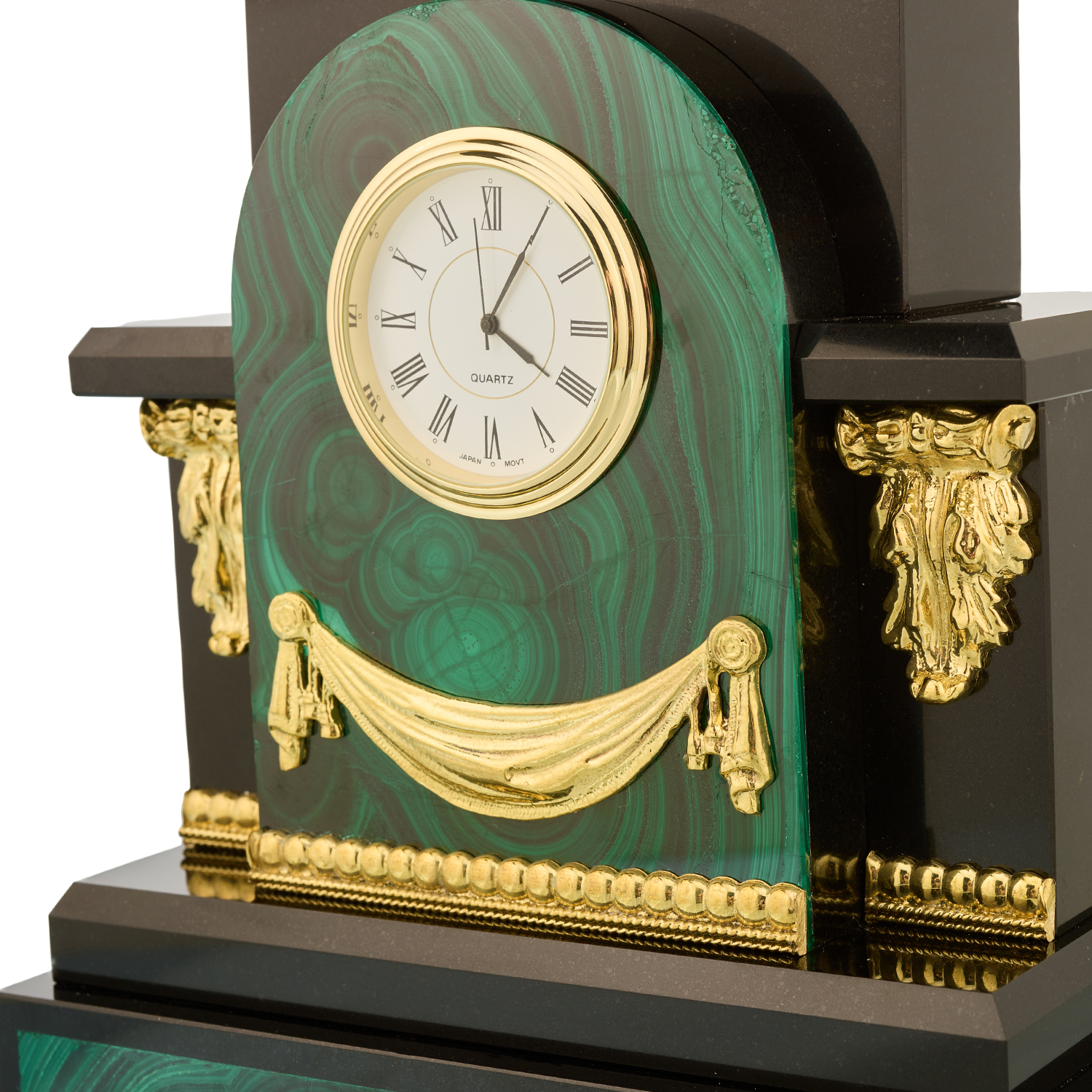 Русские подарки и сувениры → Интерьерные изделия → Часы → Лошадь Символ 2026 года. Часы настольные из малахита "Конь". Златоуст