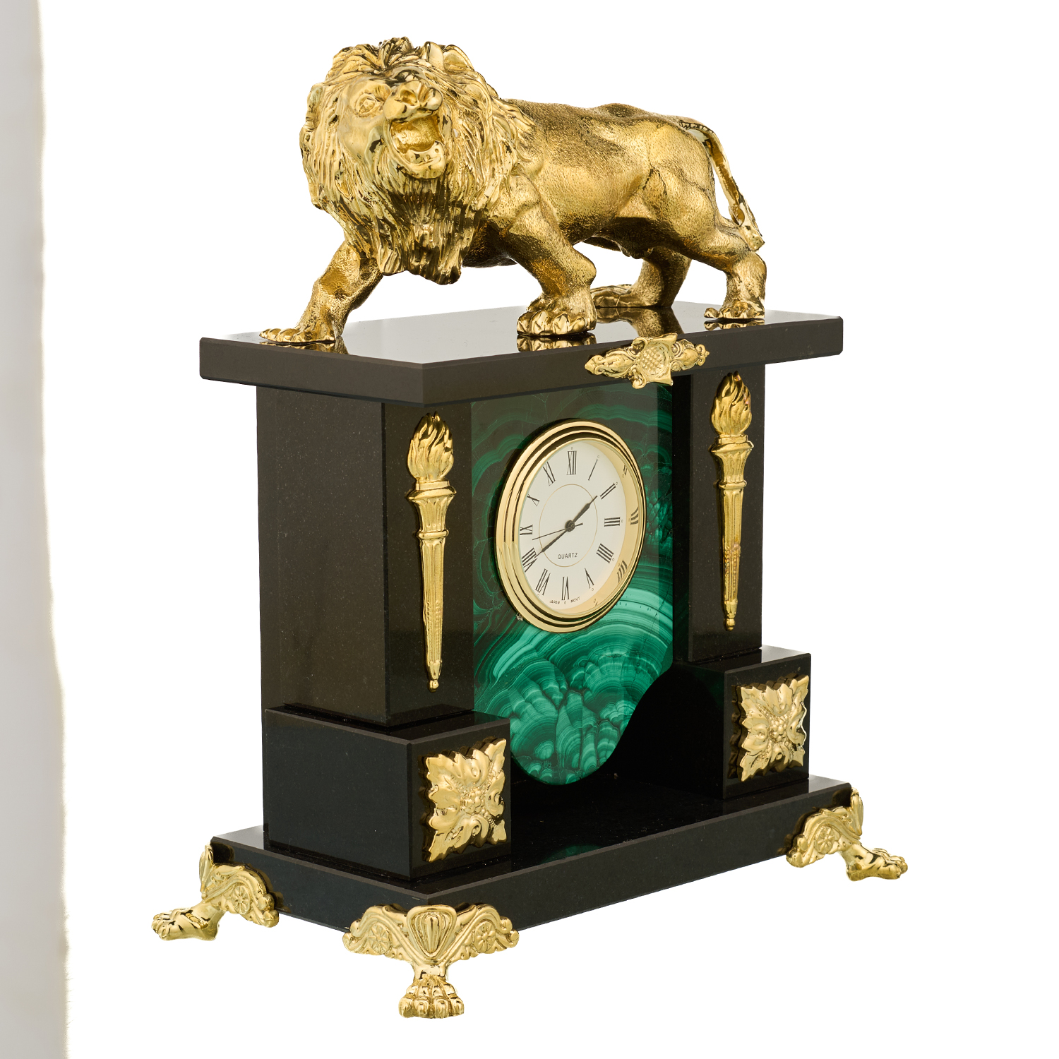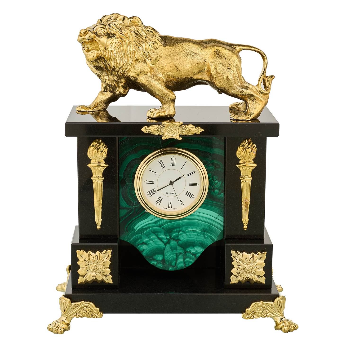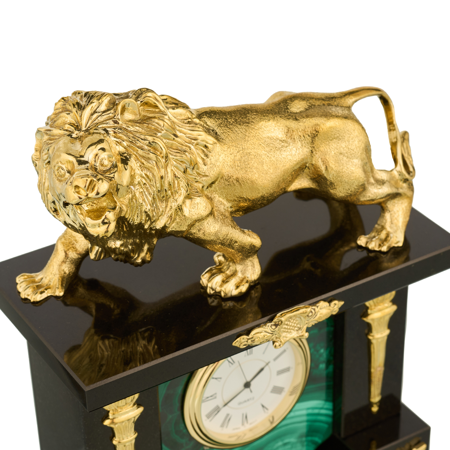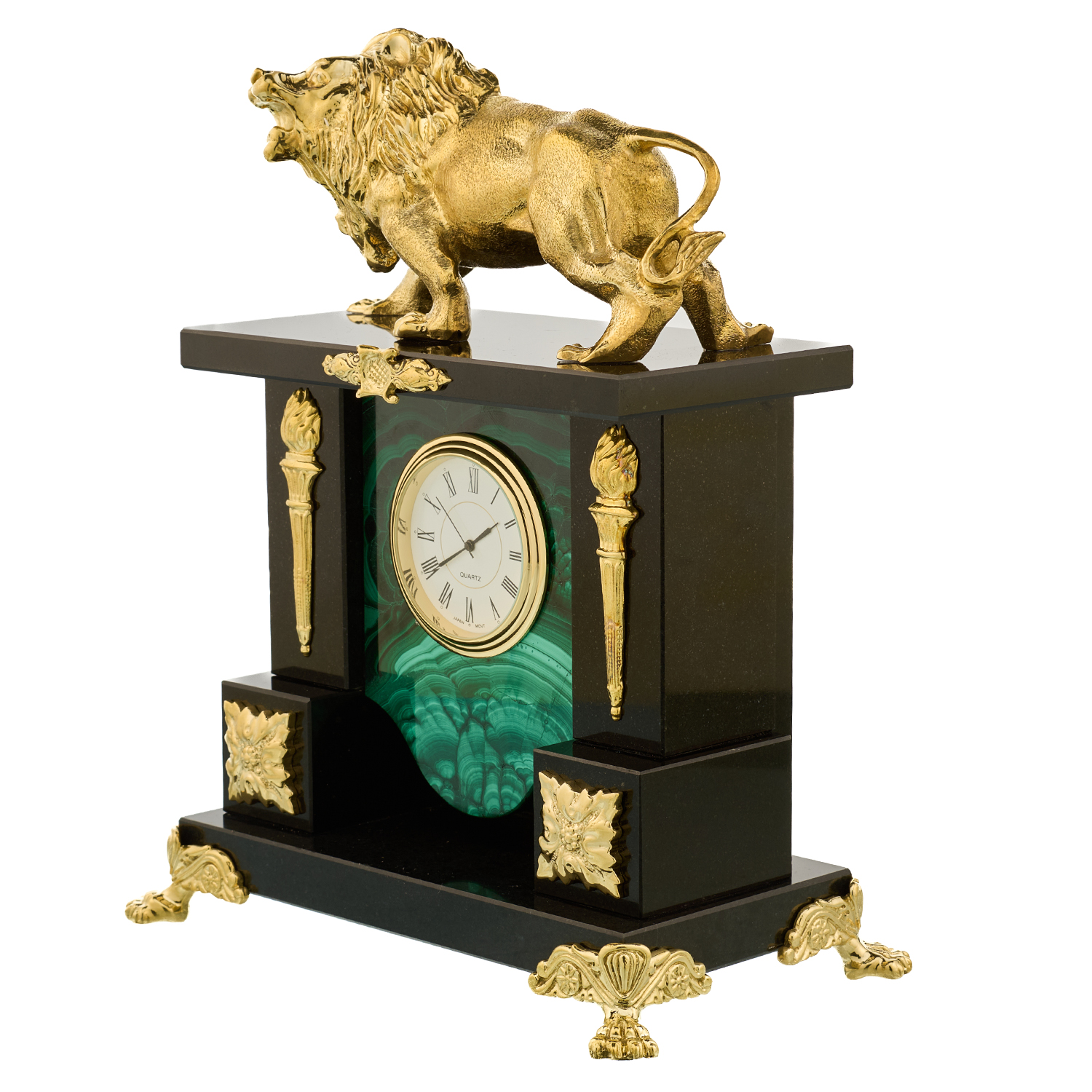 Часы из натурального камня "Лев". Златоуст.Материалы: малахит, бронза, позолота.