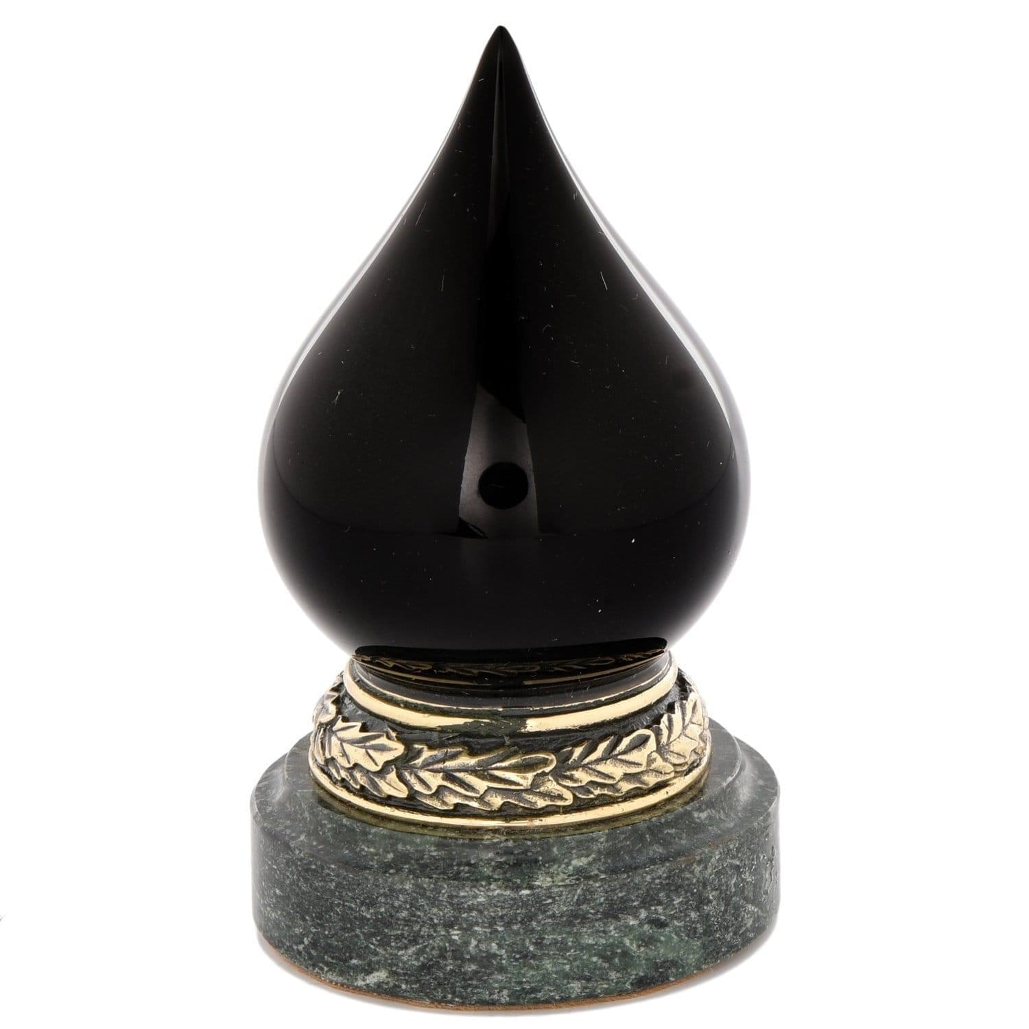 Большая чёрная капля - символ нефтегазовой отрасли России. Она станет символом должностного статуса. и символичный адресным подарком на профессиональный праздник, День газовика и нефтяника для сотрудника нефтегазовой отрасли. Авторская скульптура в виде капли нефти из оникса с часовым механизмом установлена на постамент-подставку из натурального камня, змеевика...