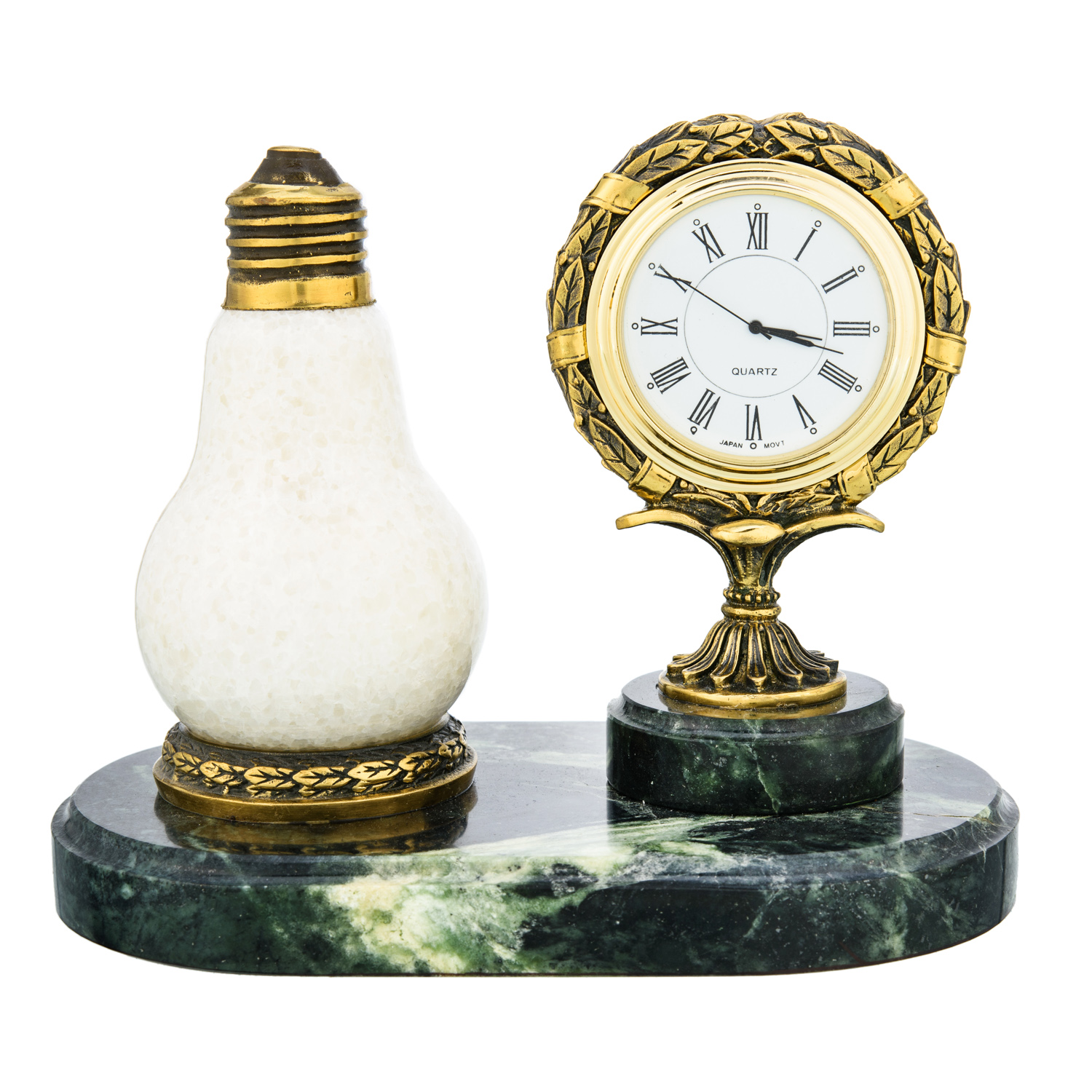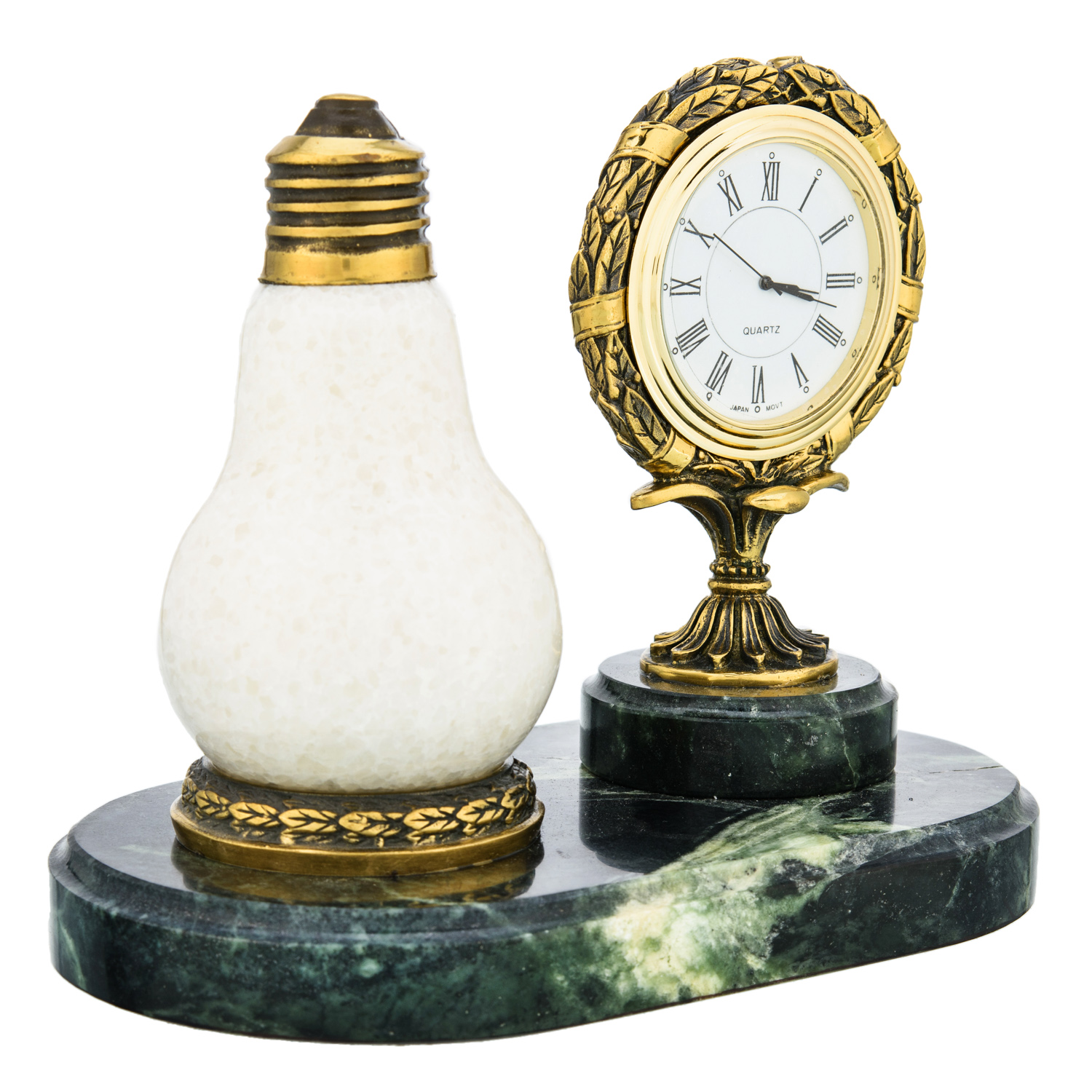 Настольные часы из камня с декоративной скульптурой в виде лампочки – оригинальный подарок энергетику к профессиональному празднику. Изделие придаст помещению особую атмосферу и подскажет хозяину точное время.