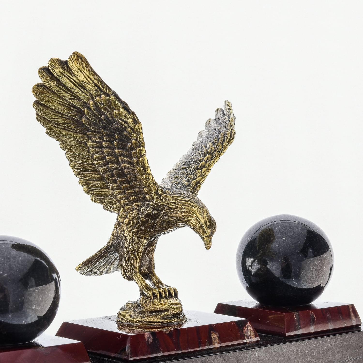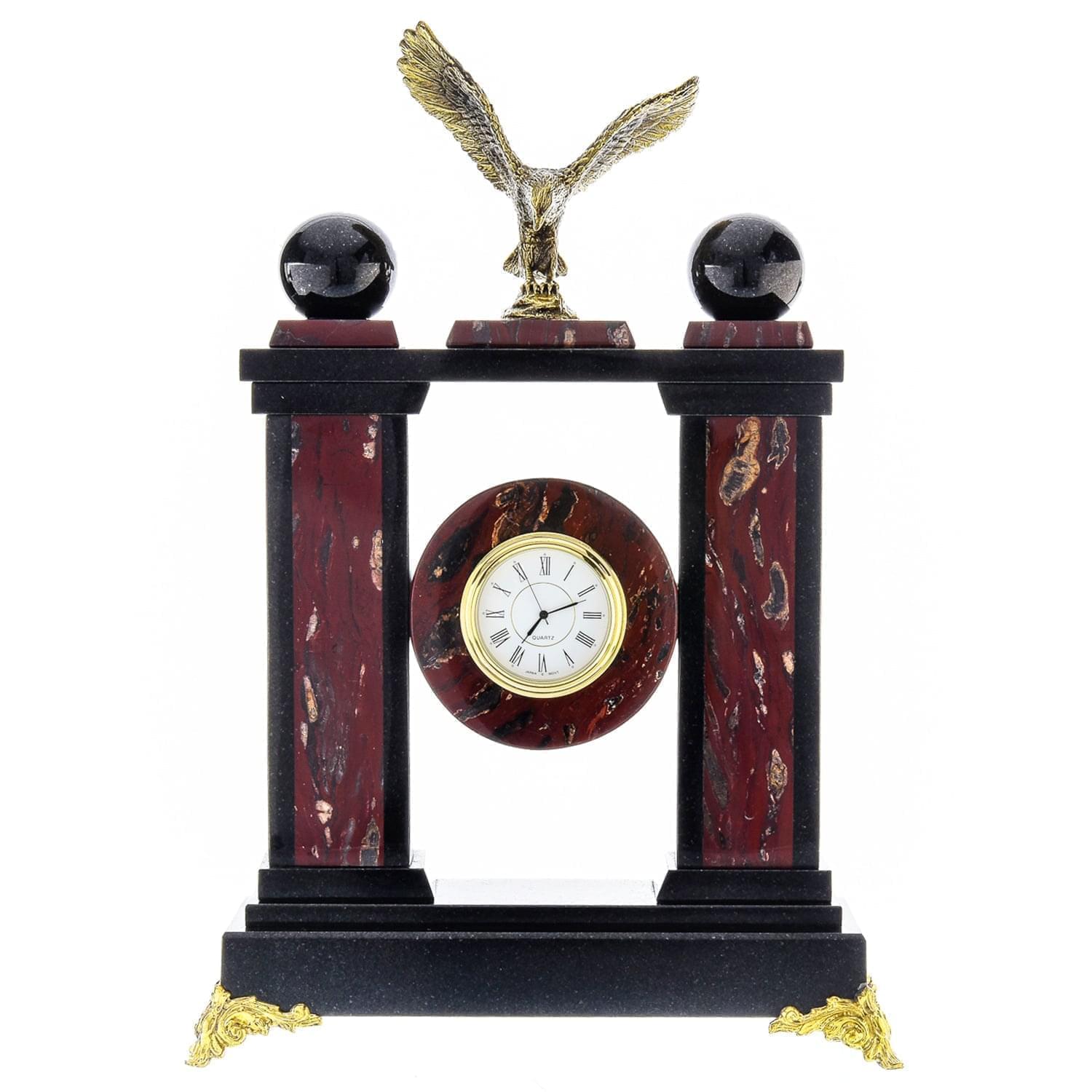 Эти авторские настольные часы украшены декоративными элементами и скульптурой орла, отлитыми  из бронзы по авторским эскизам и оформленными посредством позолоты. Они подойдут в качестве украшения как для кабинета, так и для гостиной и подчеркнет статус обладателя. Ручная работа художников по камню и металлу, часы "Орел" - это элегантный подарок на Юбилей, День рождения, профессиональный или другой общий праздник.
