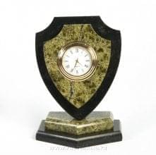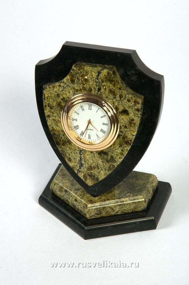 Эти дизайнерские часы в виде щита из натурального камня змеевика станут символом статуса делового человека и удачно впишутся в классический интерьер кабинет чиновника или бизнесмена. Щит - древний символ защиты,вывешенный щит - символ победы и обладания, брошенный - символ поражения. В щит вписан круглый циферблат в позолоченной оправе из латуни...Материал: змеевик .