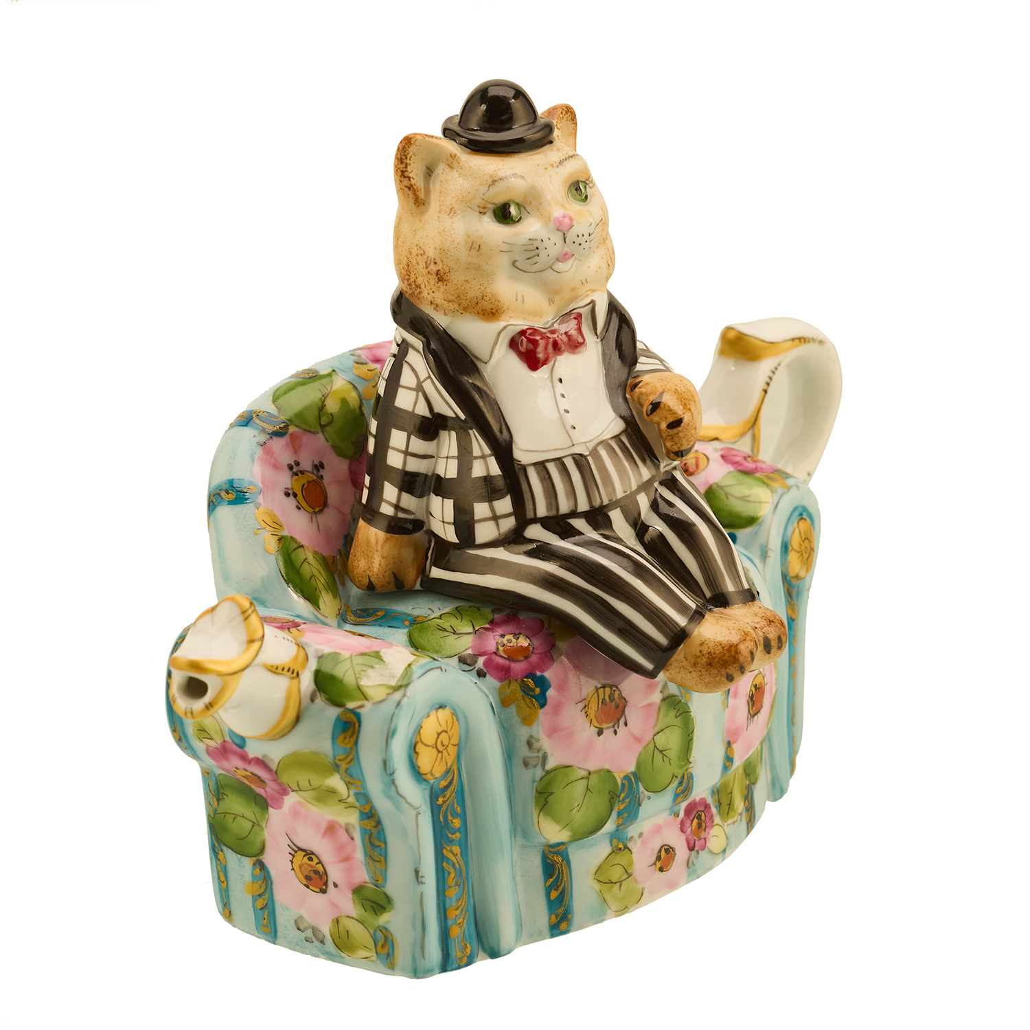 Чайник коллекционный "Кот на диване". Гжель в цвете.Материал: фарфор.