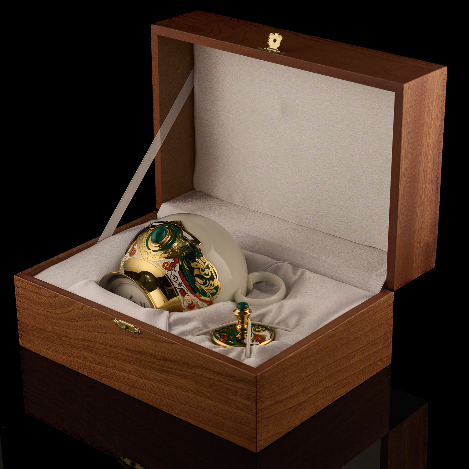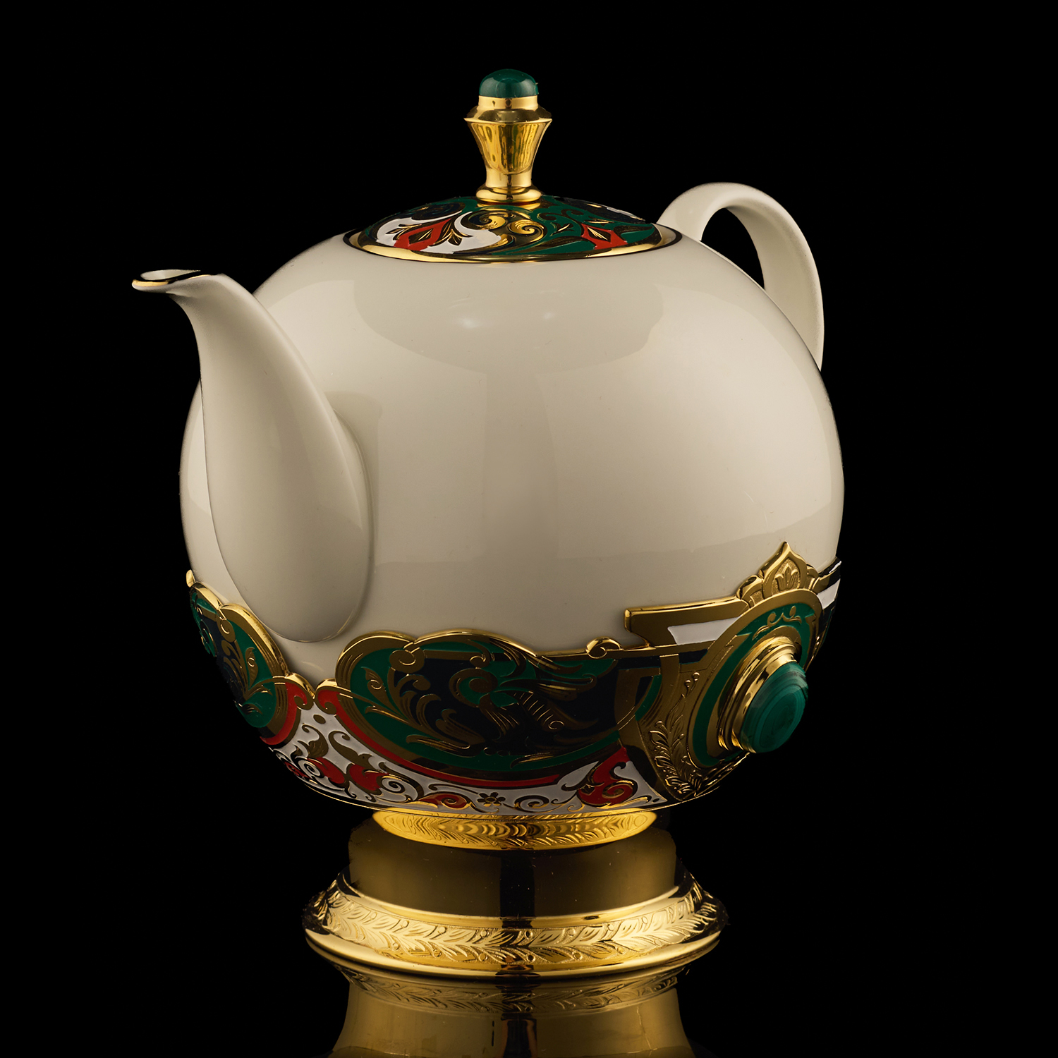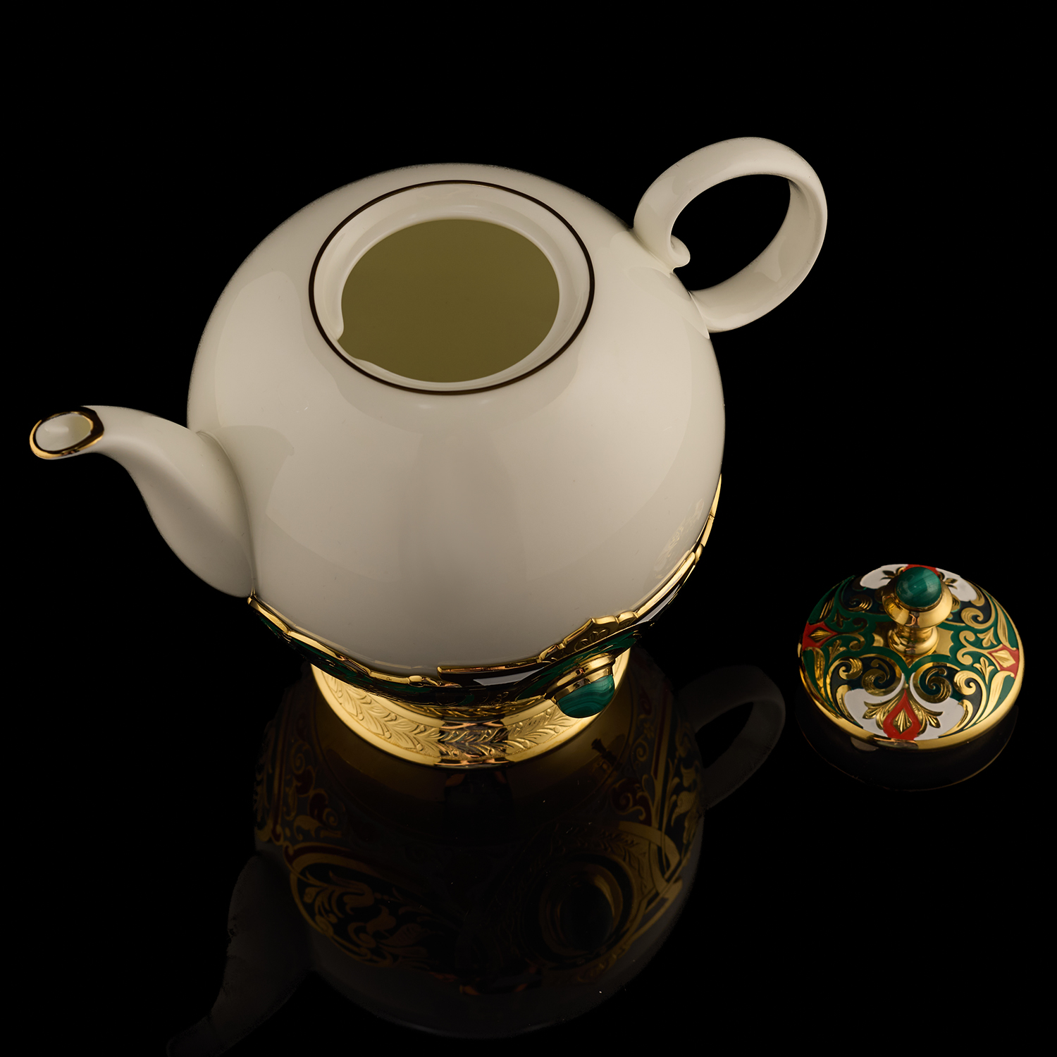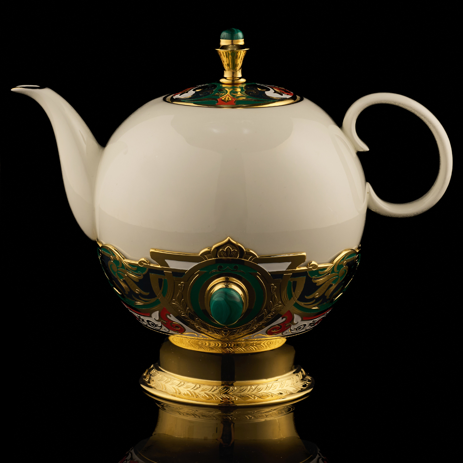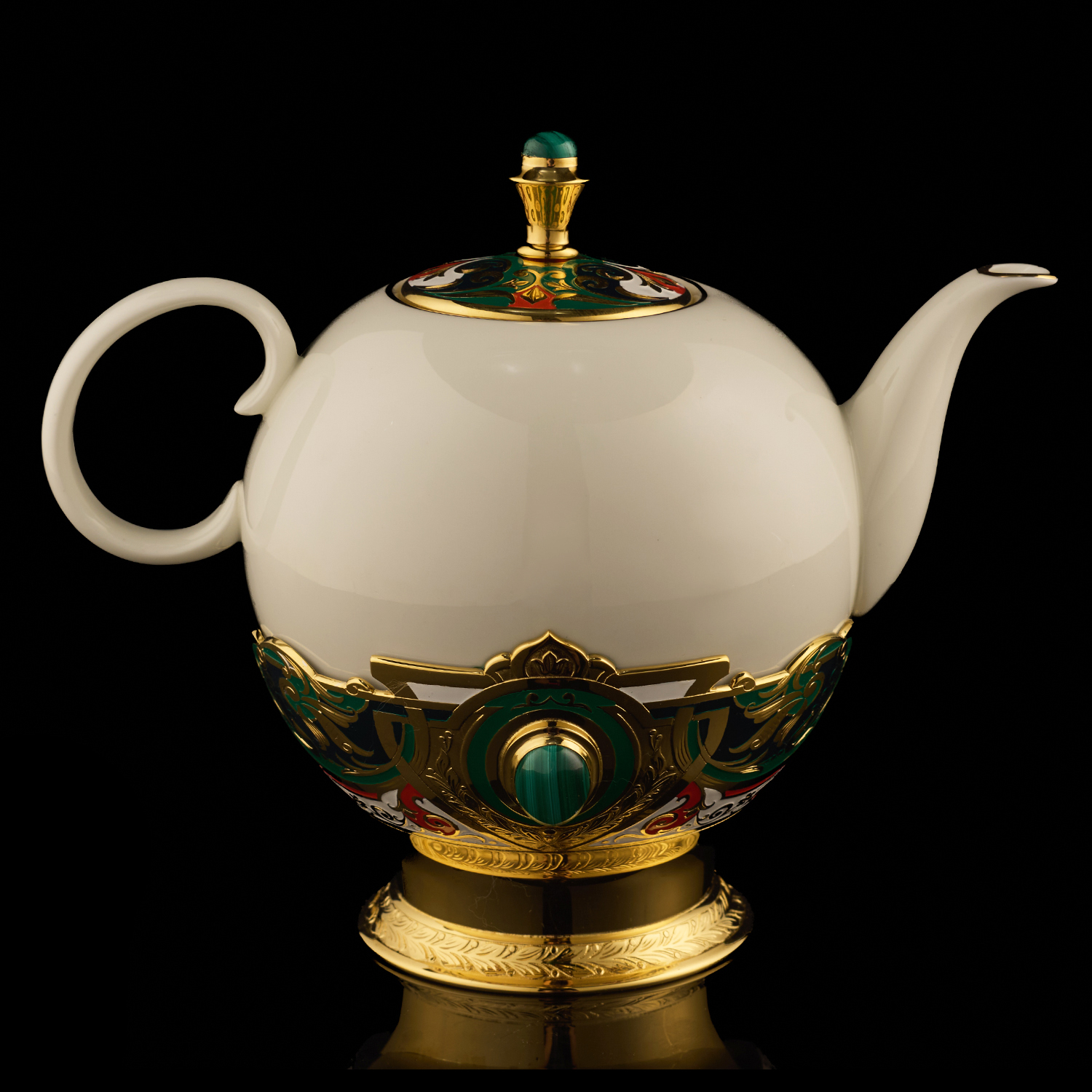 Чайник "Малахит". Златоуст.Материалы: латунь, никель, золото 999,9*, эмаль, малахит, фарфор.