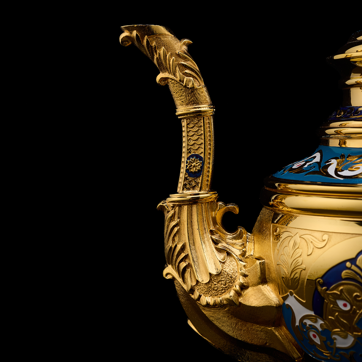 Чайник с лазуритом и эмалью "Гжель". Златоуст.Материалы: латунь, никель, золото 999,9*, эмаль, лазурит.