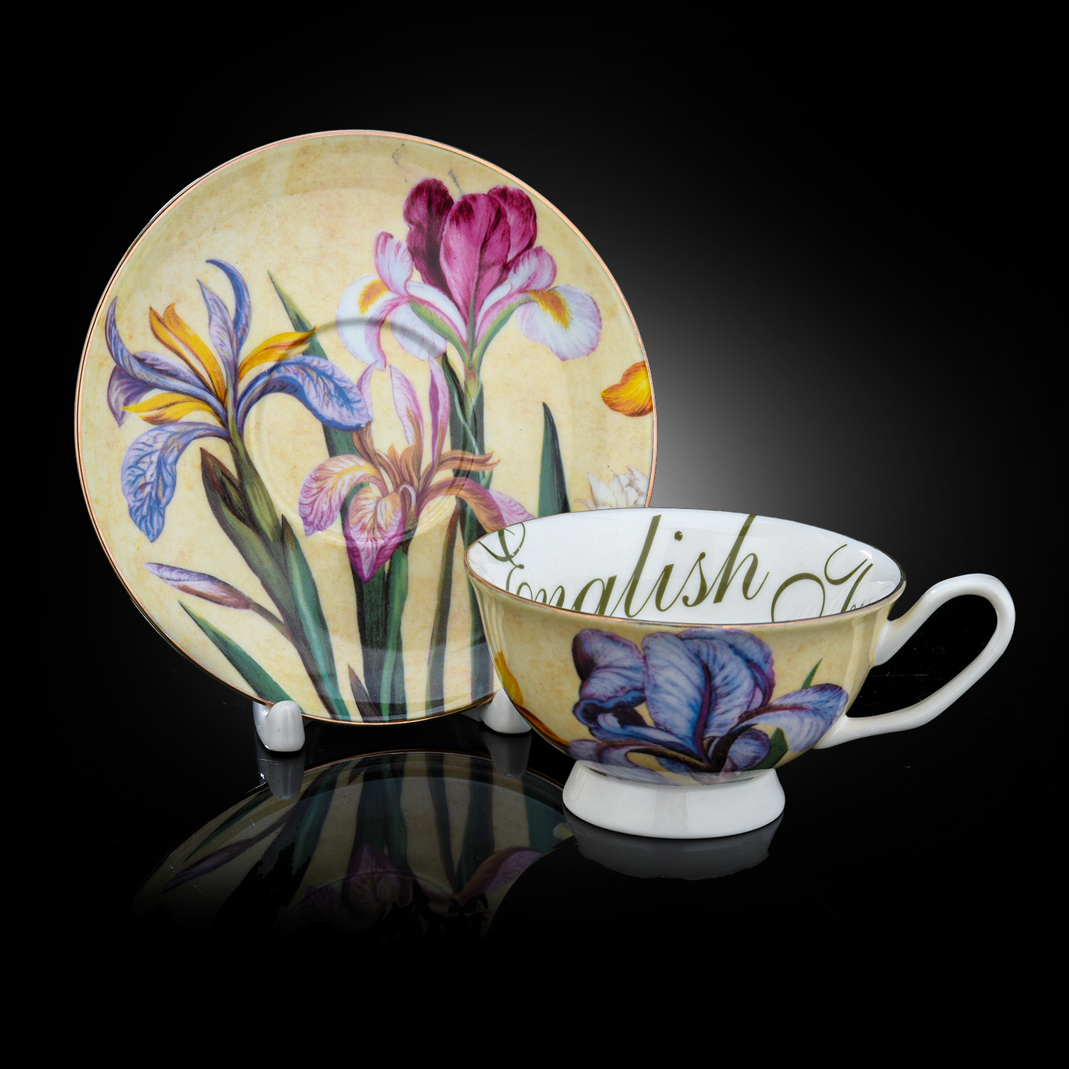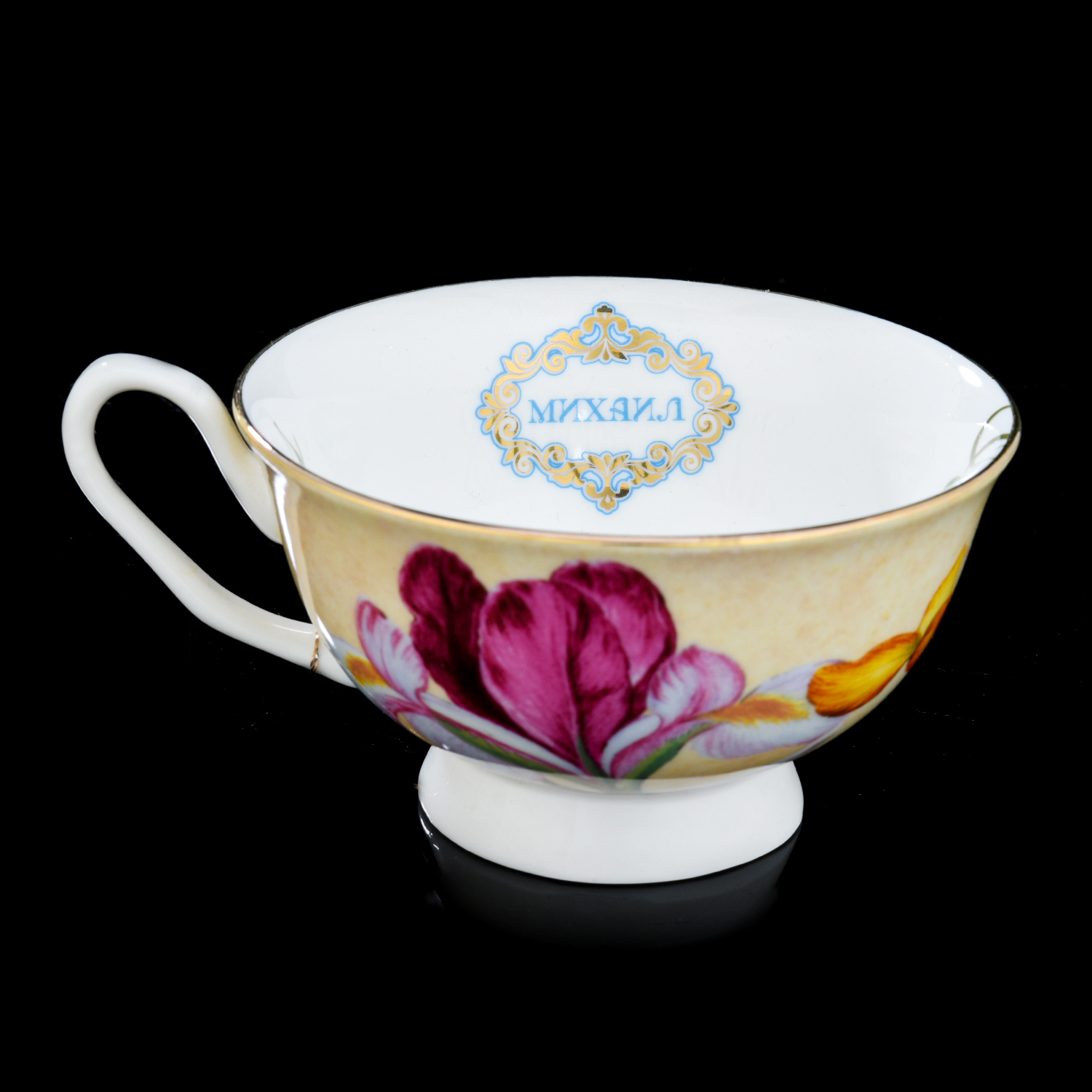 0029484-МИХАИЛ Фарфор костяной ЧАЙНАЯ ПАРА "Именная" (ИРИСЫ)