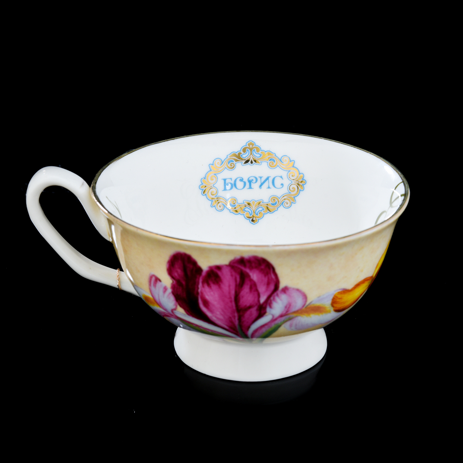 0029484-БОРИС Фарфор костяной ЧАЙНАЯ ПАРА "Именная" (ИРИСЫ)
