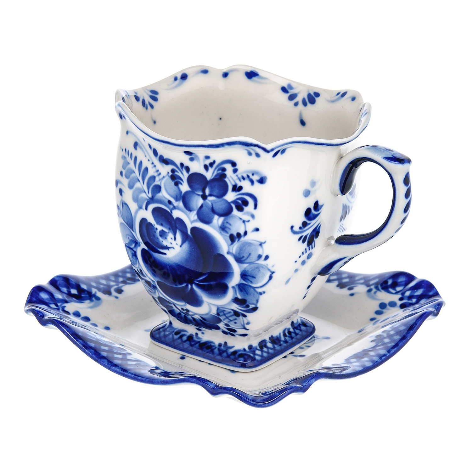 Что может быть лучше чаепития в компании близких или друзей? За чашечкой ароматного чая можно обсудить насущные проблемы, помечтать, вспомнить прошлое, построить планы на будущее. Узор создал мастер гжельского фарфора, художник Сергей Алехин, фирменный стиль которого узнаваем по очаровательной голубой «волне» по краю изделия. Русский народный промысел называется Гжель от села в Московской области, где он зародился. Там с 17 века добывалась качественная глина. В 1663 году царь Алексей Михайлович издал указ о ее добыче для изготовления медицинских сосудов. С 18 века здесь делали посуду, кирпич, детские игрушки, кувшины, майоликовую пластику, расписные печные и каминные изразцы. Расписывали изделия синими, зелеными, желтыми цветами в коричневых контурах, фигурками животных или людей. Ручки кувшинов напоминали веточки, носики - птичьи головы по форме. С 1820-х годов гжельскую роспись характеризовал синий узор.