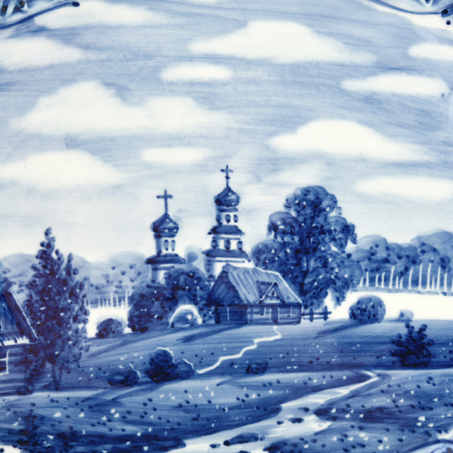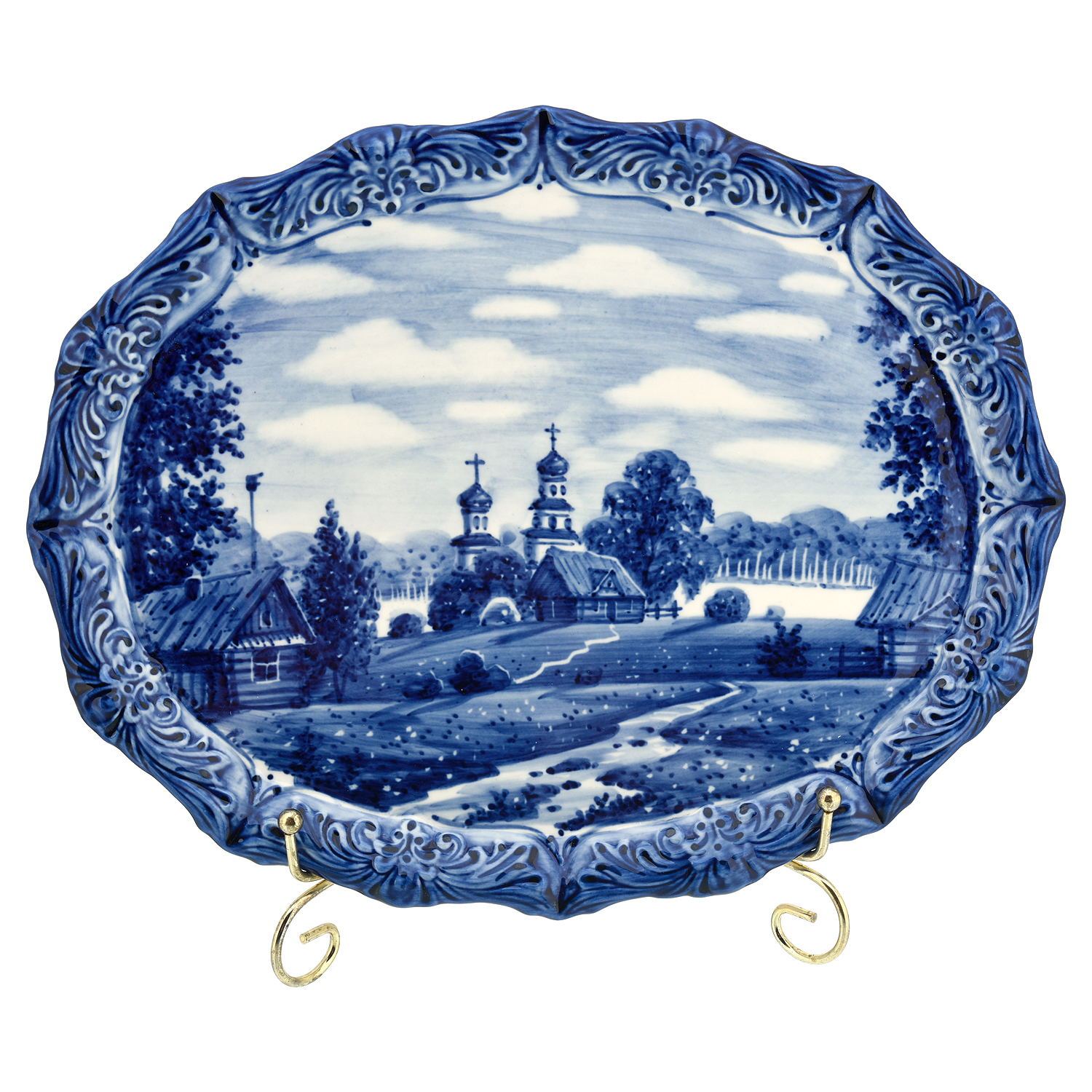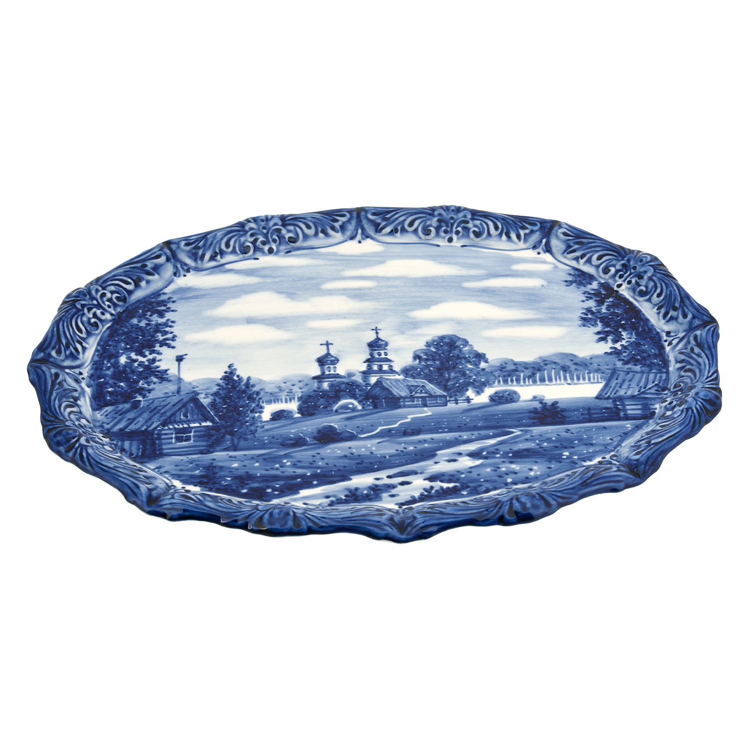 Русские подарки и сувениры → Интерьерные изделия → Декоративные тарелки → Тарелка декоративная "Лето в деревне". Гжель