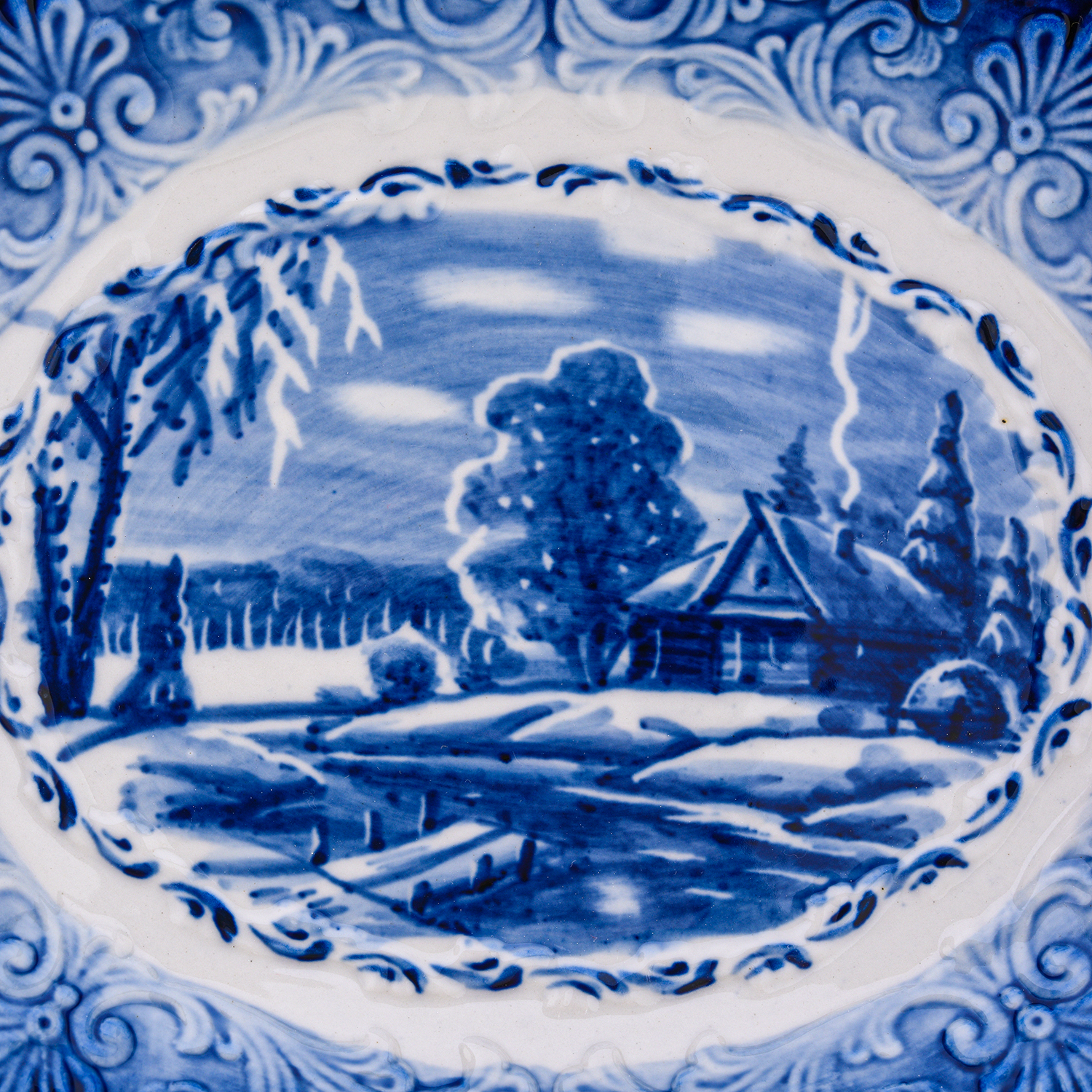 Тарелка декоративная "Зима в деревне". Гжель.Материал: фарфор.