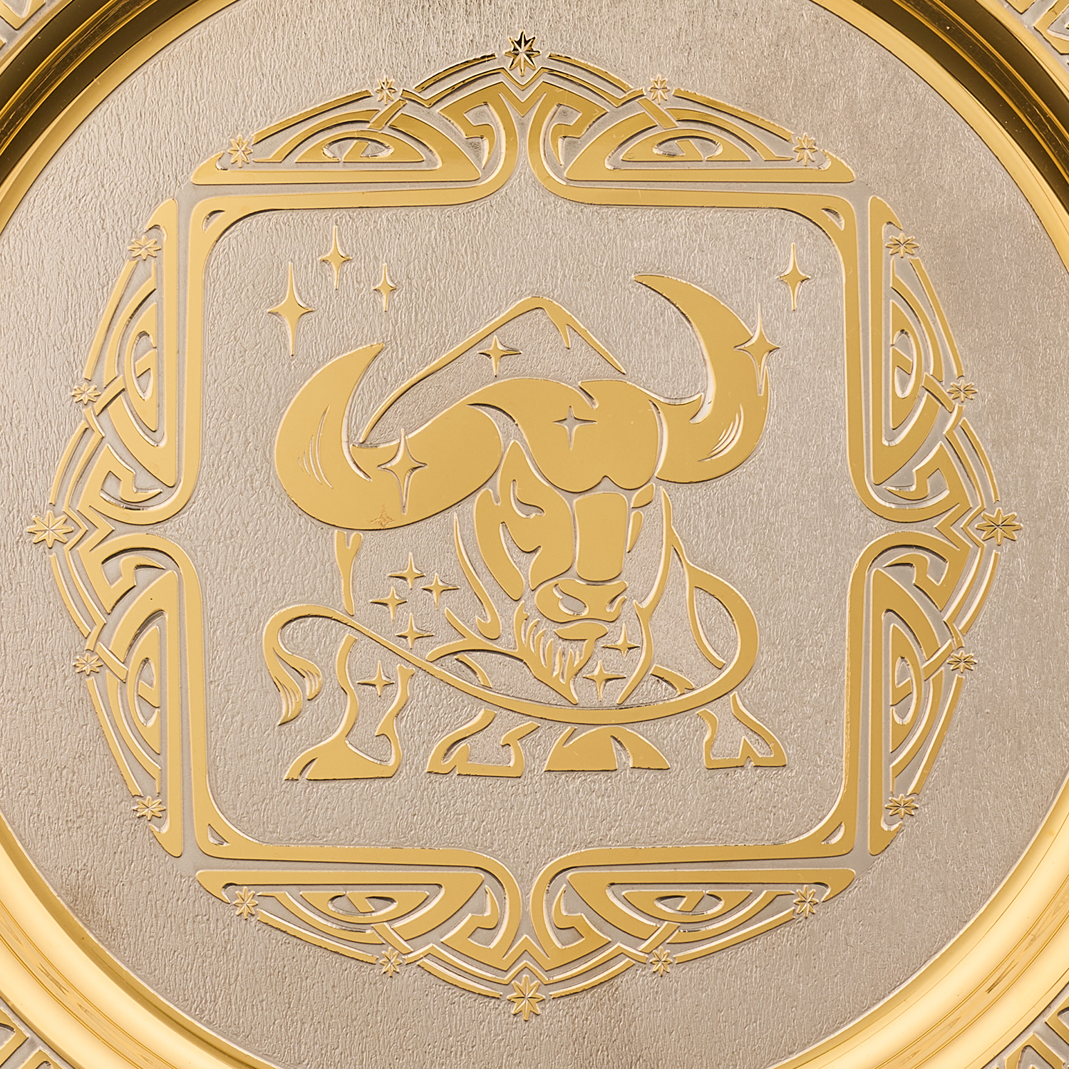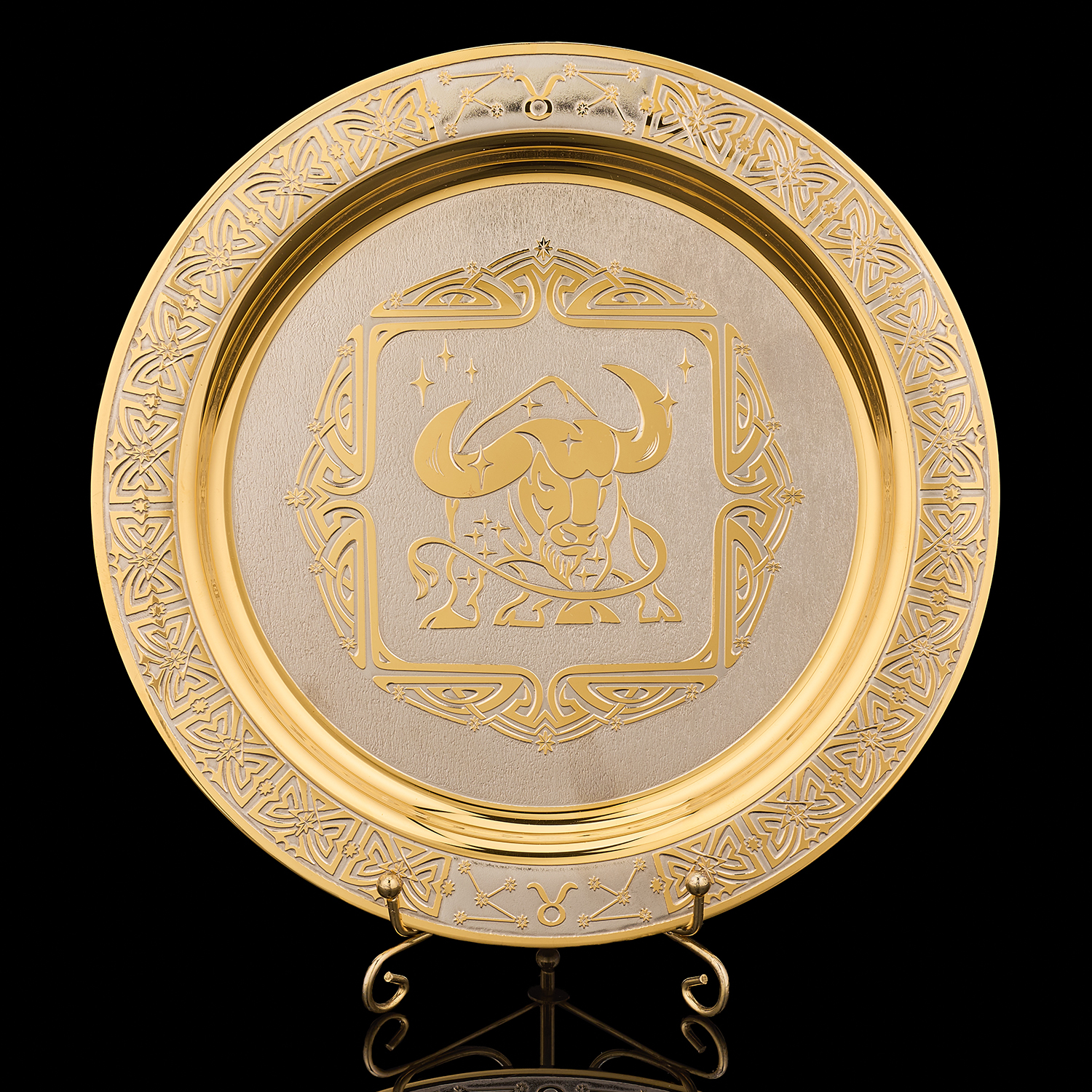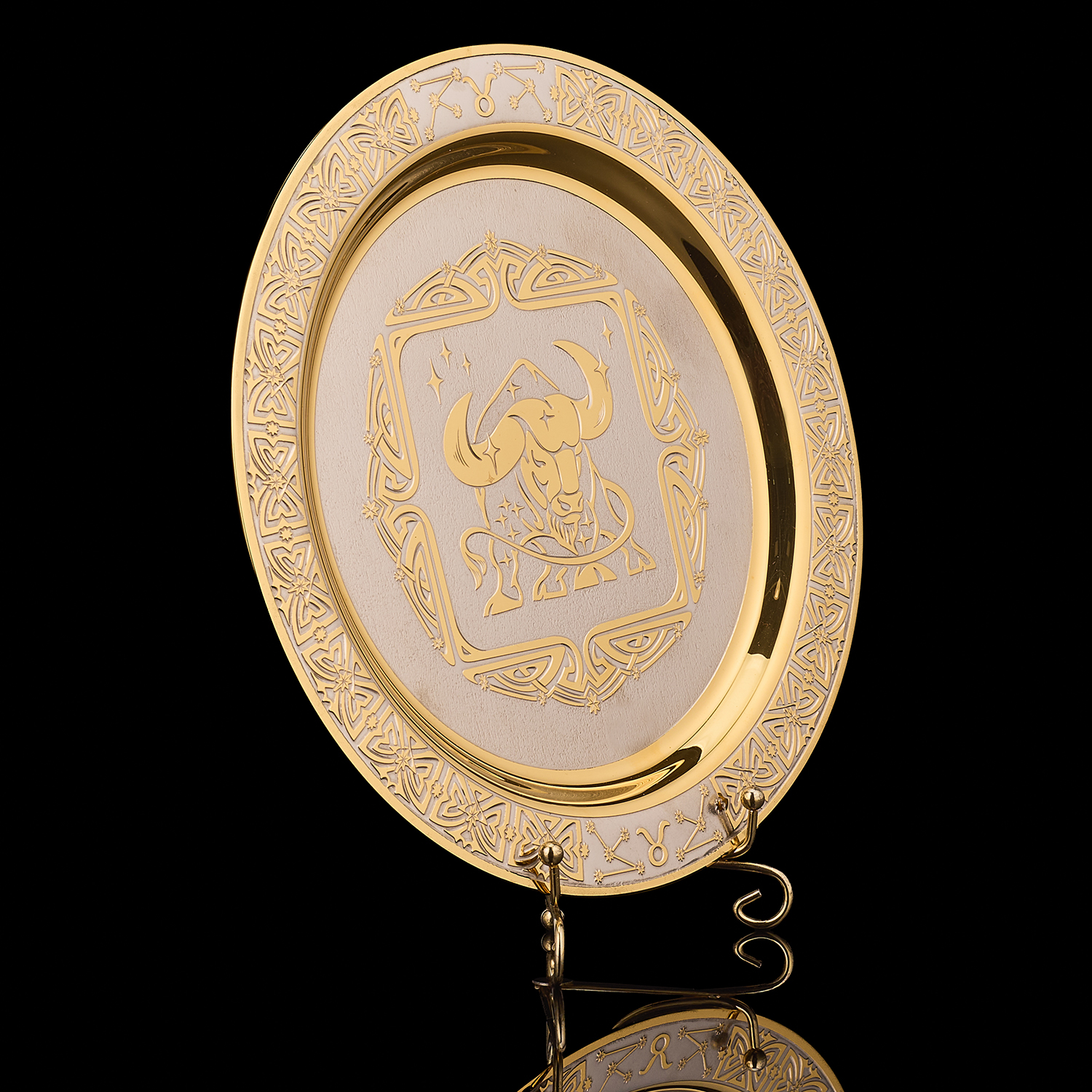 Русские подарки и сувениры → Интерьерные изделия → Декоративные тарелки → Тарелка декоративная с позолотой "Знак зодиака Телец". Златоуст