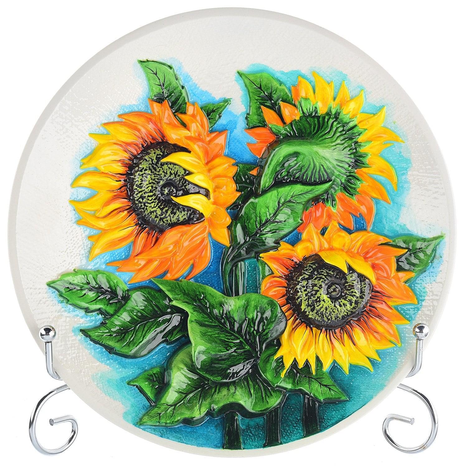 Немного ярких ноток достаточно, чтобы интерьер зазвучал!Цветы Солнца, подсолнухи изображены кистью на керамической поверхности. Особенность этой декоративной тарелки в том, что изображение дополнено рельефом. Натюрморт в формате барельефа представлен на лицевой стороне декоративной тарелки с плоским корпусом среднего диаметра.