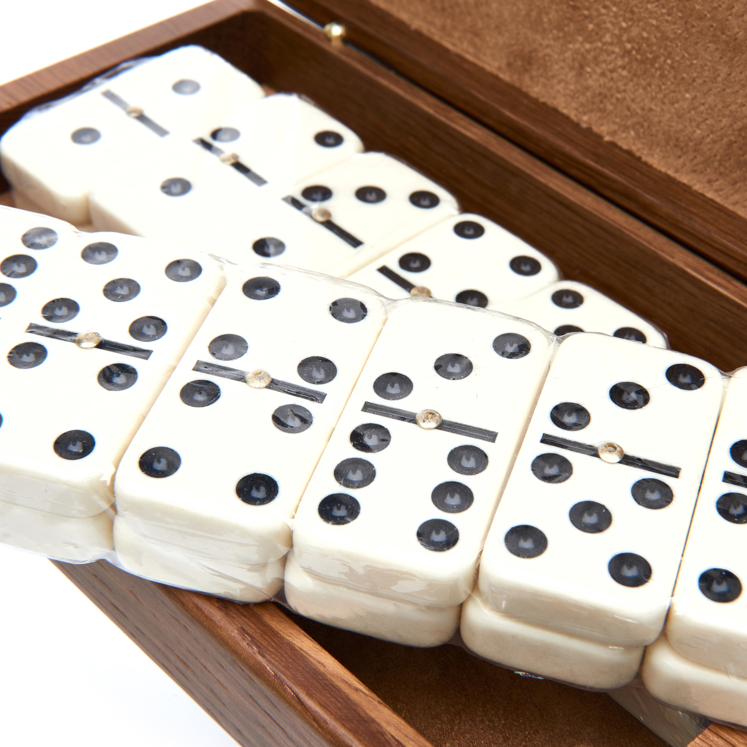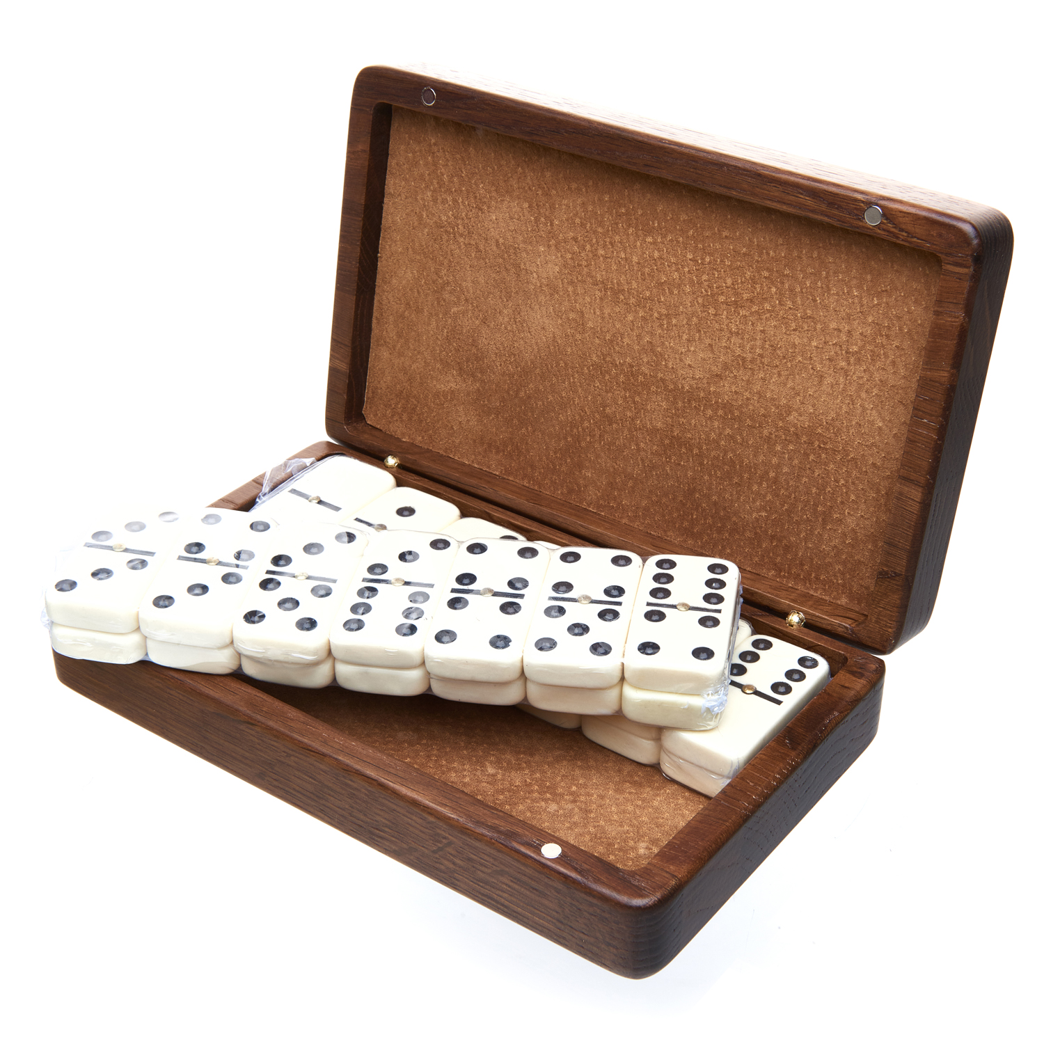 0053585 Домино D6 в резной дубовой шкатулке "ОХОТНИКИ НА ПРИВАЛЕ" RTD-306.M