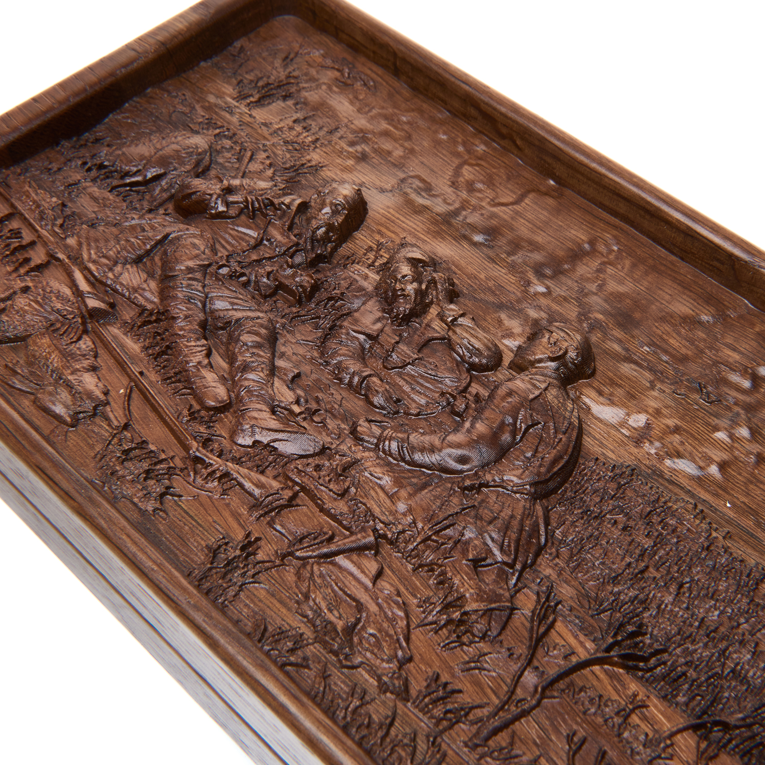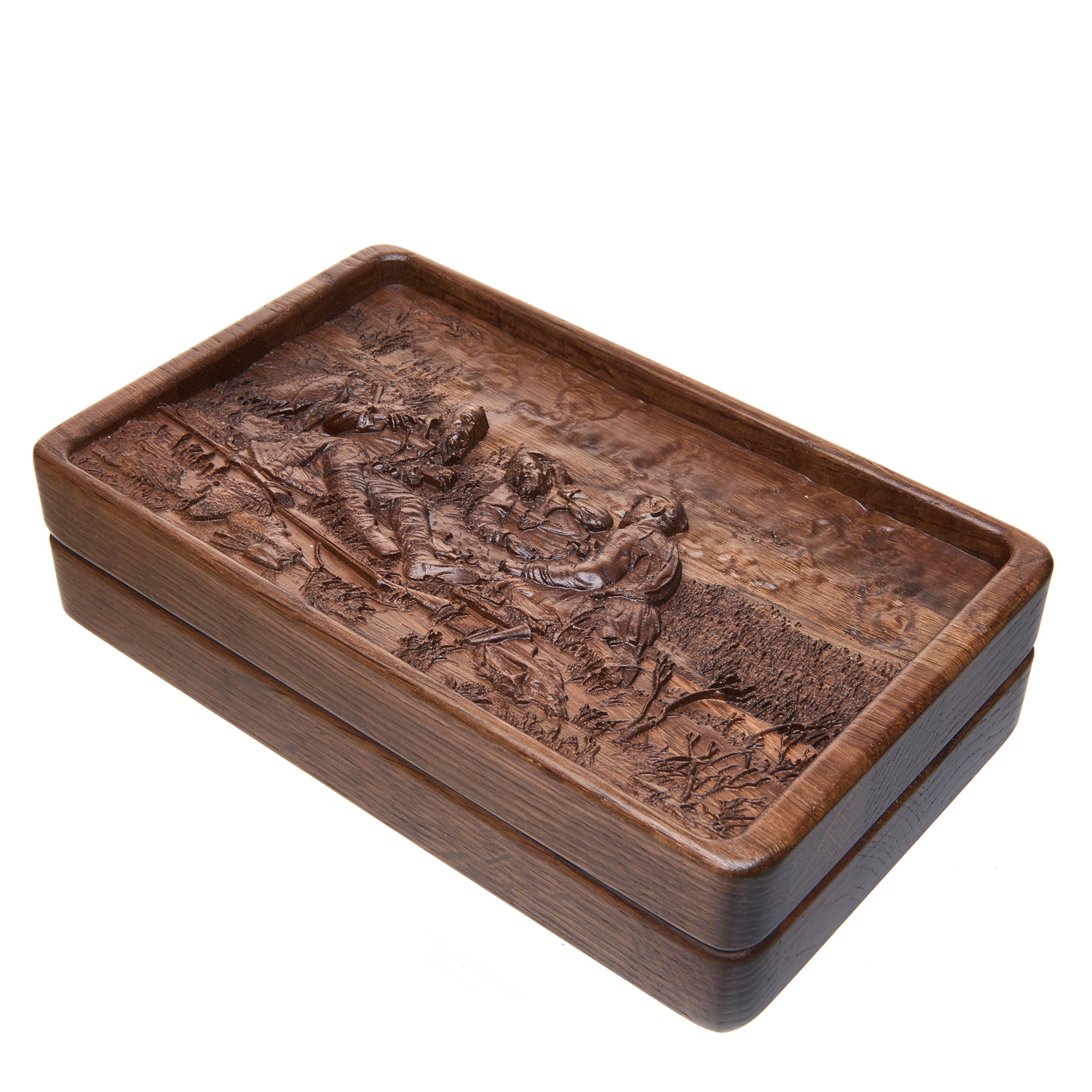 Русские подарки и сувениры → Настольные игры → Домино → 0053585 Домино D6 в резной дубовой шкатулке "ОХОТНИКИ НА ПРИВАЛЕ" RTD-306.M