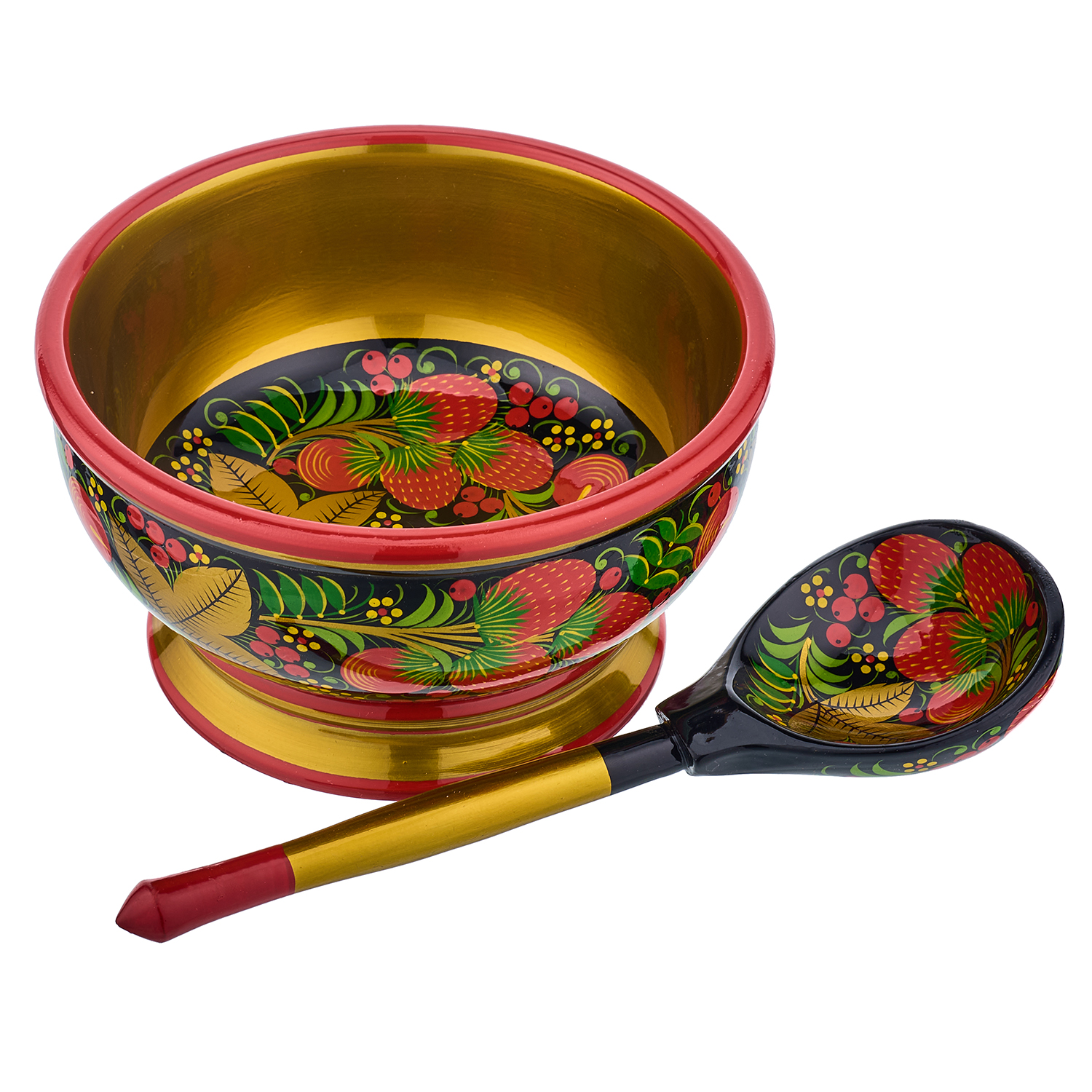 Русские подарки и сувениры → Посуда → Другое → Набор деревянной посуды для супа "Мимоза-Клубника" с росписью. Хохлома