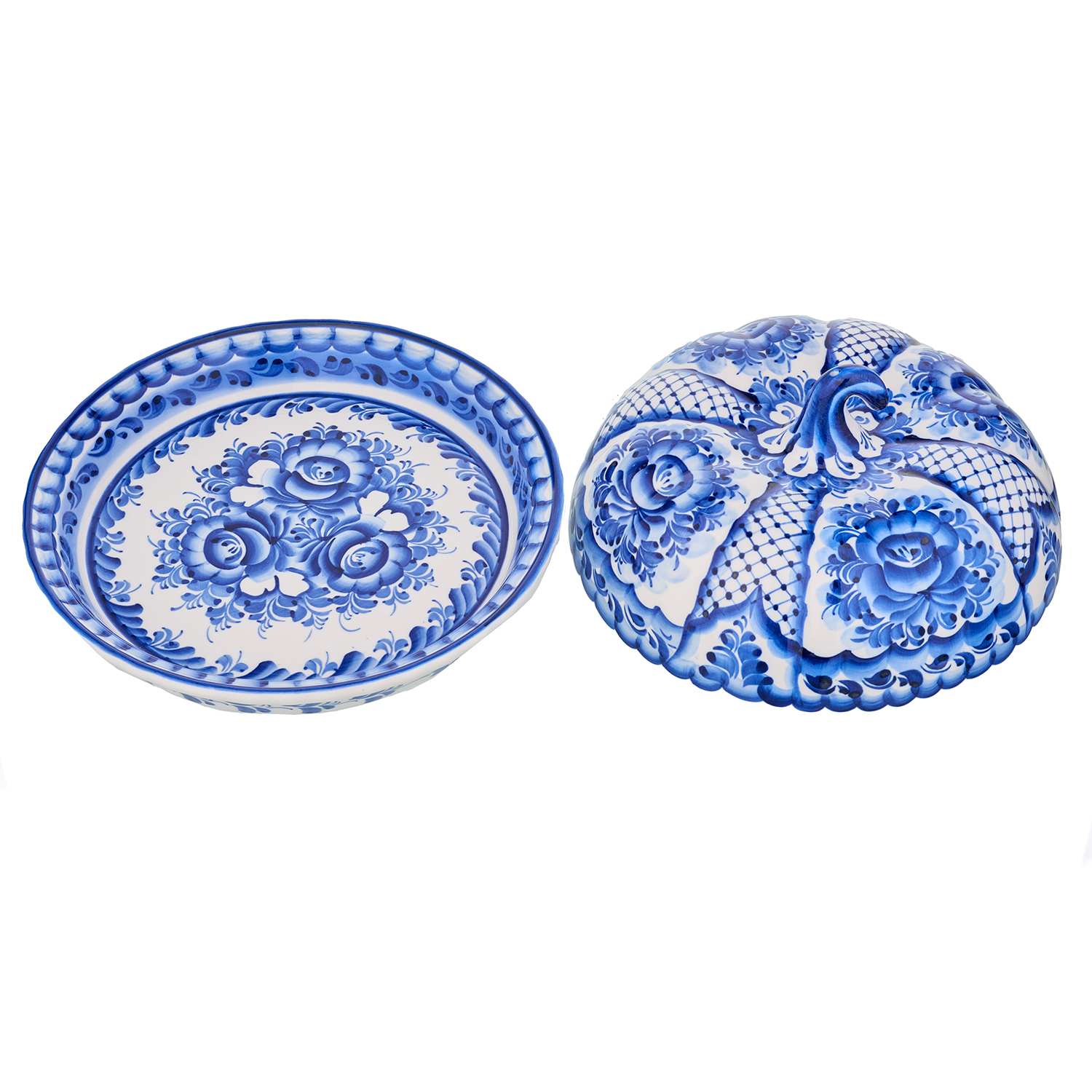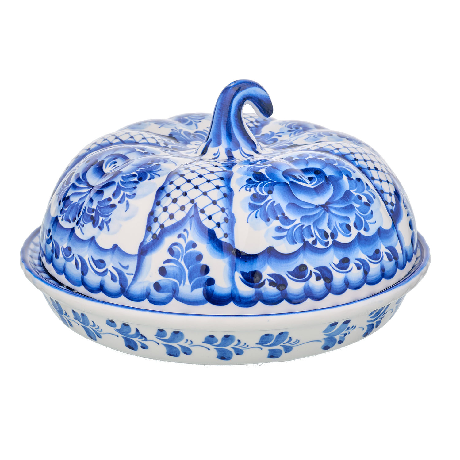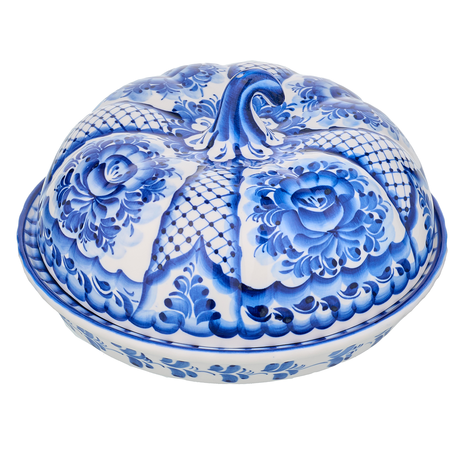 Блинница фарфоровая с росписью "Тыква". Гжель.Размер: 225х225х130 мм