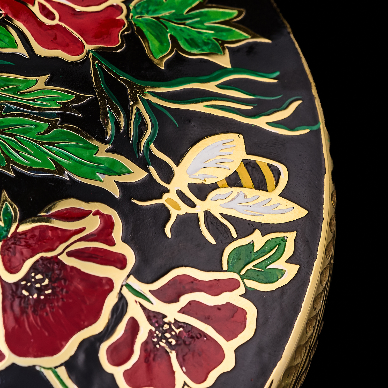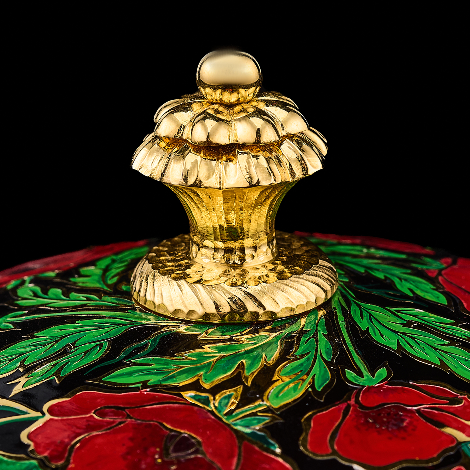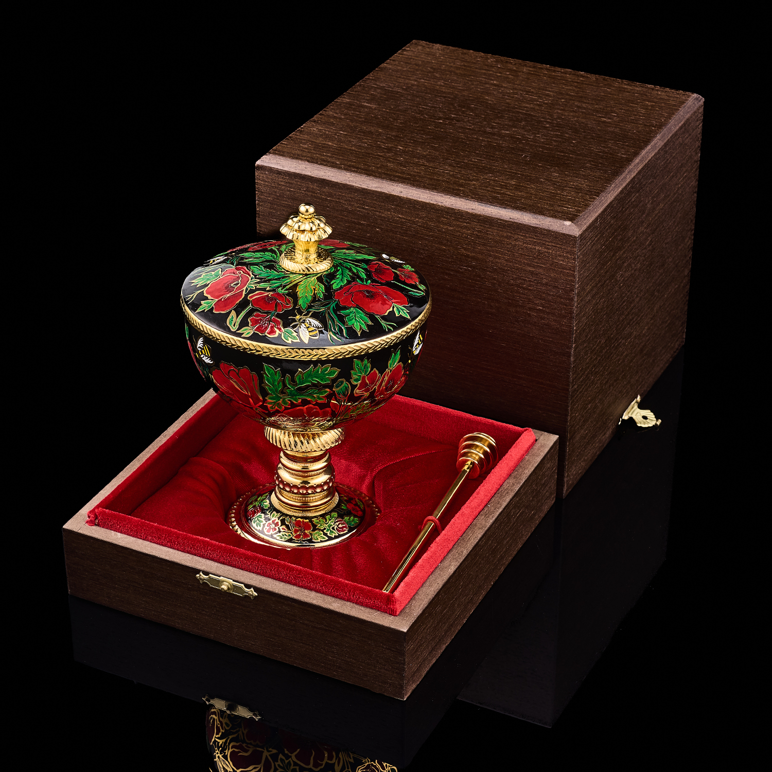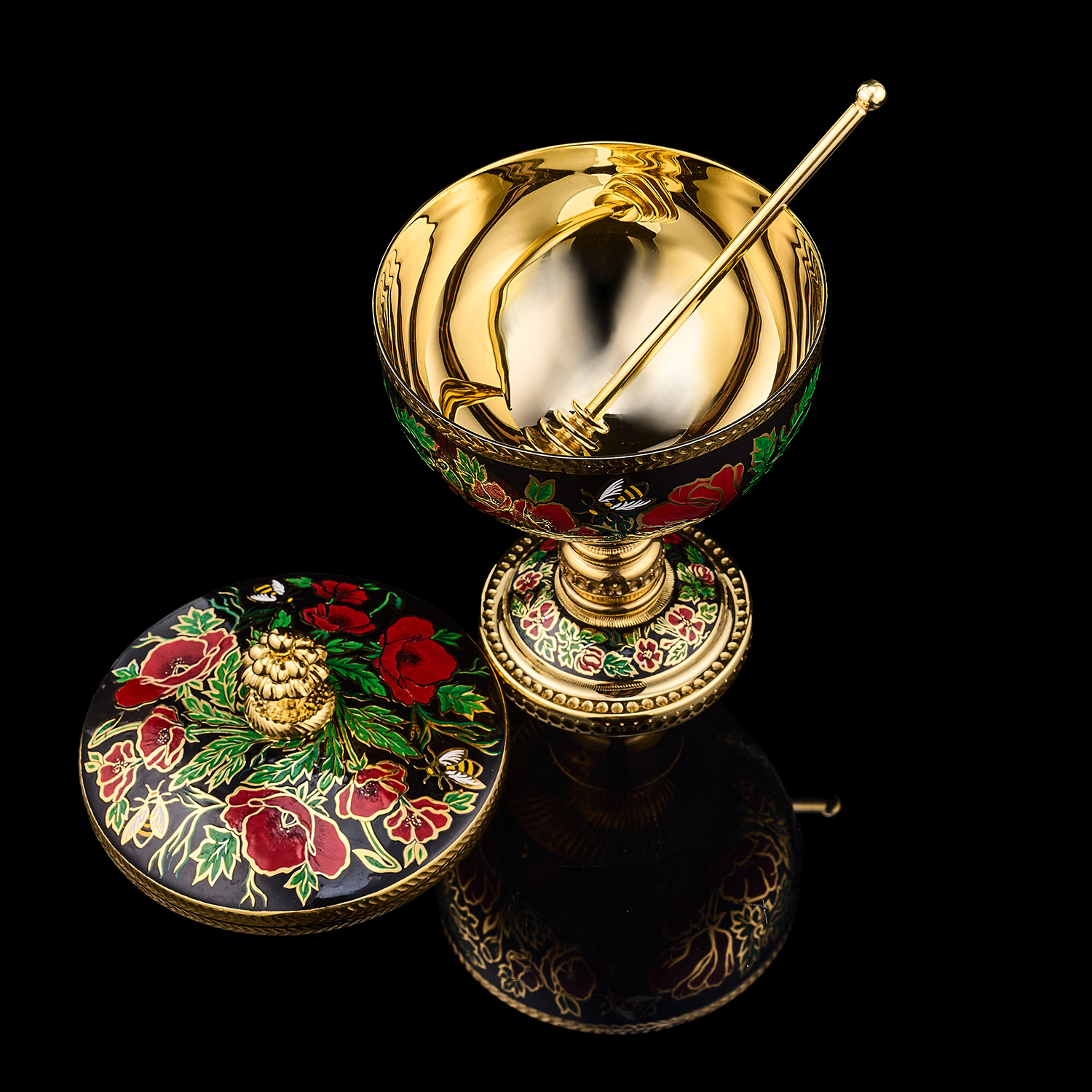 Медовница с позолотой и эмалью "Маки". Златоуст.Материалы: латунь, золото 999,9*, эмаль.