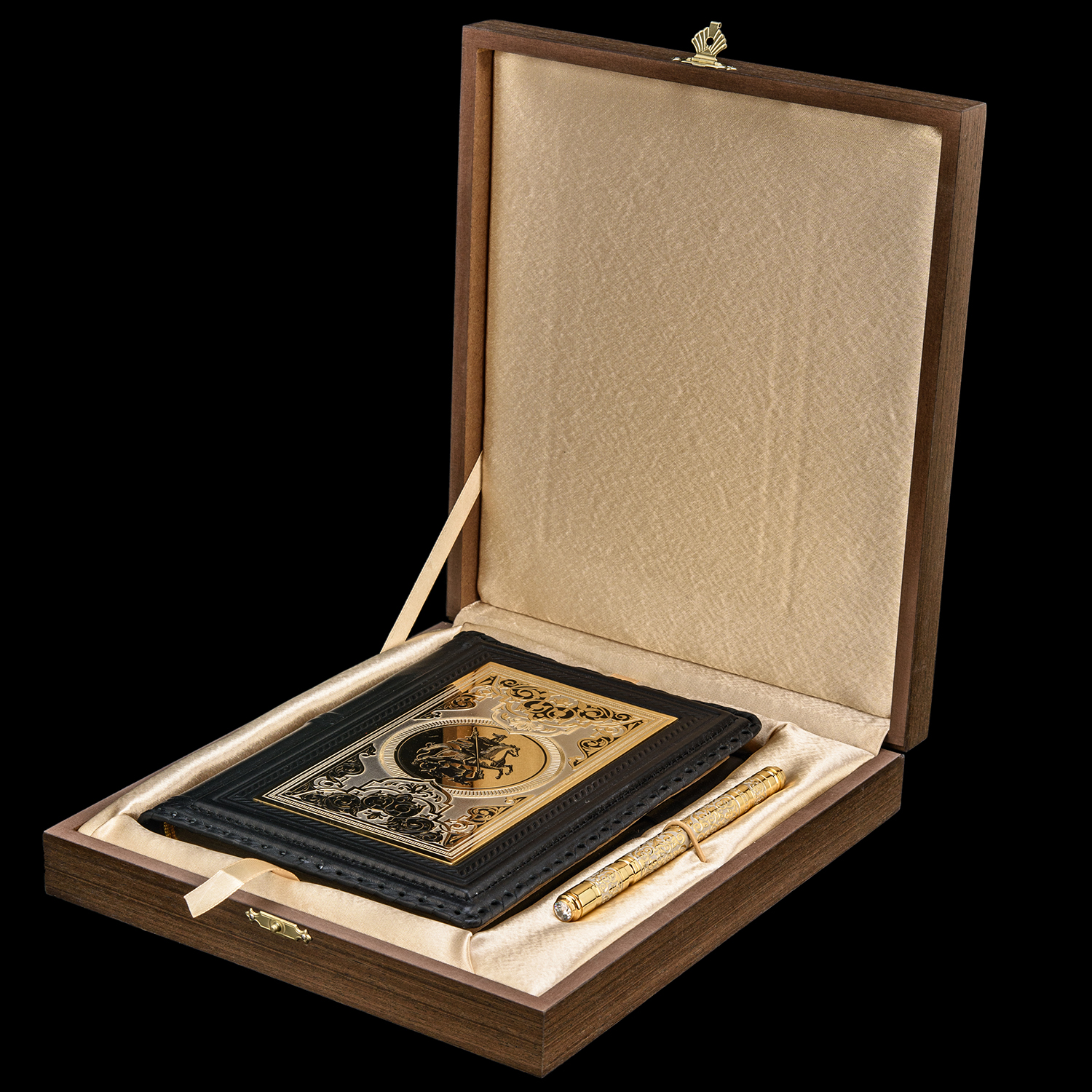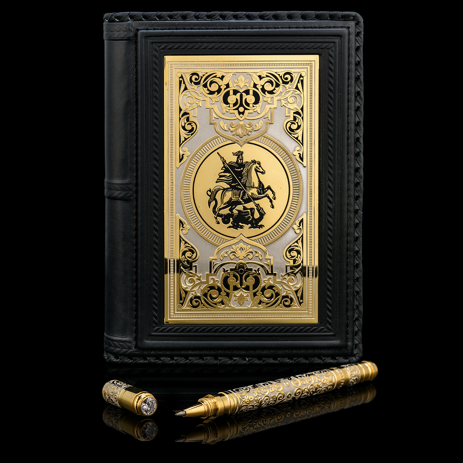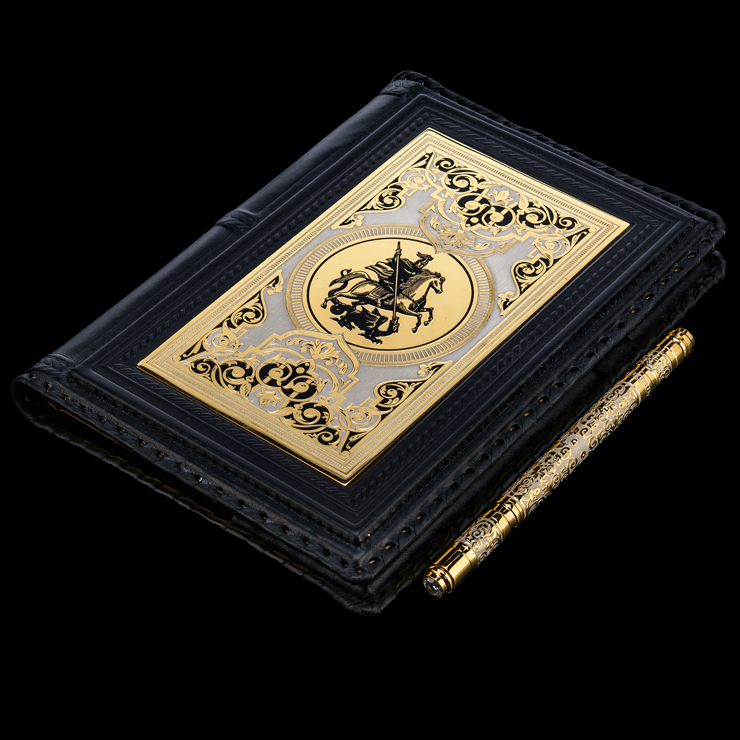 Ежедневник с ручкой "Георгий Победоносец". Златоуст.Материалы: латунь, никель, золото 999,9*, эмаль, кожа.