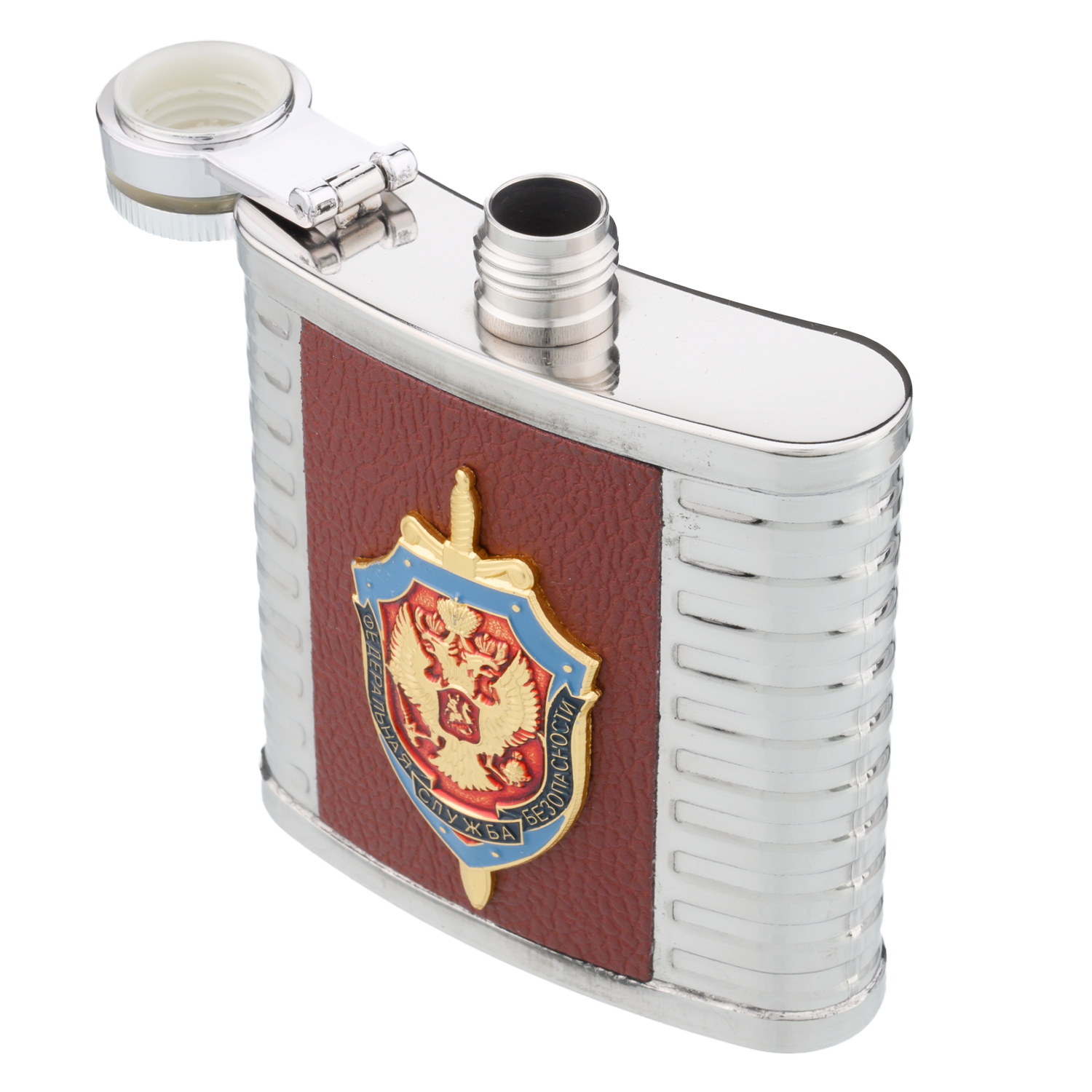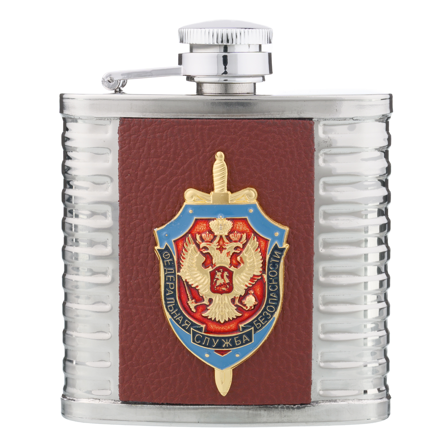 Фляга сувенирная с символикой "ФСБ".Материалы: нержавеющая сталь, латунь, эмаль, кожа.
