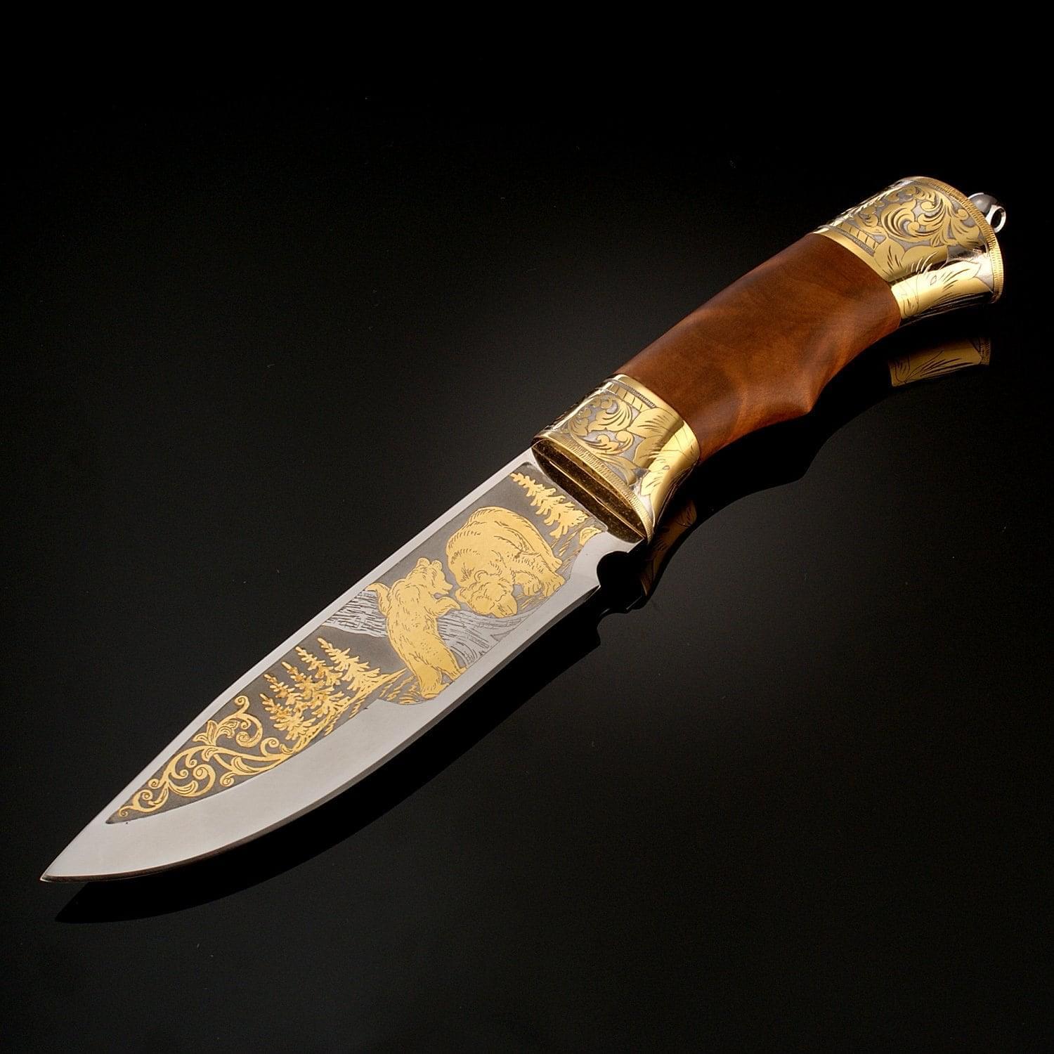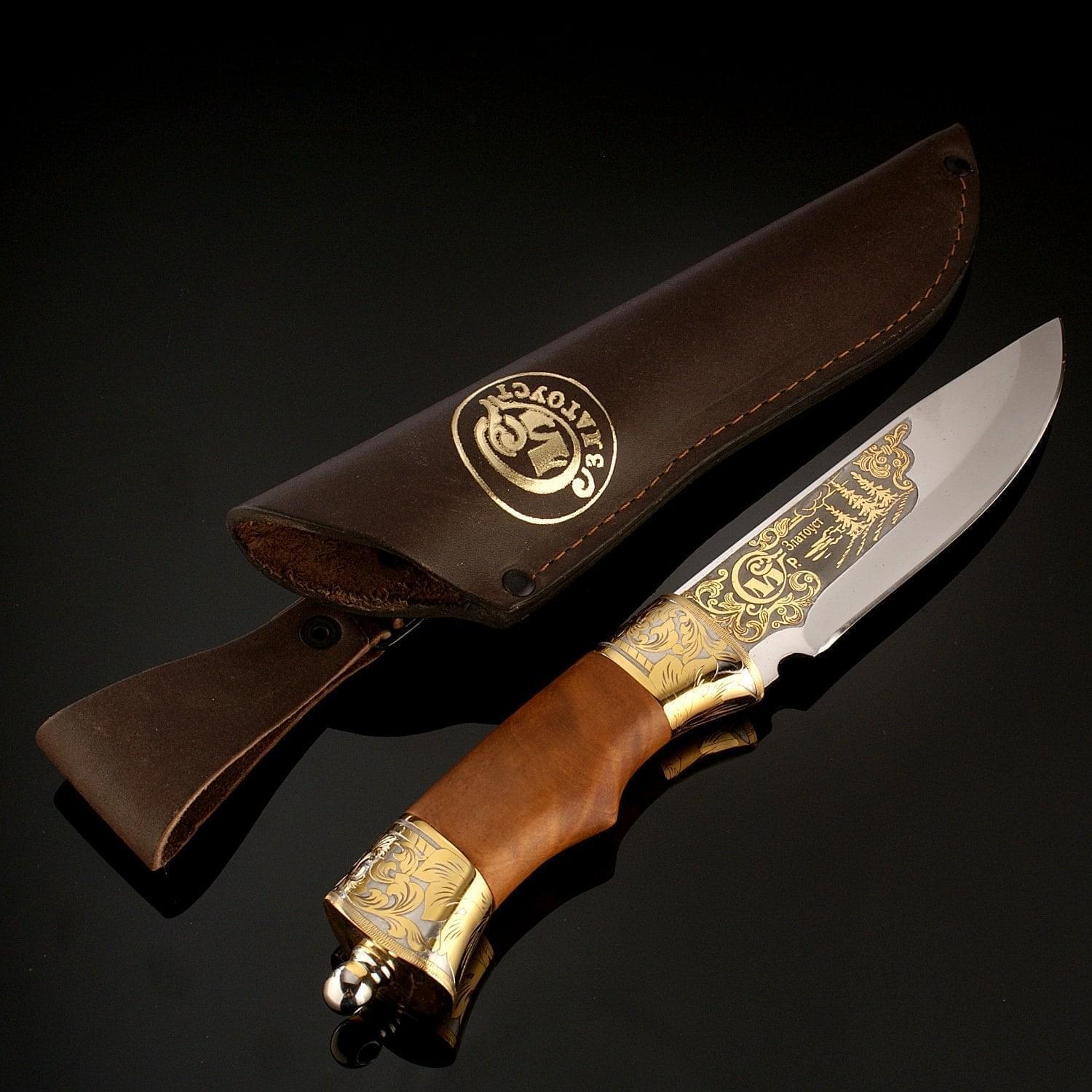 Охотничий нож с ножнами - это авторский образец оружейного промысла Златоуста. На Руси мужчина с малых лет и до самой смерти старался сохранить при себе подаренный ему нож. Археологи часто находят во время раскопок в гробницах ножи со сточенными клинками. Они знают, что этот аксессуар являлся не только орудием труда и защиты, но и талисманом .