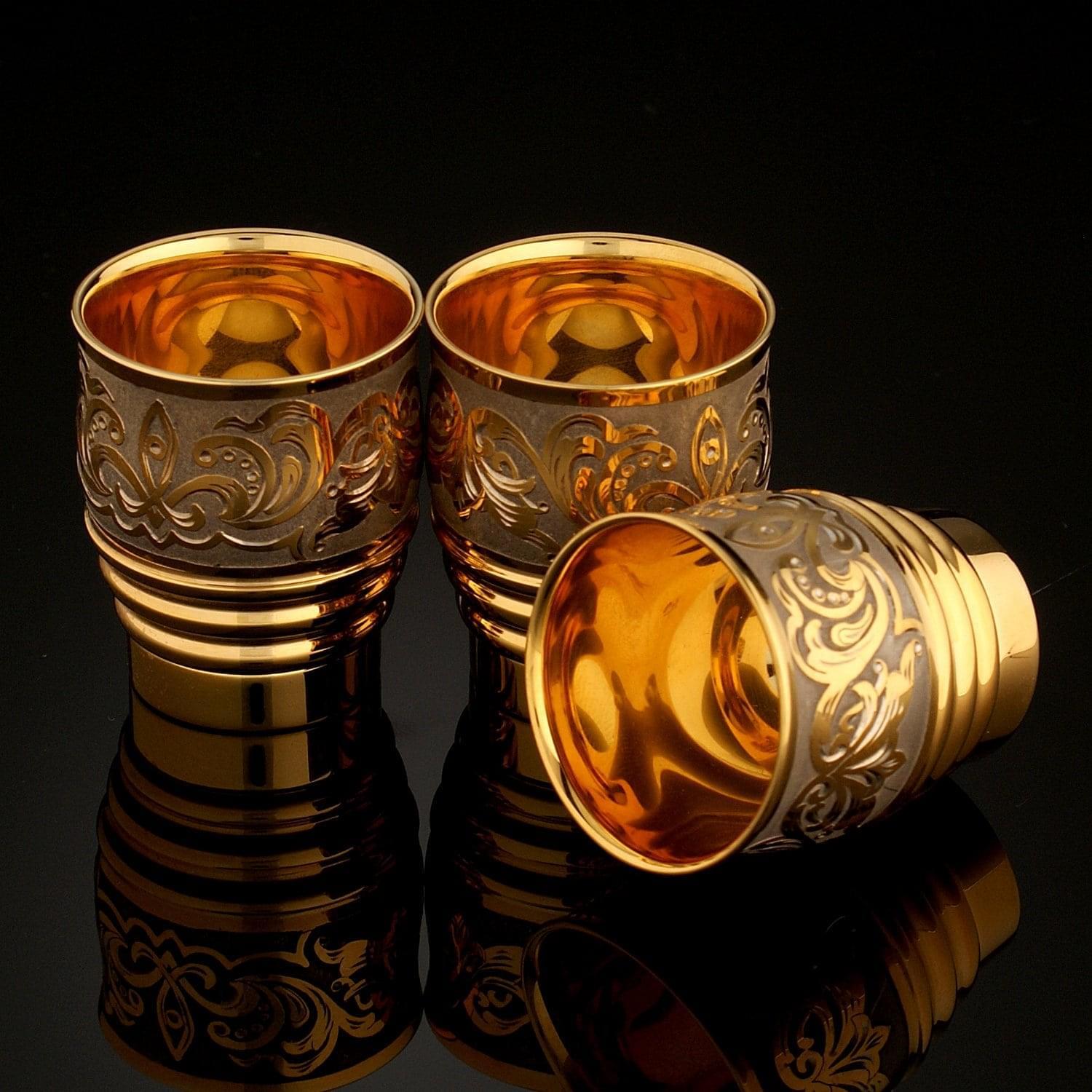 Княжеский стиль! Этот авторский набор из пары питейных сосудов вместе с флягой в имперском стиле и ножом в ножнах с выгравированными на них вручную композициями и орнаментами изготовлен вручную мастерами Златоуста - поставщиками посуды, холодного оружия и элементов декора ручной работы для главной резиденции президента России, Московского Кремля.