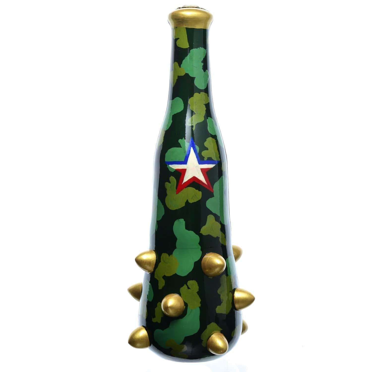 Корпус украшен пятиконечной звездой, символом ушедшей эпохи. Золотые шипы эффектно сочетаются с оттенками хакки и зелени. Корпус бара изнутри оформлен черной краской, Поверхности покрыты лаком. Авторская работа, футляр-палица для бутылки (бар) "Армейский" - памятный вариант сюрприза для почитателя алкоголя на общий или личный, в том числе профессиональный праздник.
