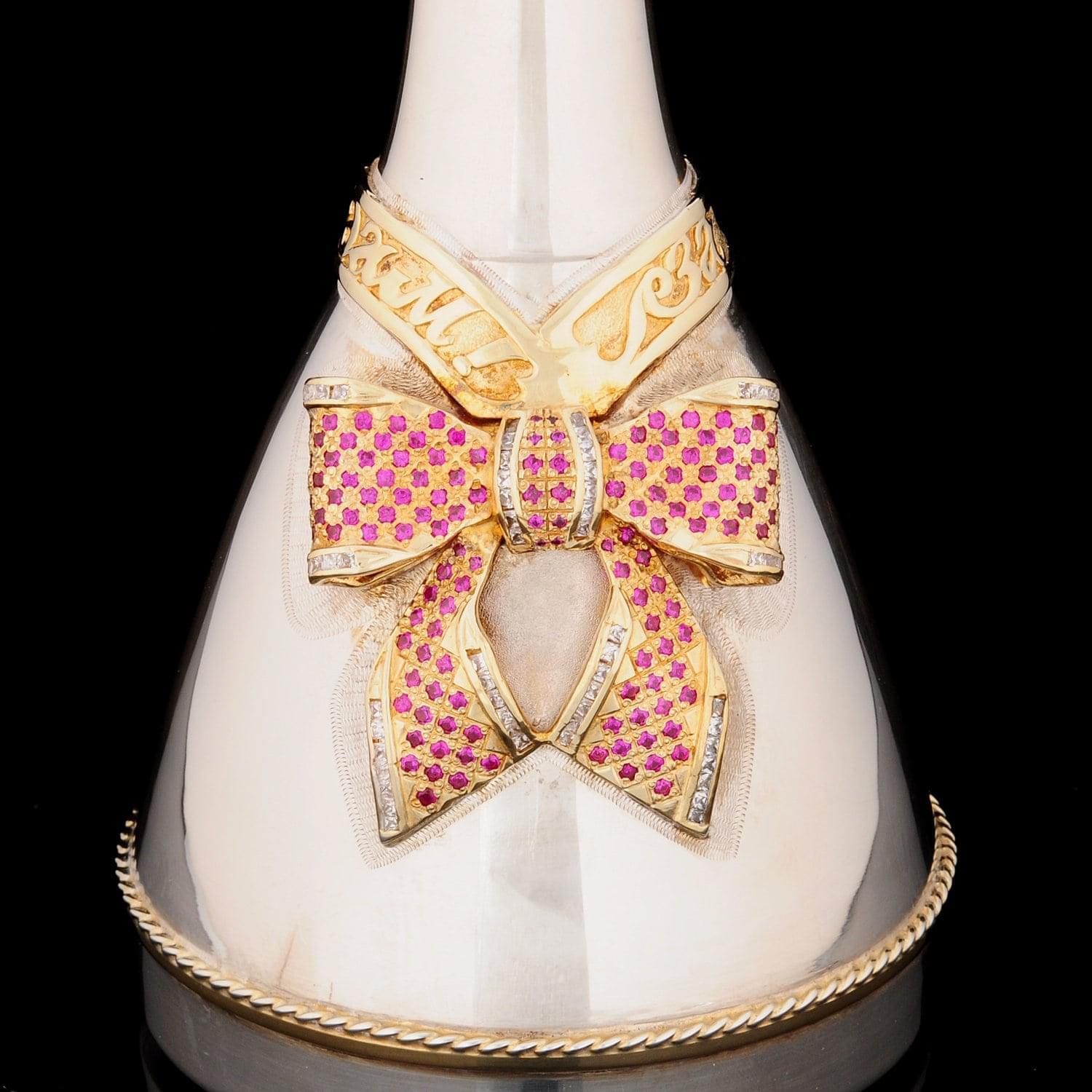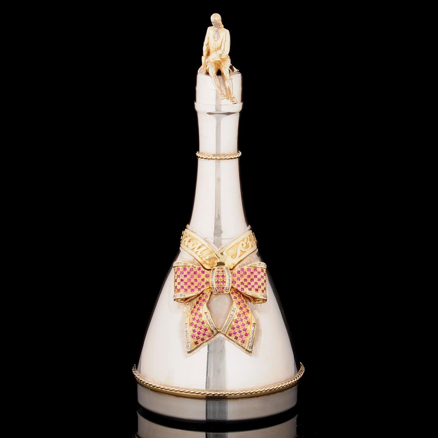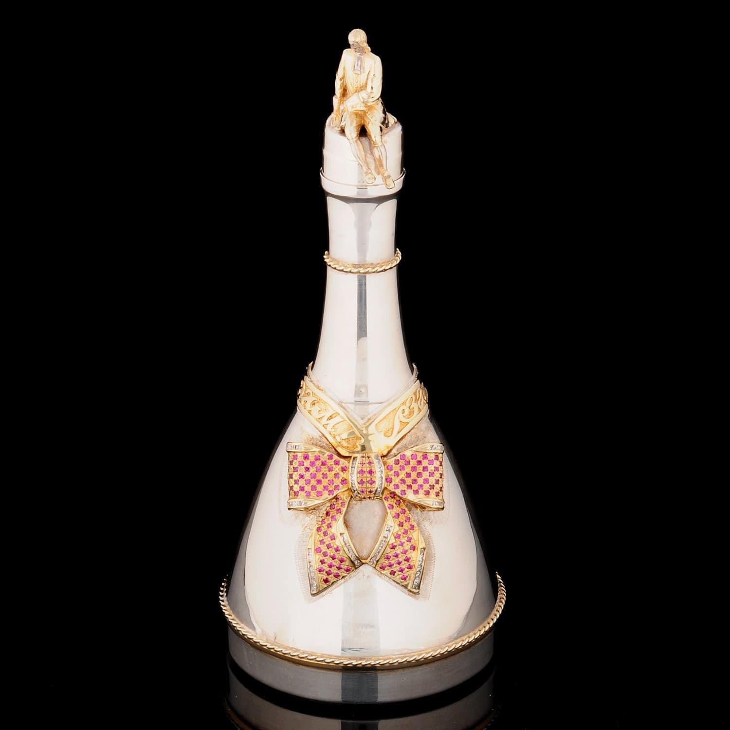 Серебро как и золото встречалось в самородном виде. Древнейшим центром добычи и обработки стала Сардиния, где оно было известно с раннего энеолита. В Ассирии и Вавилоне серебро считалось священным металлом и символизировало Луну. С середины 13 века из него изготавливали посуду. Серебро применяется для чеканки юбилейных монет. В мифологии многих народов ему приписывается способность отгонять злых духов. Драгоценный металл улучшает микрофлору организма человека - устраняет вредную загрязненную и налаживает полезную; нейтрализует возбудители опасных заболеваний. Ионы серебра проникают в эпицентр вируса, уничтожая его изнутри. Серебряный графин украшен бантом, усыпанным более чем 200 красными и белыми фианитами. На ленте выгравирована надпись «За милых дам». Оригинальна и пробка со скульптурой сидящего на балу денди. Изделие выполнено по образцу графина 18 века, подаренного завсегдатаю шумных застолий, который любил произносить тост «За милых дам», опустошая бокал до дна. Материал: серебро 925, позолота, цирконий, корунд. Размеры: высота 22 см. диаметр 9 см. ...