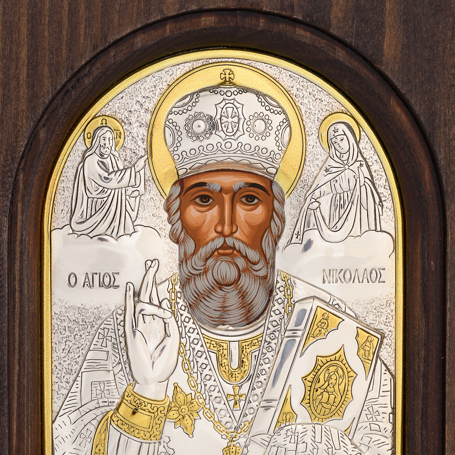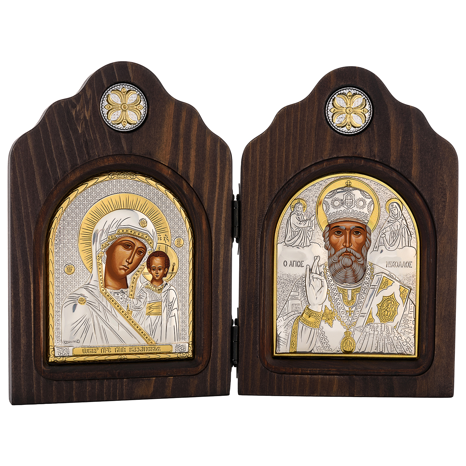 Икона диптих "Божья Матерь Казанская/Николай Чудотворец".Материалы: дерево, шелкография, латунь, серебрение, золочение.