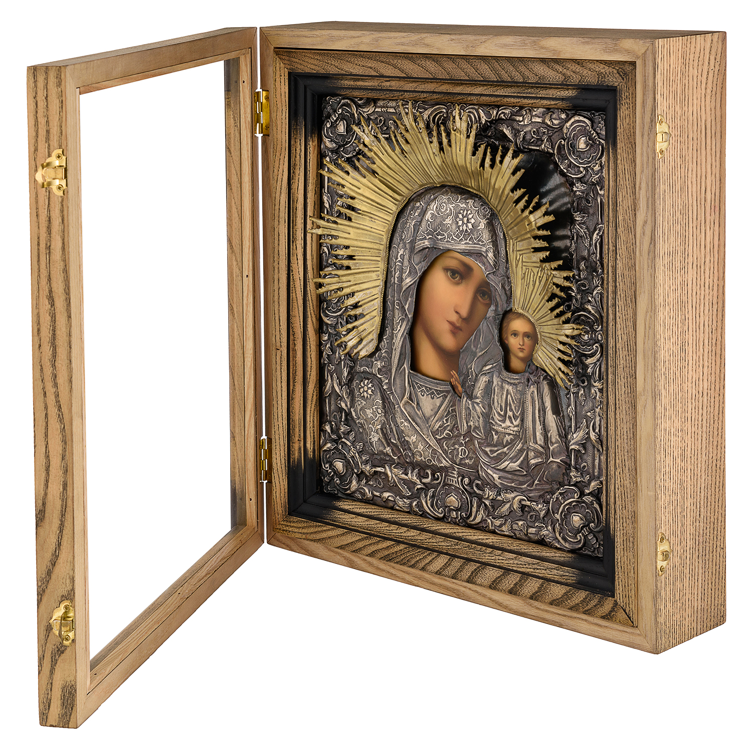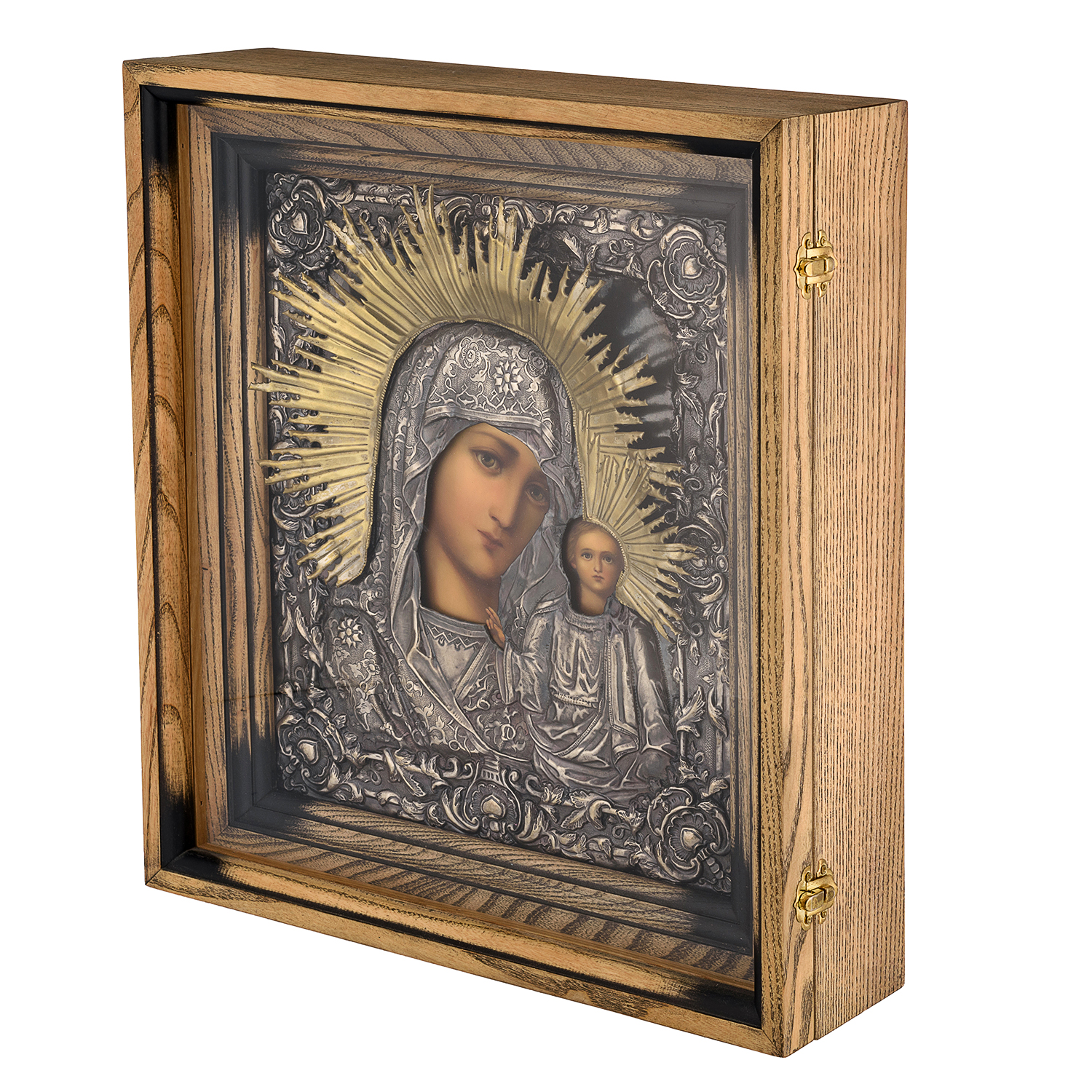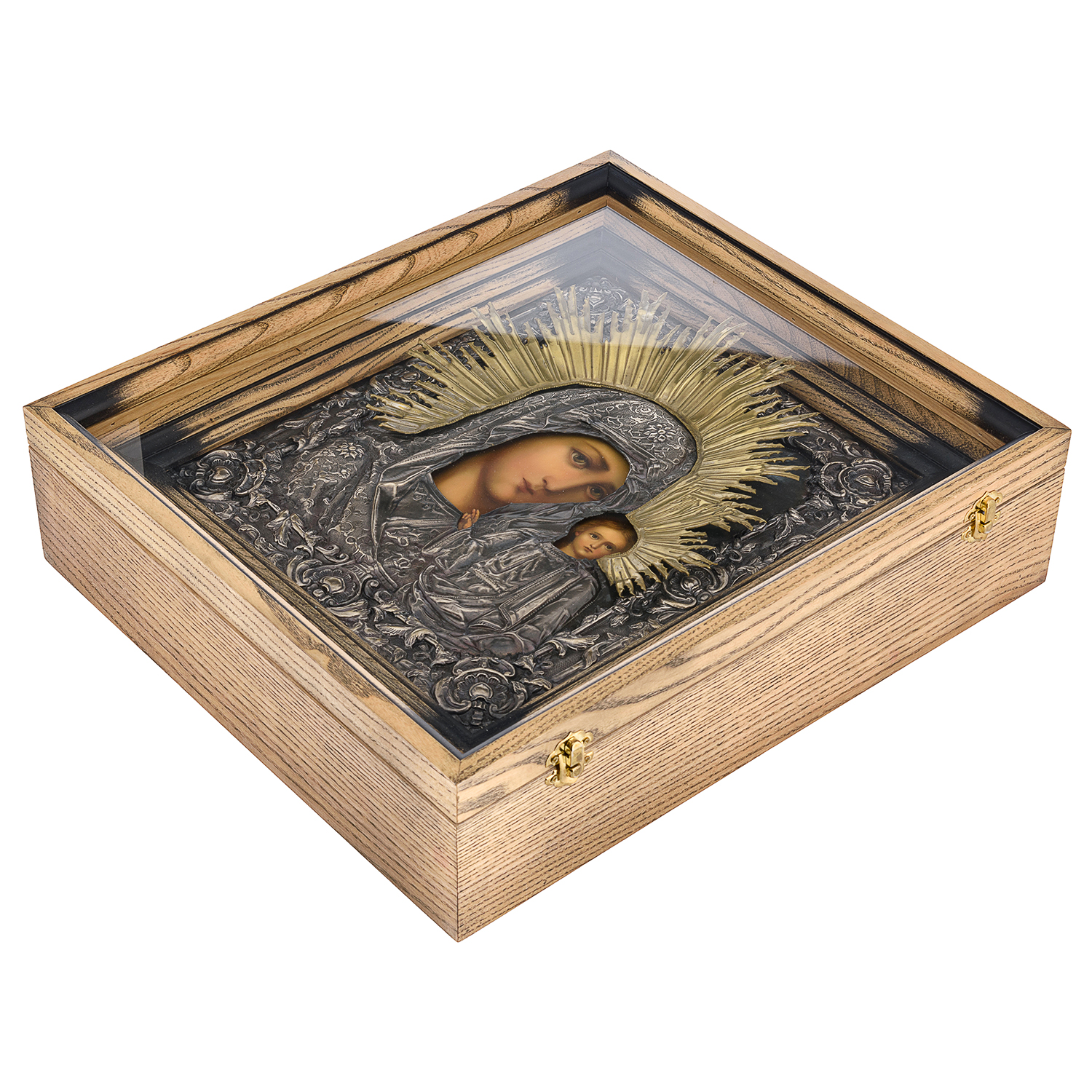 Икона в киоте "Божья Матерь Казанская".Материалы: дерево, гальванопластика, шелкография, золочение.