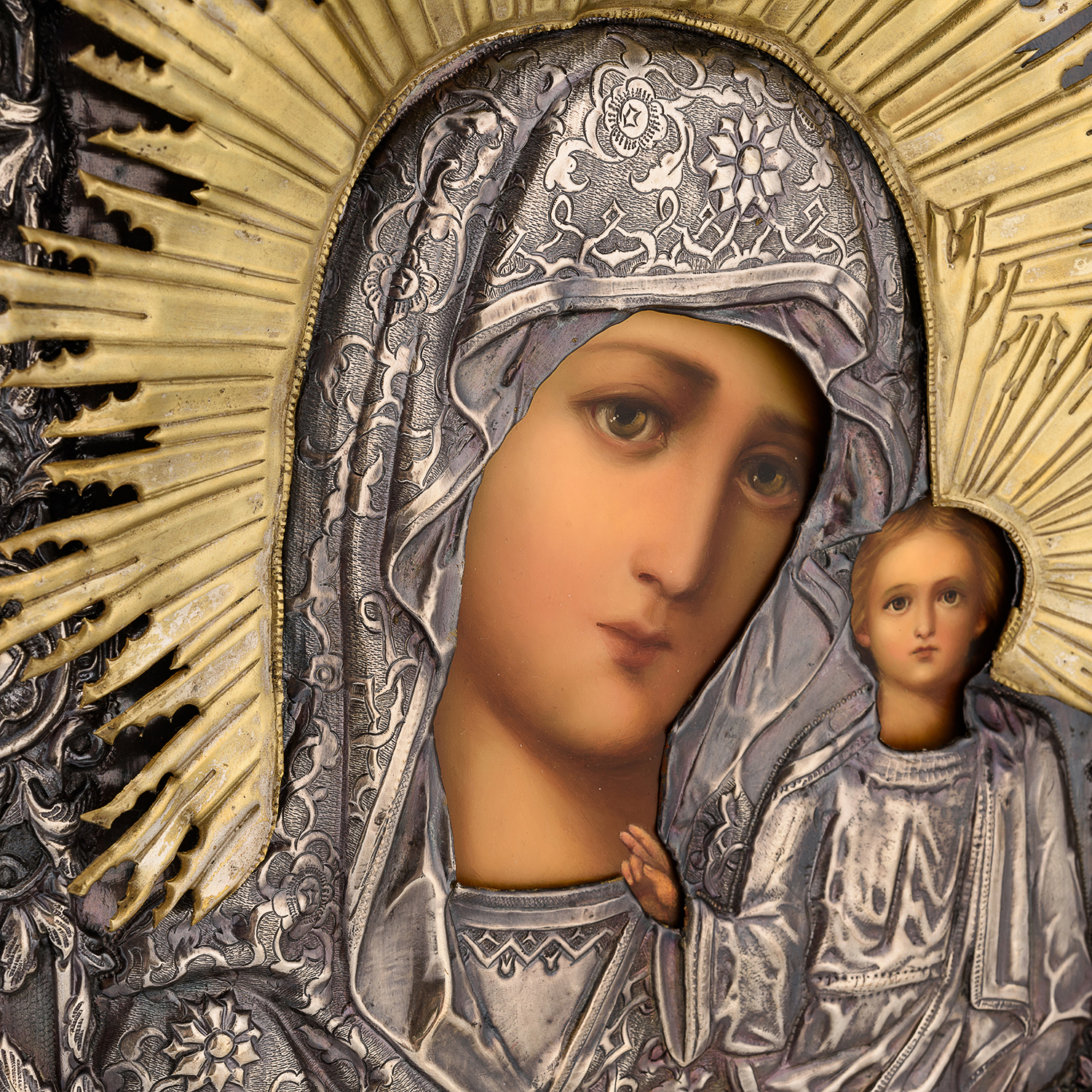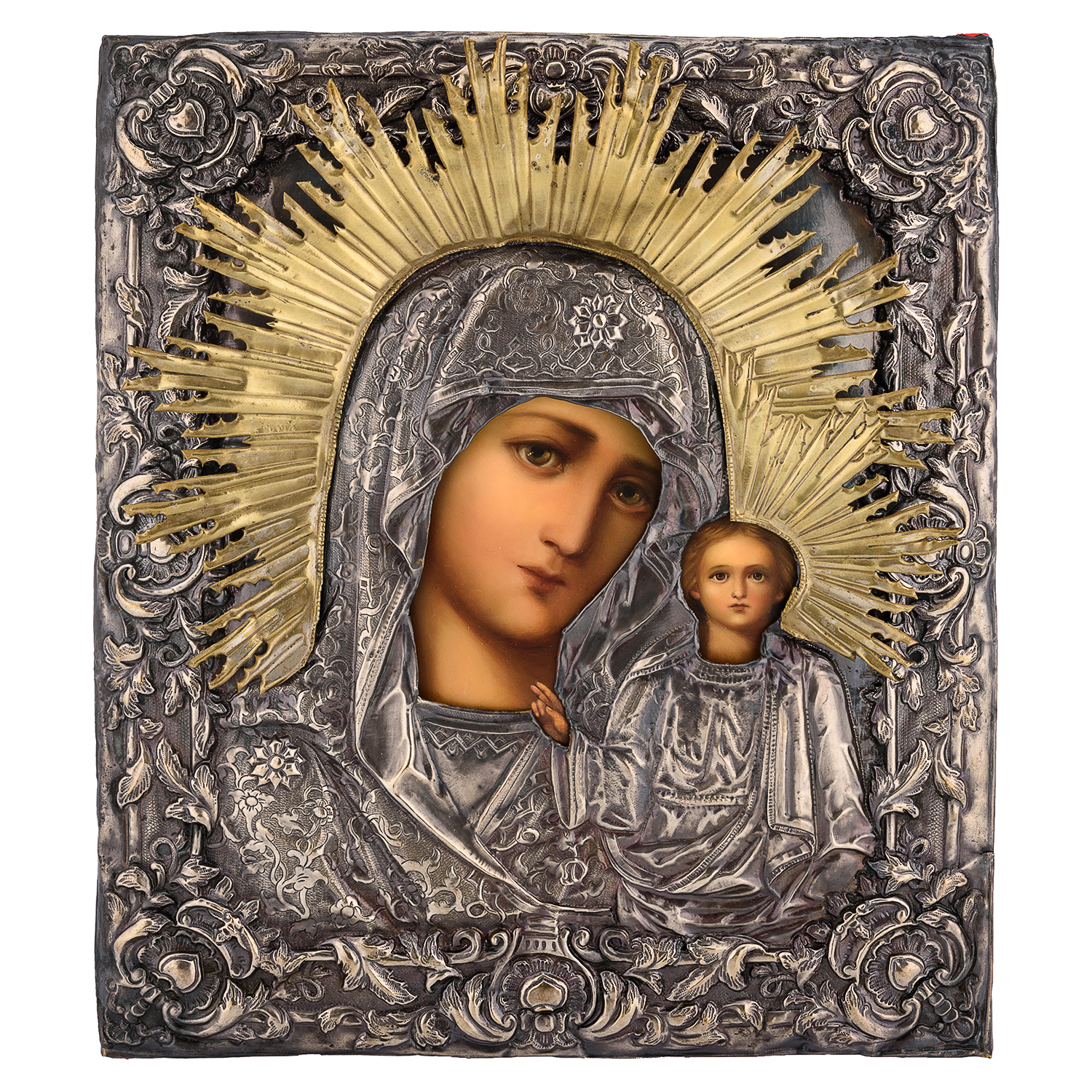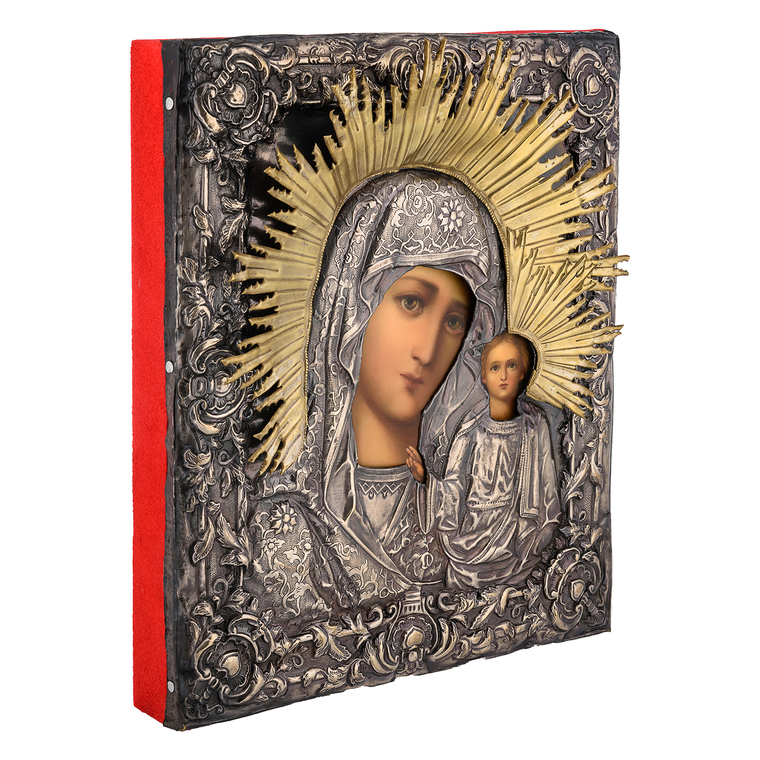 Икона в киоте "Божья Матерь Казанская".Материалы: дерево, гальванопластика, шелкография, золочение.