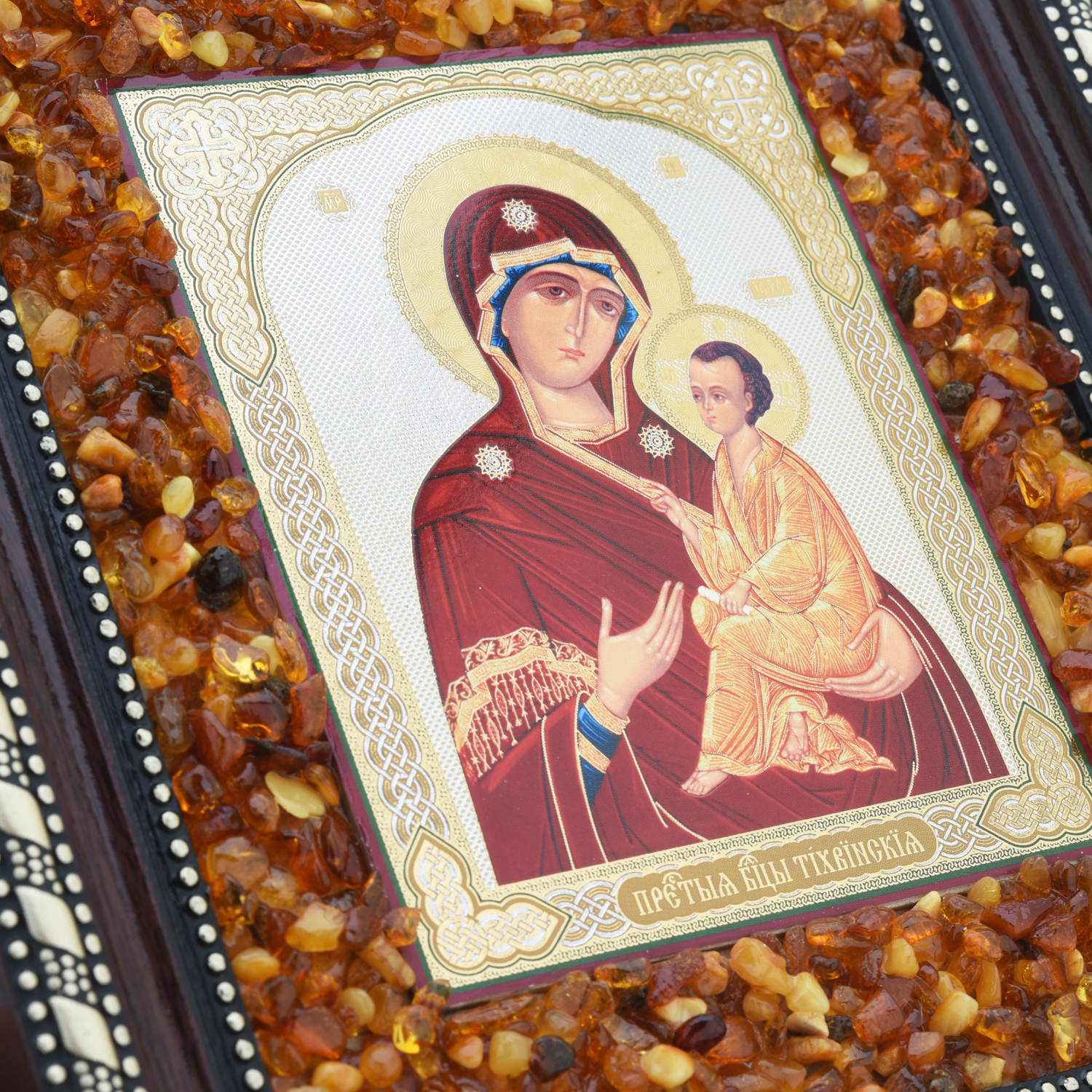 Икона янтарная "Божья Матерь Тихвинская".Материалы: дерево, янтарь.