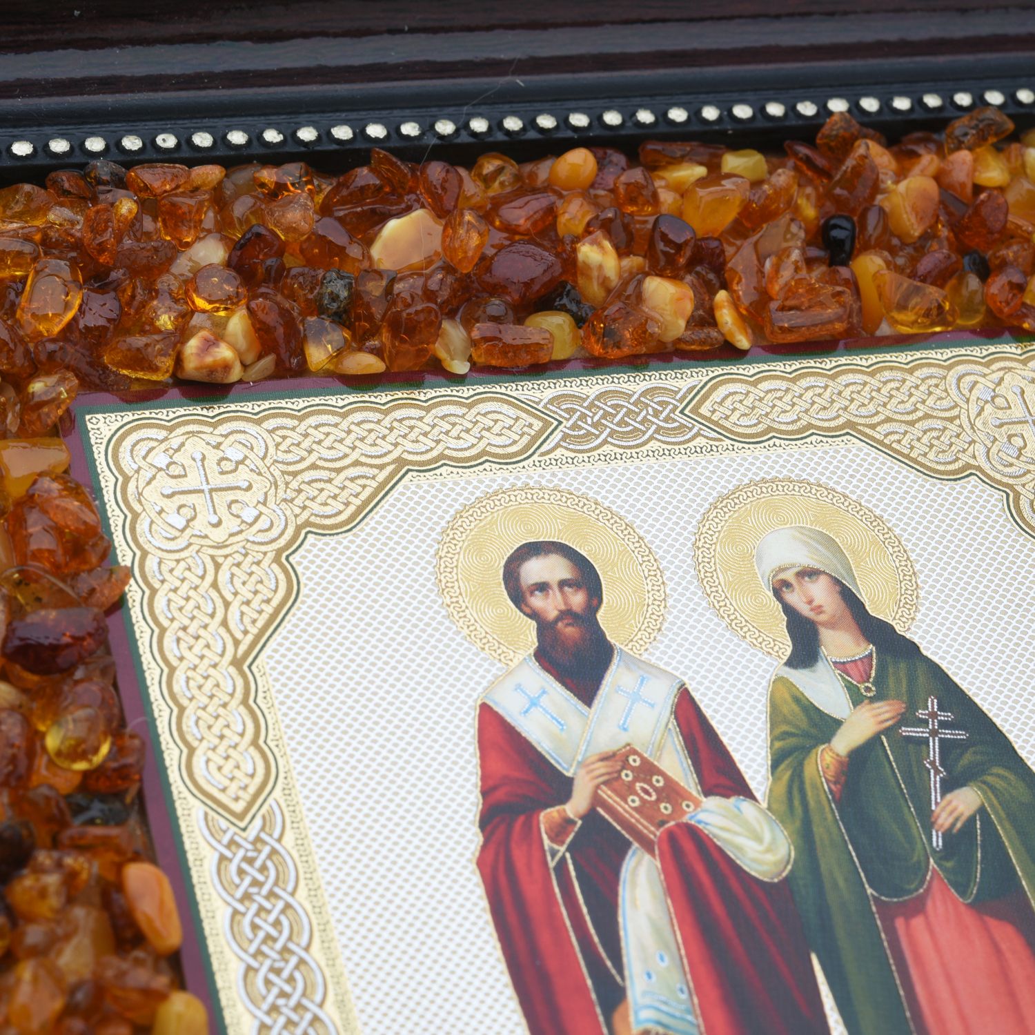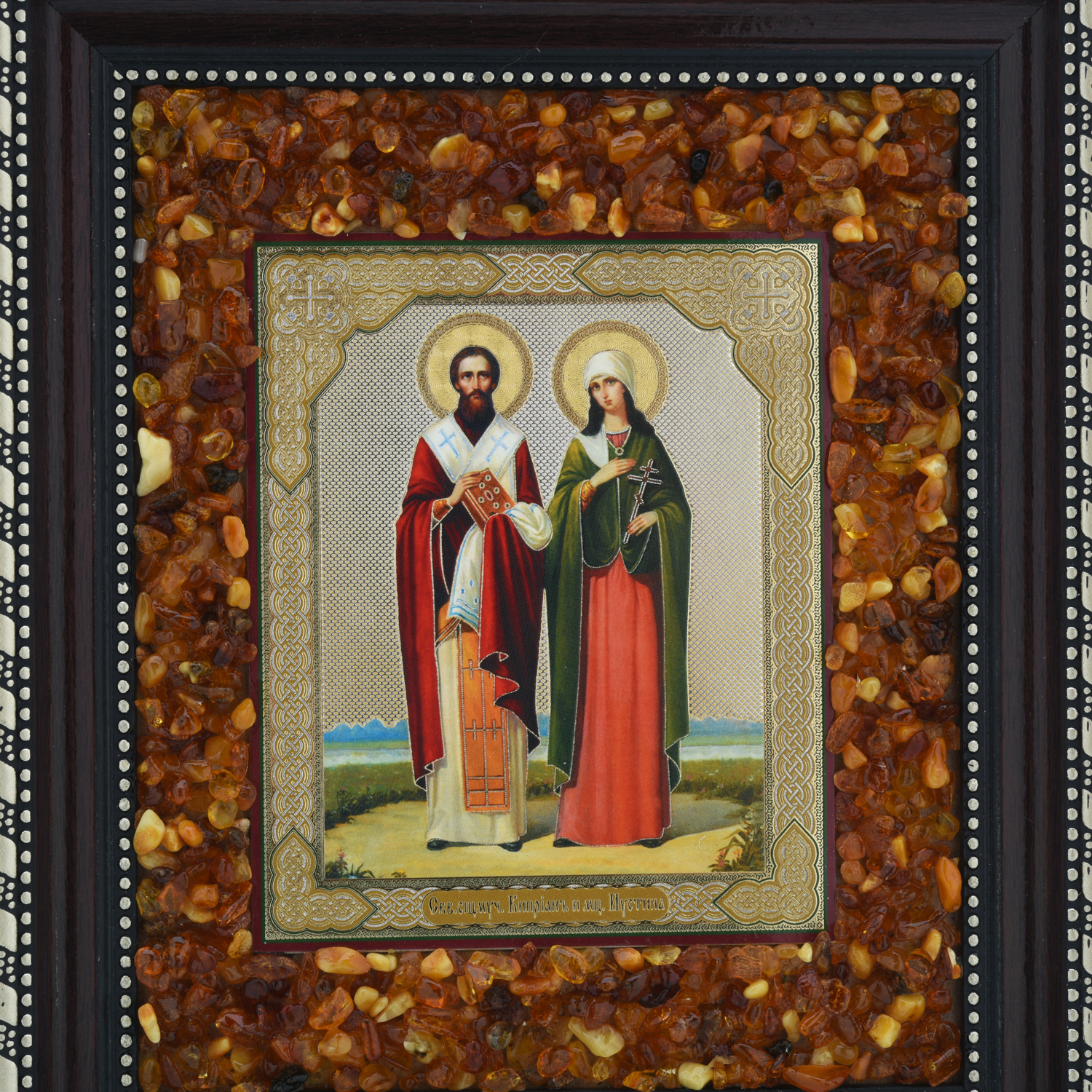 Икона янтарная "Киприан и Иустина".Материалы: дерево, янтарь.