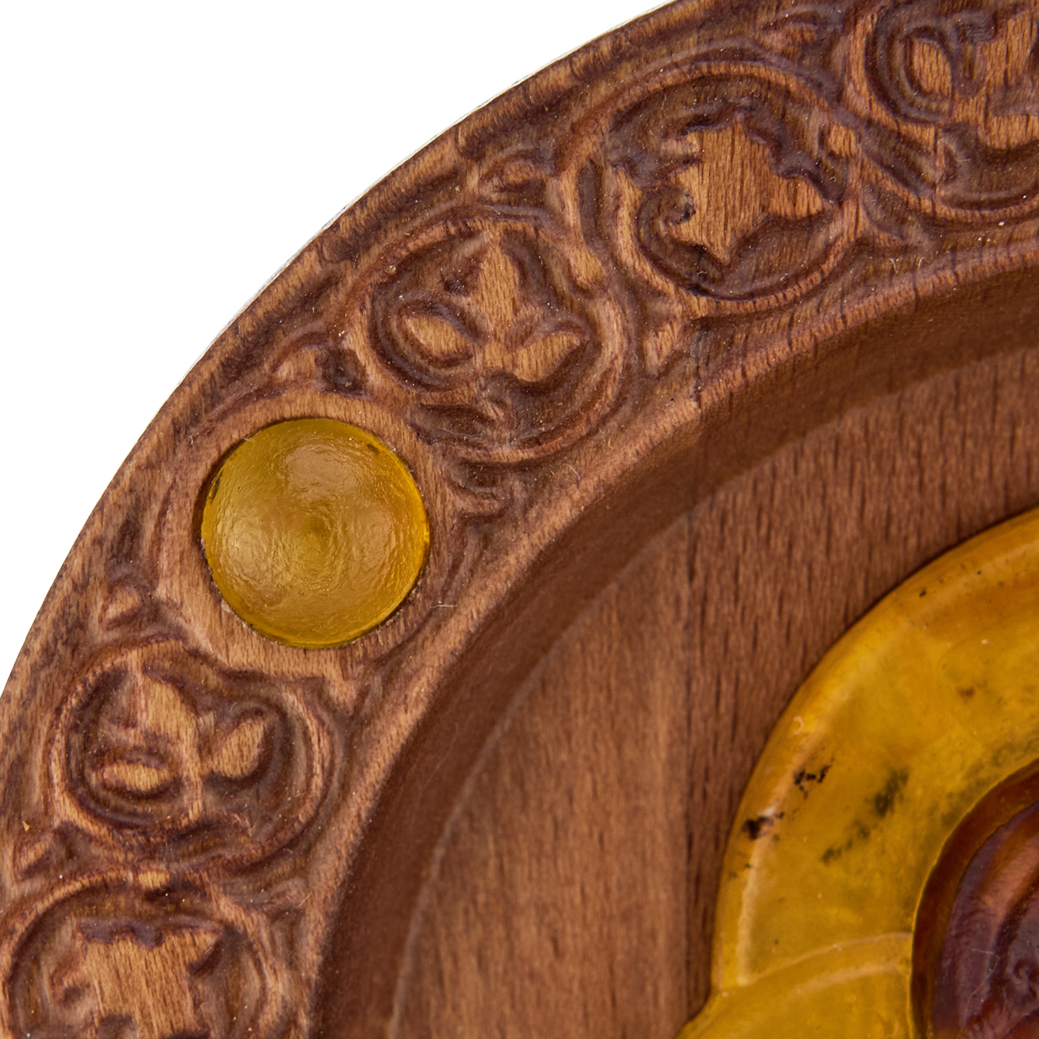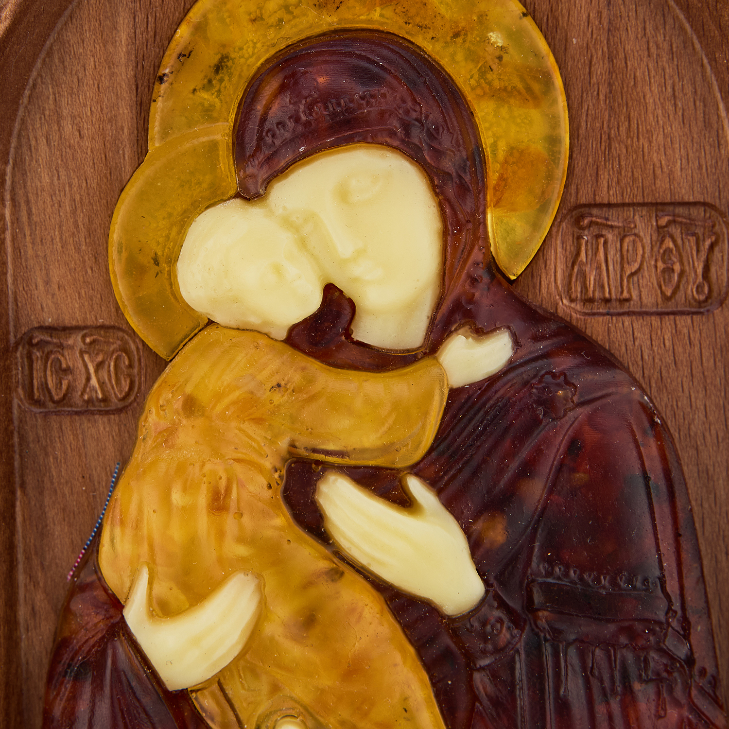 Икона янтарная "Владимирская Божья Матерь".Материалы: дерево, янтарь.