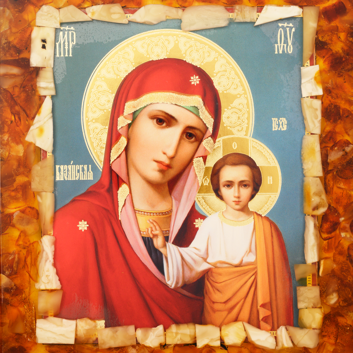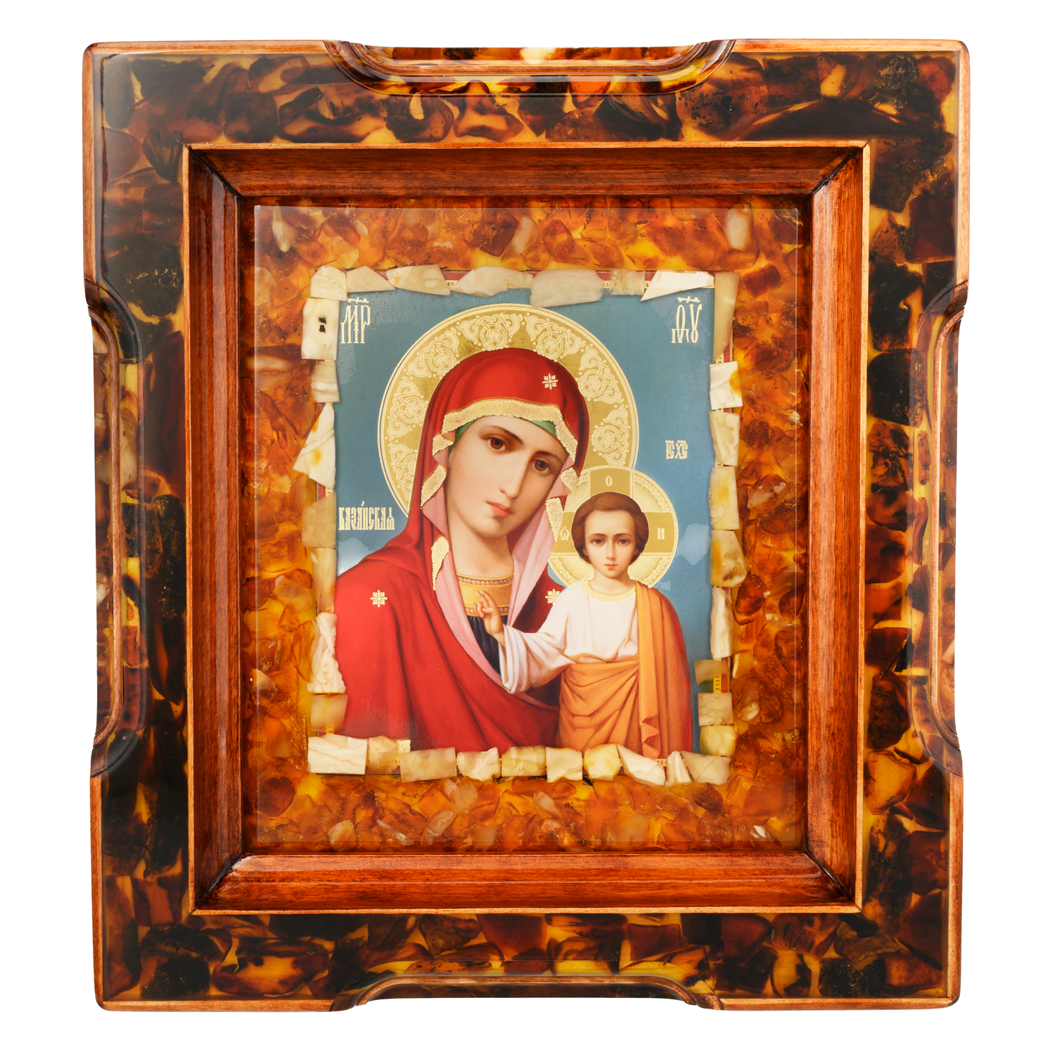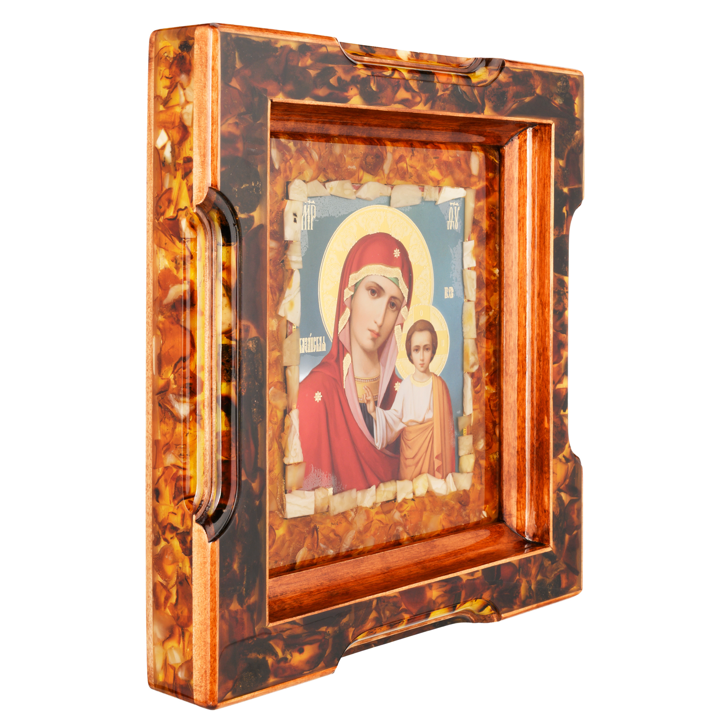 Русские подарки и сувениры → Религиозные подарки → Иконы → Икона янтарная "Божья Матерь Казанская" 22,5х25,5 см