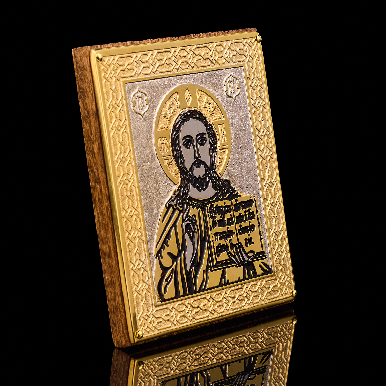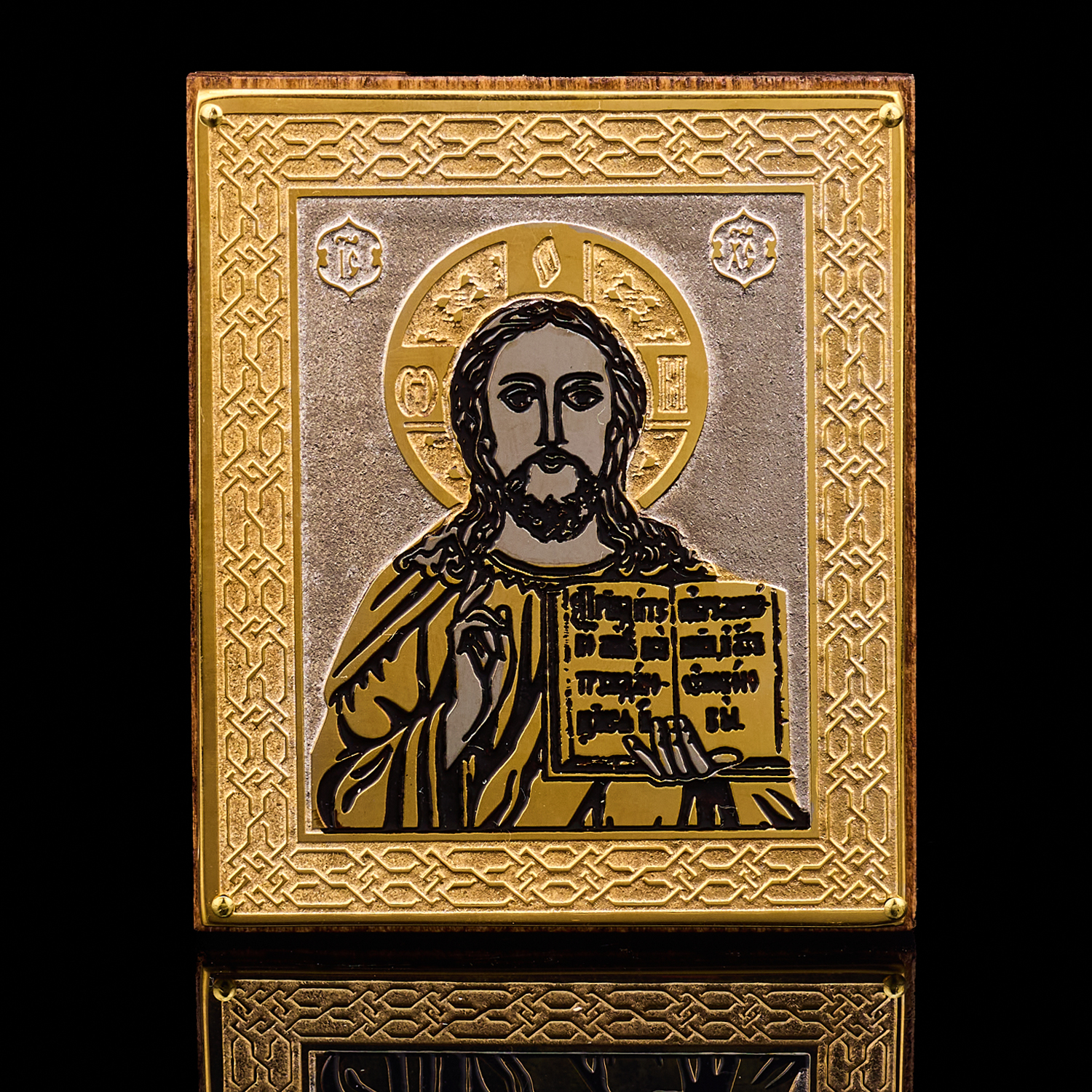 Икона с позолотой и эмалью "Иисус Христос". Златоуст.Материалы: латунь, никель, золото 999,9*, эмаль, дерево.