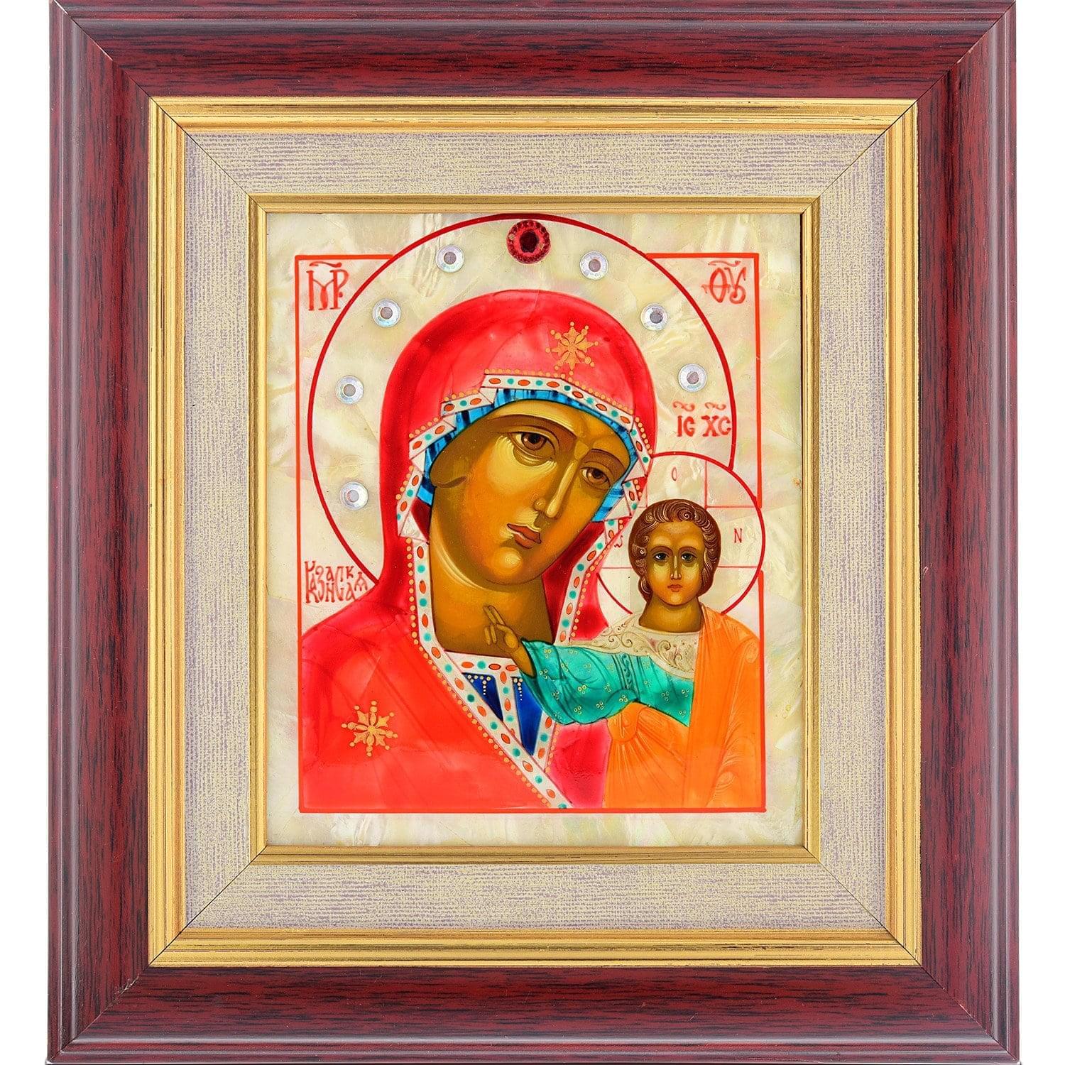 Икона Богородицы с младенцем Иисусом написана российским иконописцем с учетом художественных канонов русско-византийской иконописи на пластине, оформленной из природного минерала - натурального перламутра, придающего образу свечения. Алого цвета хитон Девы Марии и полудрагоценные камни фианиты, украшающие ее нимб, красиво сочетаются с переливами перламутра и рамой в оттенке бордо с внутренней позолоченной вставкой...