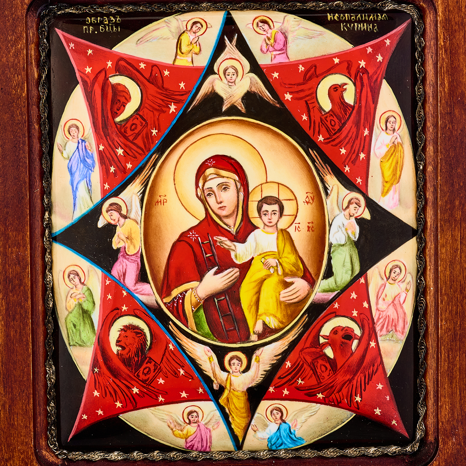 Неопалимая купина́ в Пятикнижии - горящий, не сгорающий терновый куст, в котором Бог явился Моисею, который он пас овец в пустыне близ горы Синай. Когда Моисей подошел к кусту, появился Бог и призвал вывести народ Израиля из Египта в Обетованную землю. Неопалимая купина знаменовала непорочное зачатие Богоматерью Христа от Духа Святого. В Православии символизирует исихазм. Икона известна с середины XVI века. Она изображает Богоматерь с младенцем, держащую в руках Гору из пророчества Даниила, Лестницу Иакова, Врата Иезекииля... Изображение заключено в восьмиконечную звезду. «Звезда составлена из двух четыреугольников. Один красный - цвет пламени, другой - зеленый (зелень куста). Углы иконы посвящены упоминаемым в Апокалипсисе Иоанна Богослова символам: человеку, льву, тельцу, орлу, архангелам Михаилу с жезлом, Рафаилу с алавастром, Уриилу с огненным мечом, Селафиилу с кадилом, Вара¬хи¬илу с виноградным гроздием и Гавриилу с веткой благовестия. Научно объясняется химический эффект низкотемпературного холодного огня как свечения, а не собственно пламени.. Если в жаркий день поднести огонь к растению, воздух вокруг соцветий на пару секунд ярко, с хлопком вспыхнет, но растение не загорится. Фокус в эфирных маслах, выделяемых цветками и плодами. По народному верованию, икона защищает жилища от огня. Древняя икона «Неопалимая Купина» принесена в московский Благовещенский собор палестинскими иноками в 1390 году и написана на камне скалы, где Моисей видел таинственный куст.Ростовская финифть. Икона настольная "Неопалимая купина".
