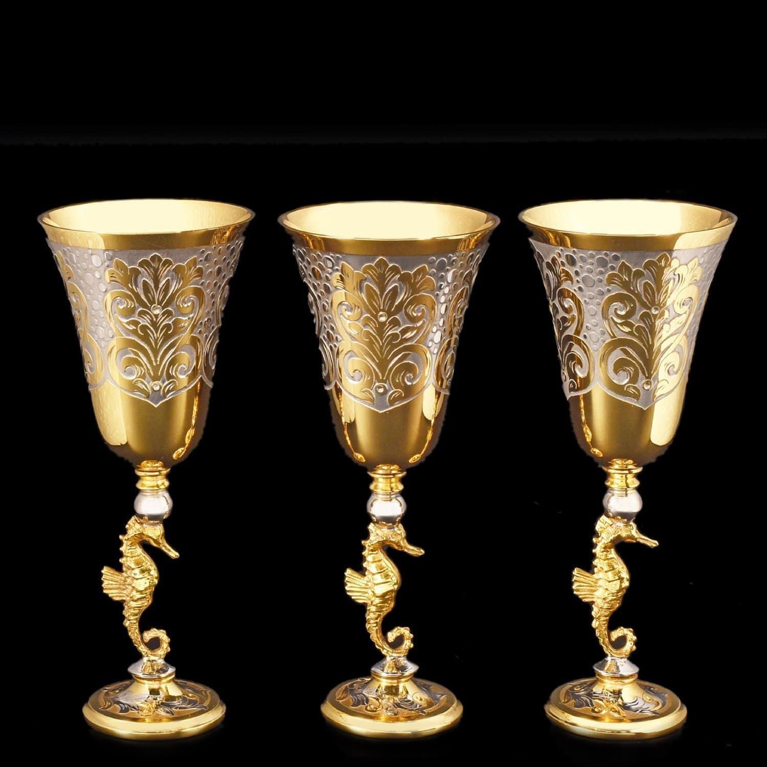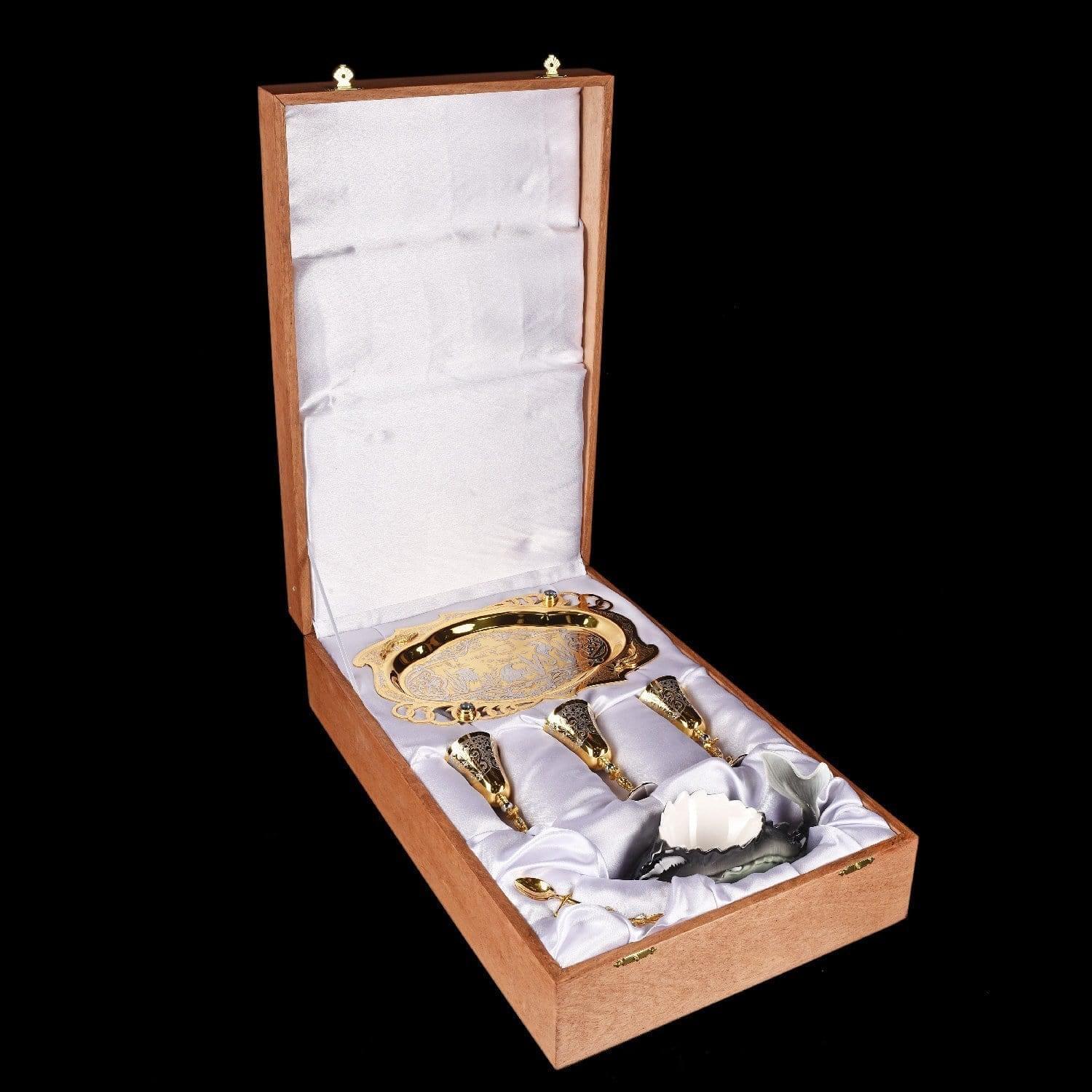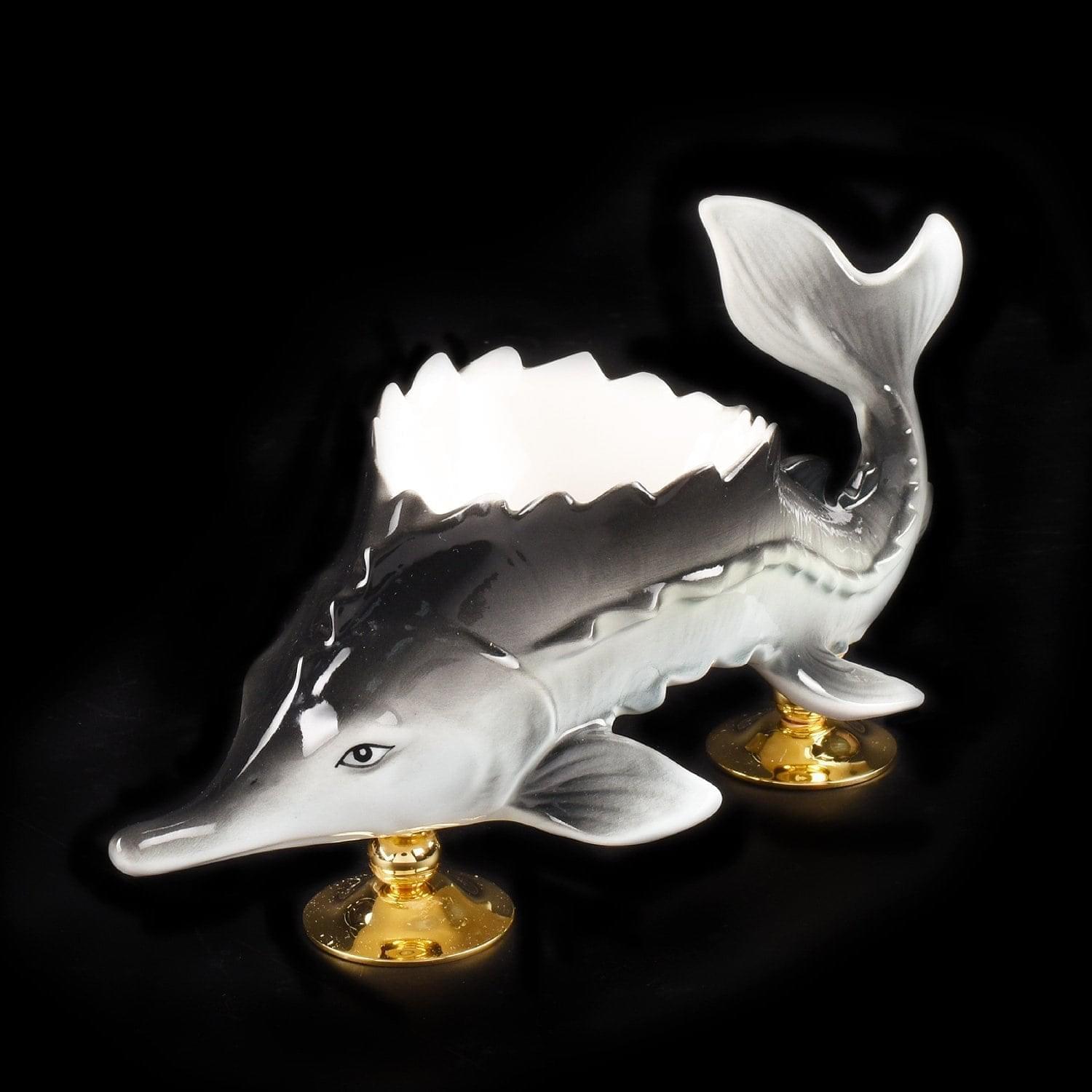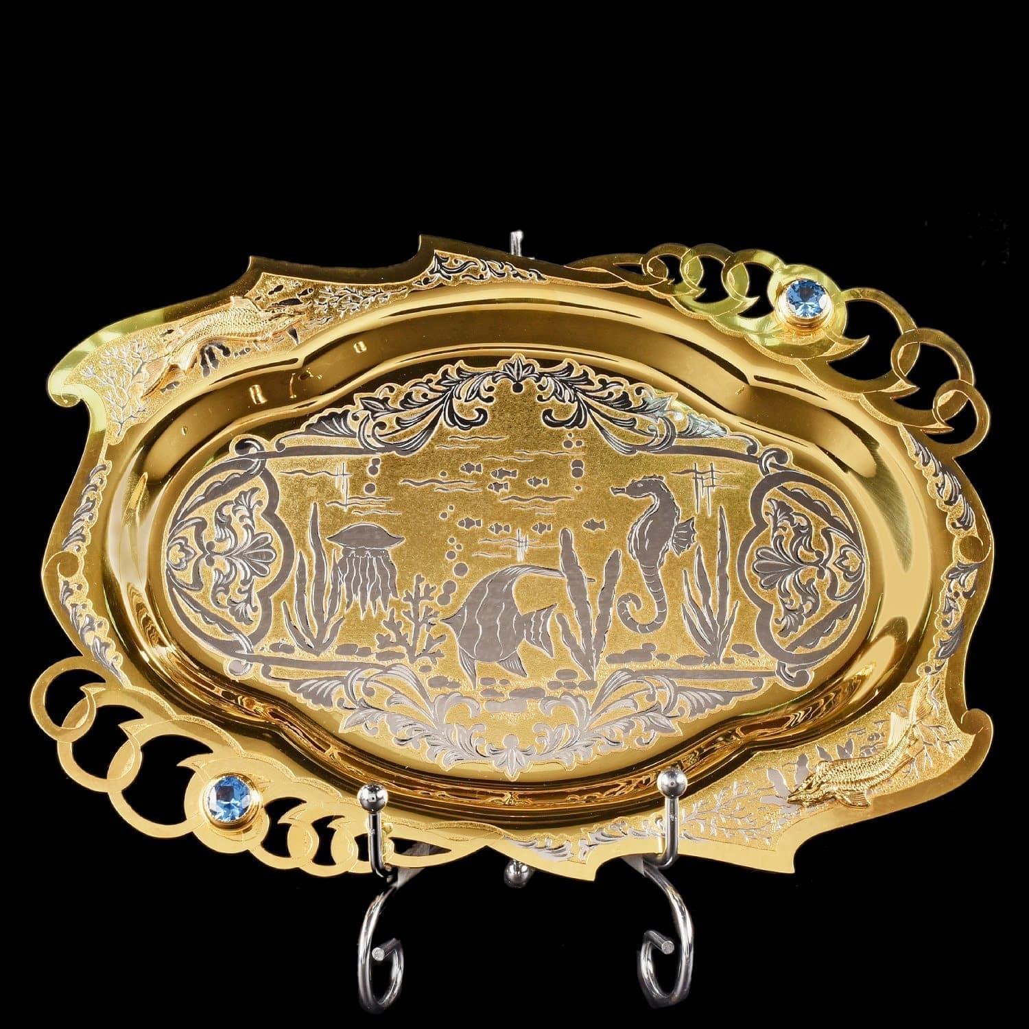 Отдавая дань старинной русской традиции царских пиршеств и застолий, мастера Златоуста создают настоящие шедевры. Икорница Осетр входит в набор с тремя бокалами на подносе, изготовленными из металлического медного сплава латуни и русского белого золота, фарфора. Изысканная сервировочная композиция украшена гравюрой, серебрением, позолотой и сияющими фианитами. Поднос, три бокала для горячительного напитка и ложечка, выполненные из латуни с использованием форм легендарного Императорского фарфорового завода, расположенного в Санкт-Петербурге. Фарфоровый осетр, представляющий собой чашу со съемной крышкой на четырех золотых ножках, изготовлен из твердого, не пористого фарфора, создаваемого по особой рецептуре, разработанной ученым Виноградовым в 18 веке. Все предметы набора уложены в красивую, стильную подарочную упаковку из дерева, оформленную изнутри белым атласом. .