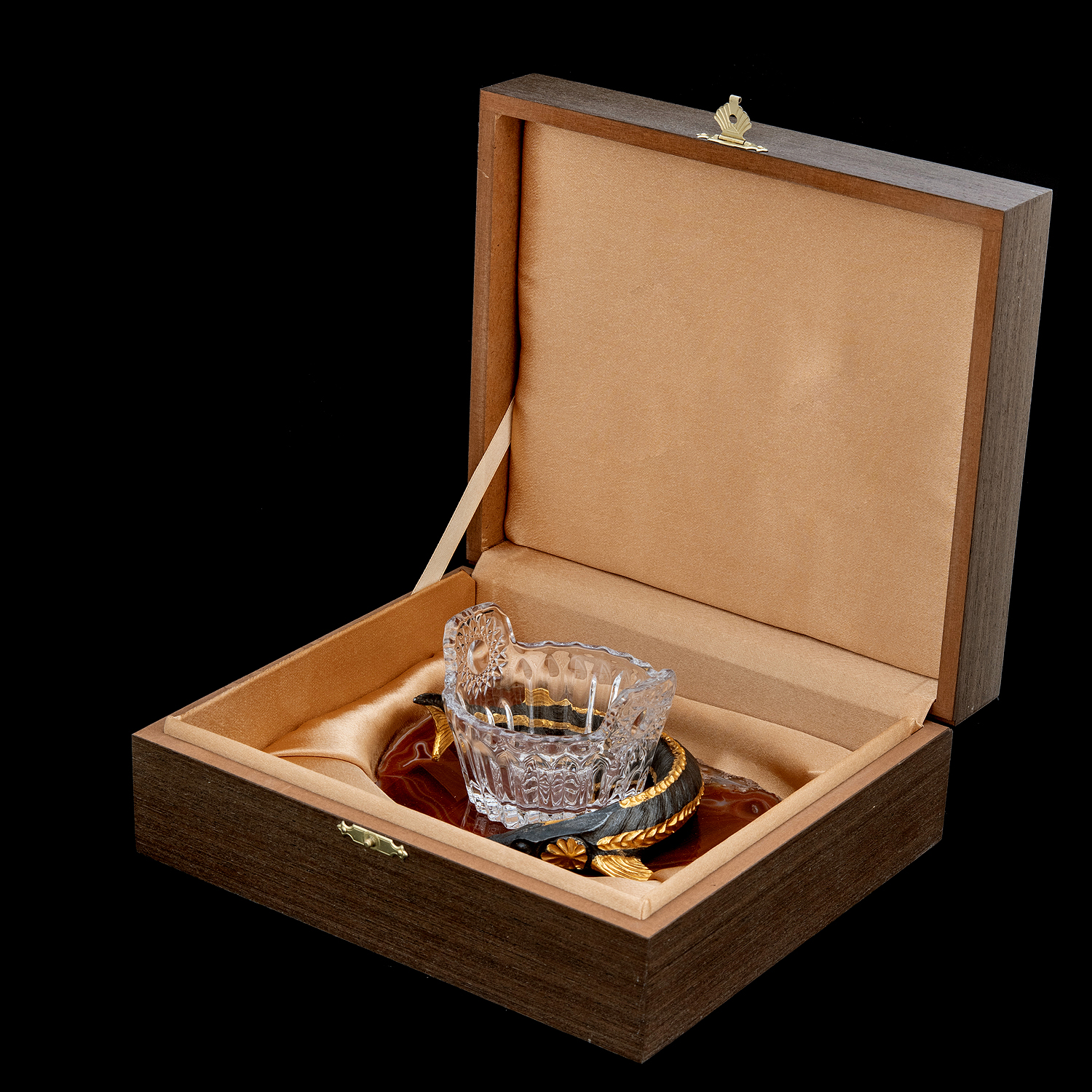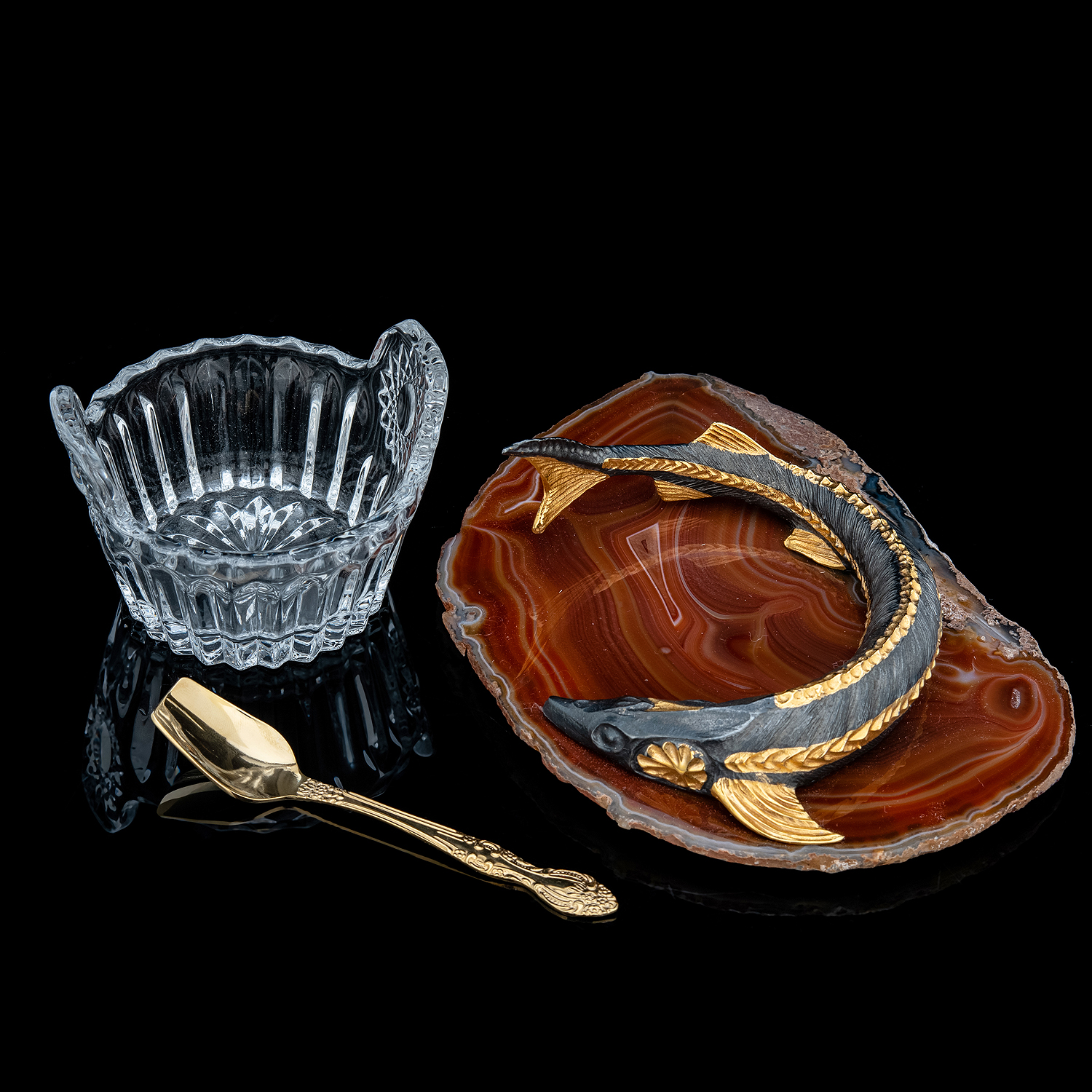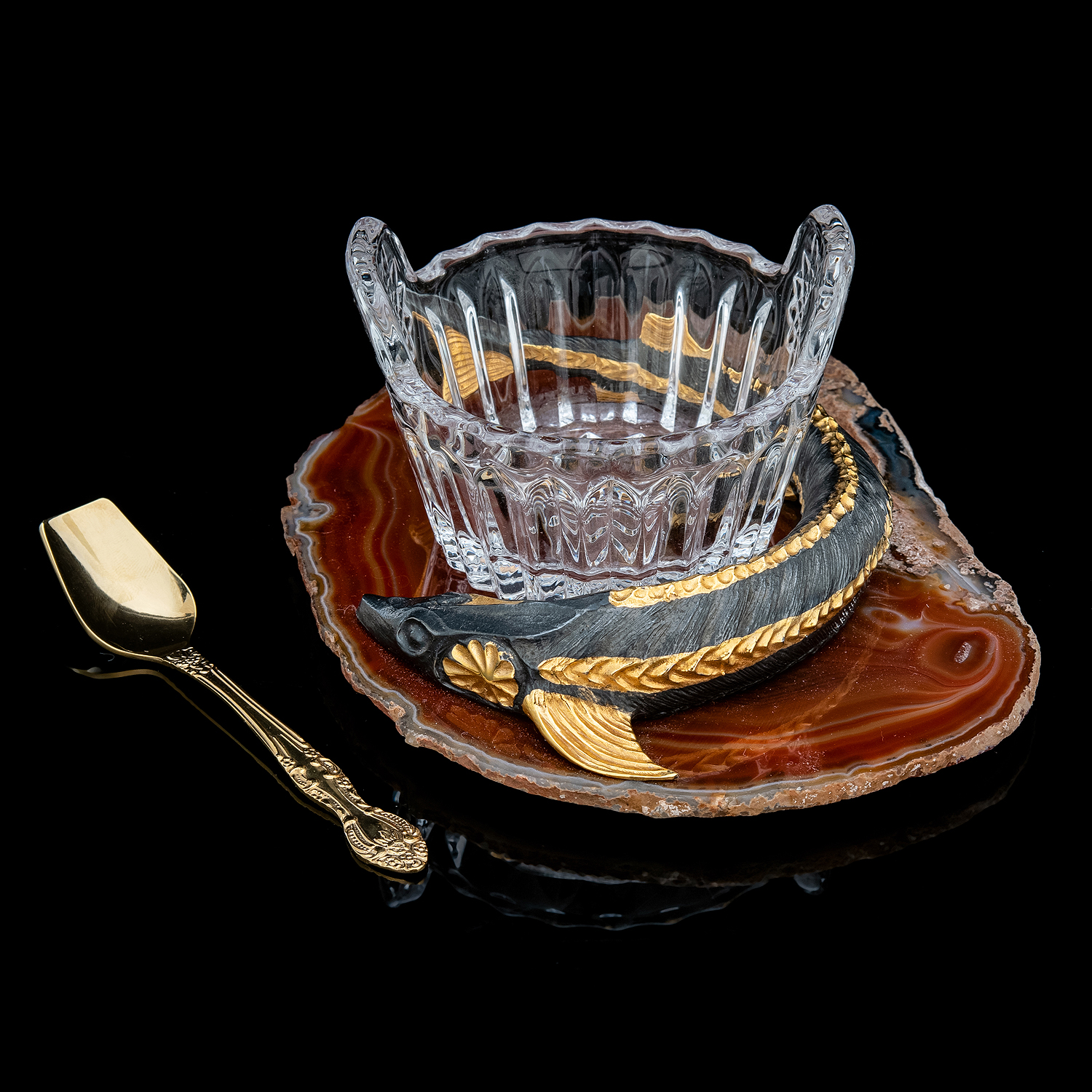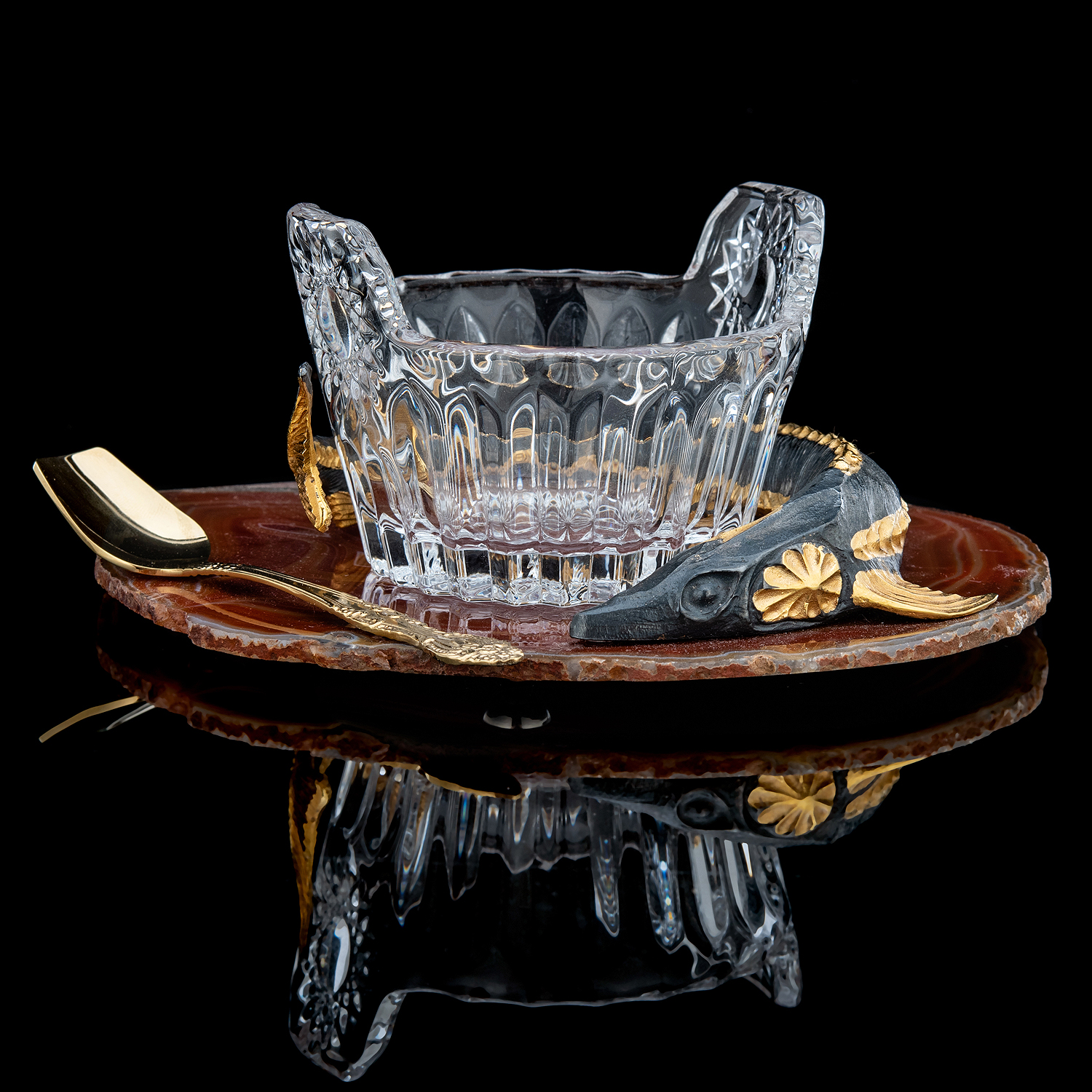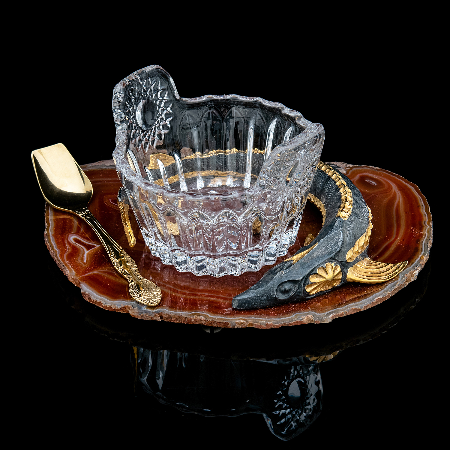 Икорница "Кадушка". Златоуст.Материалы: латунь, никель, золото 999,9*, хрусталь, агат.