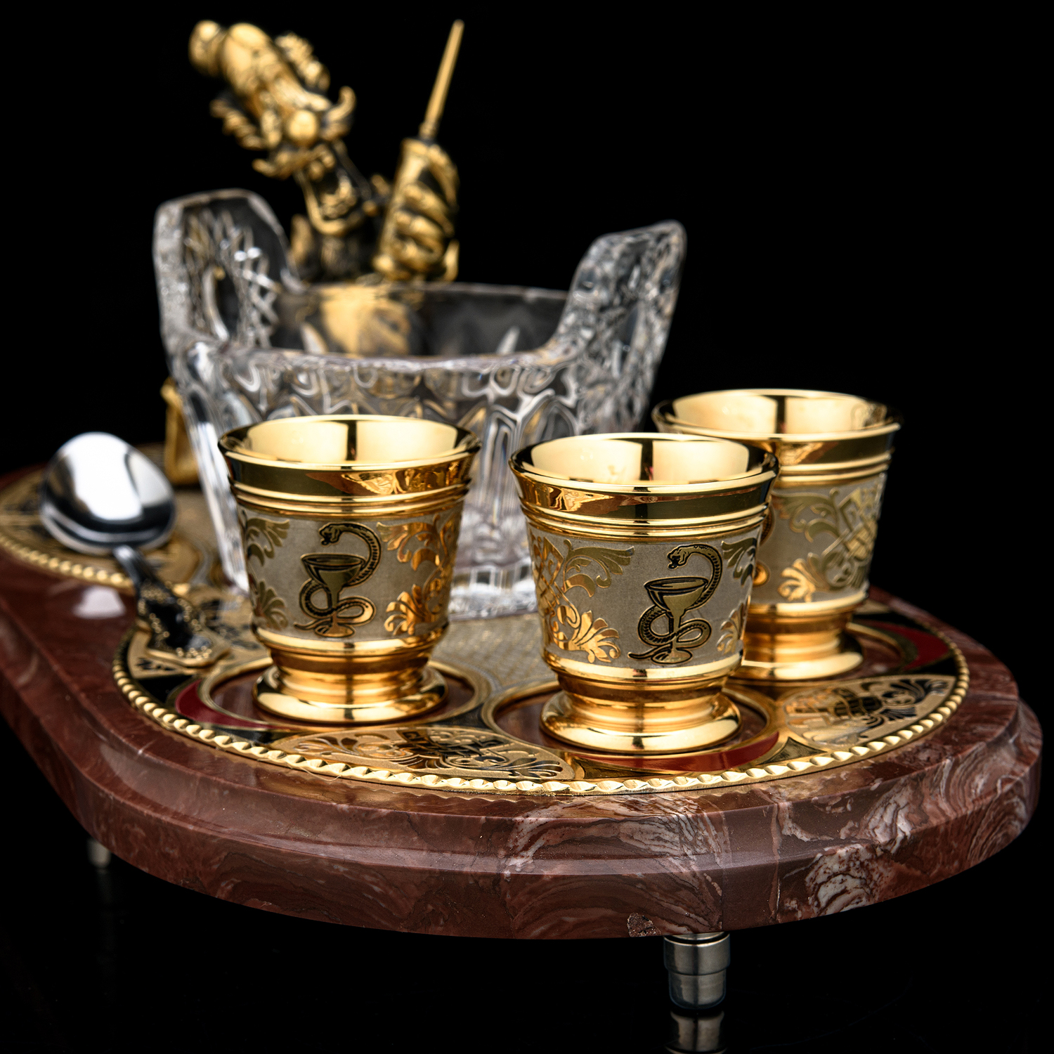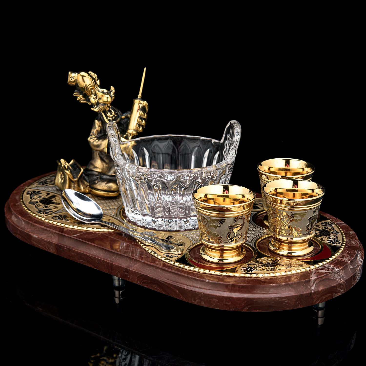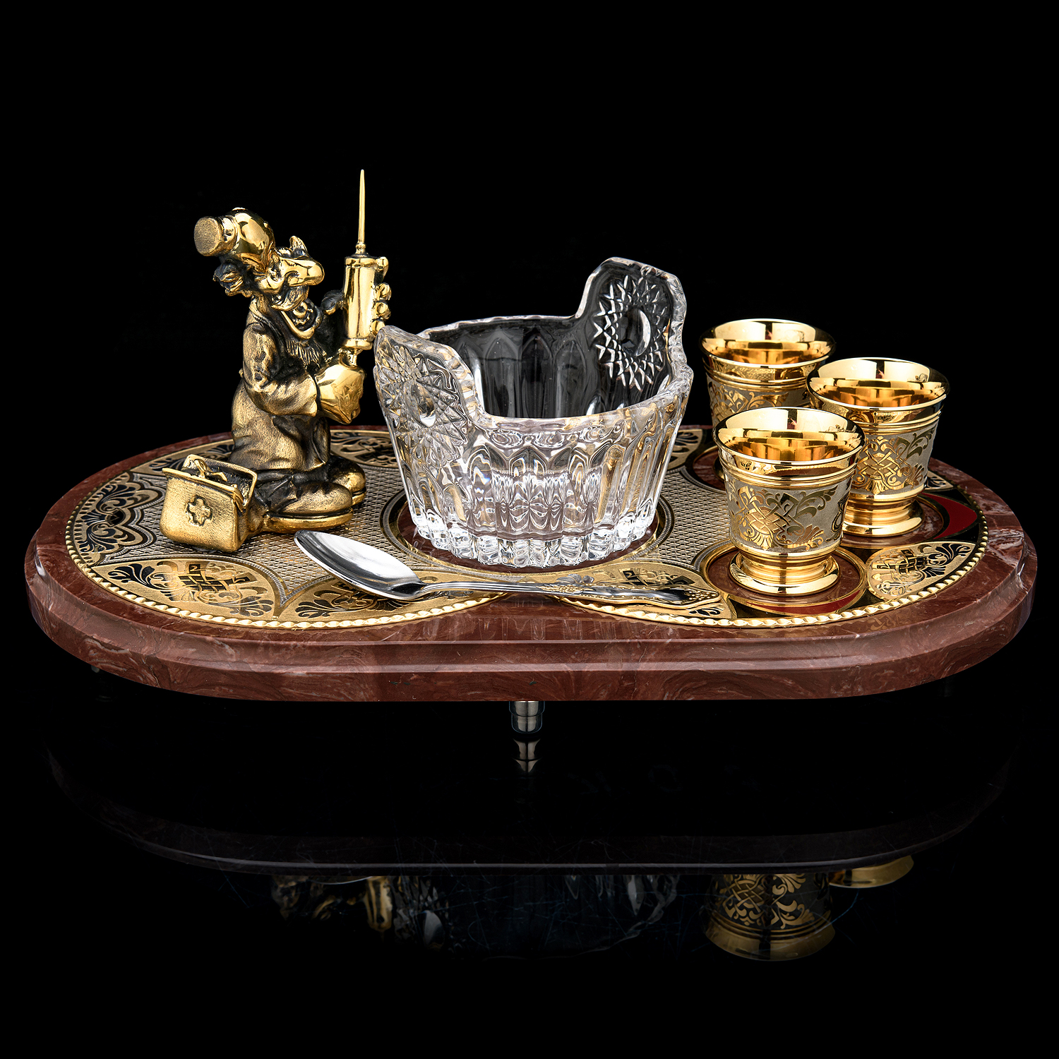 Икорница со стопками "Доктор". Златоуст.Материалы: латунь, никель, золото 999,9*, хрусталь, яшма.