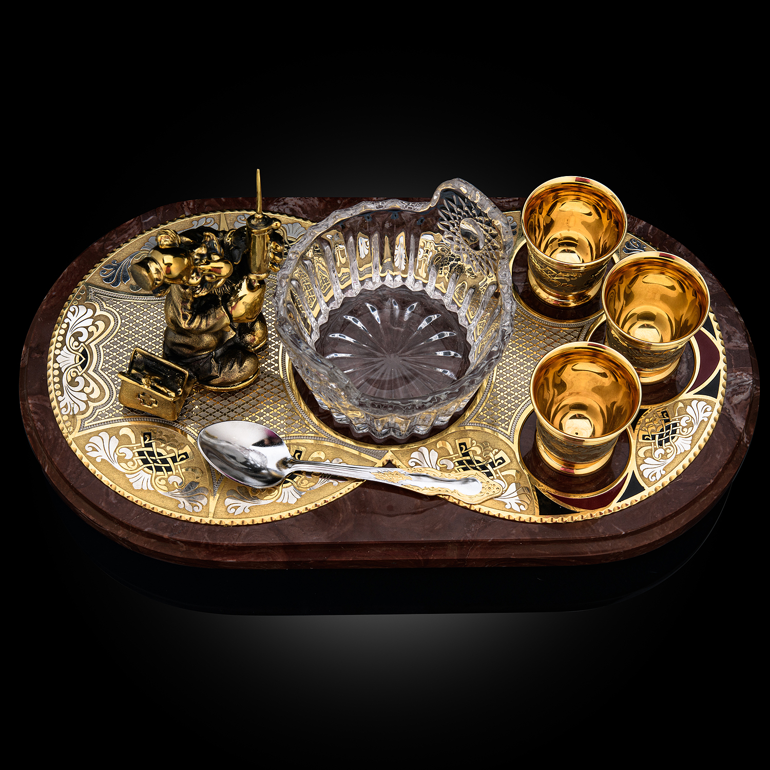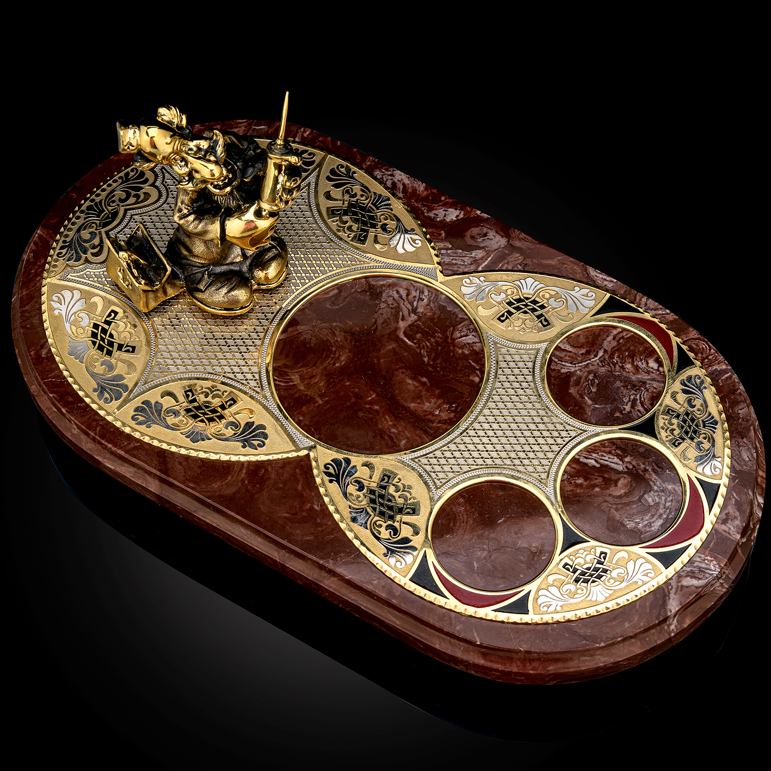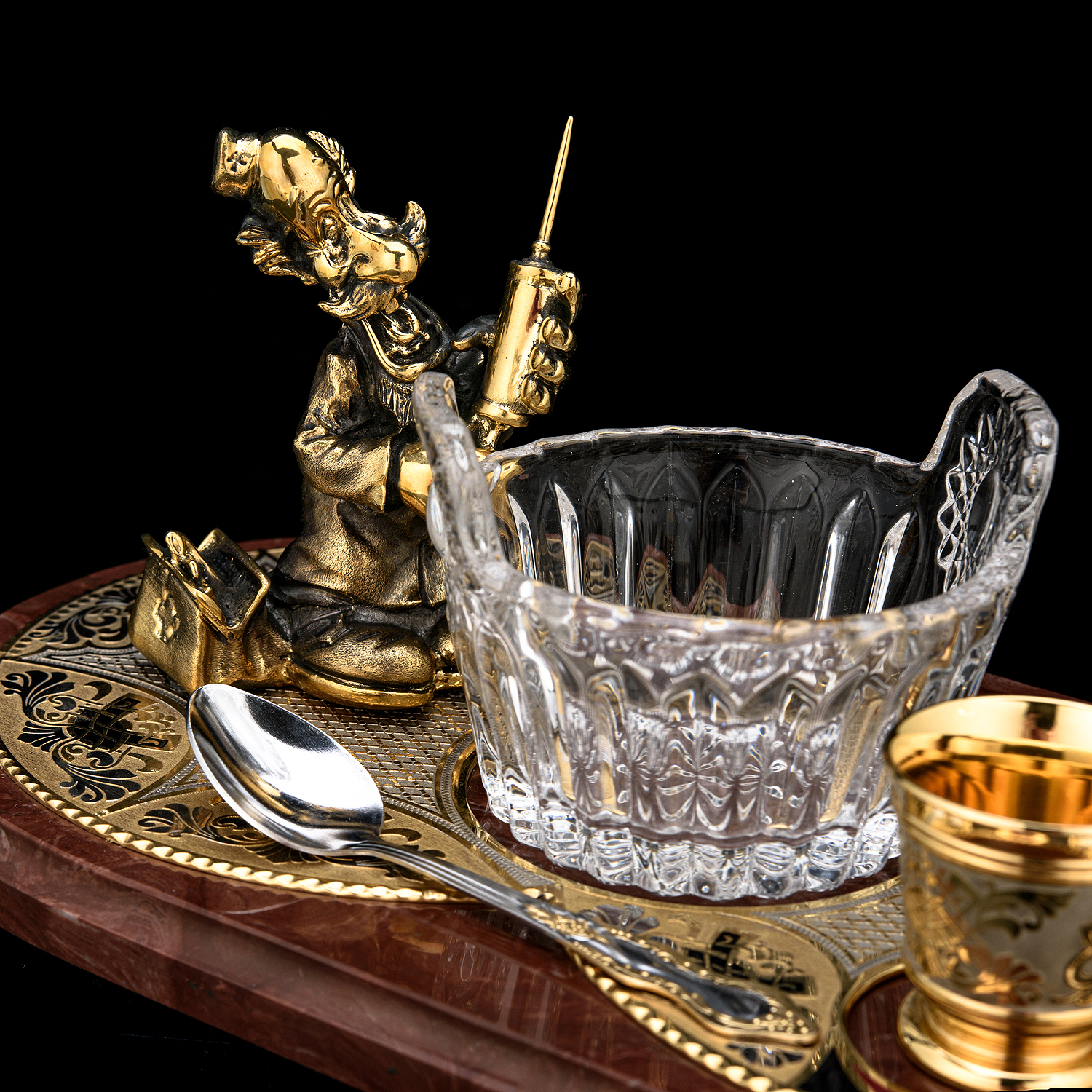 Икорница со стопками "Доктор". Златоуст.Материалы: латунь, никель, золото 999,9*, хрусталь, яшма.