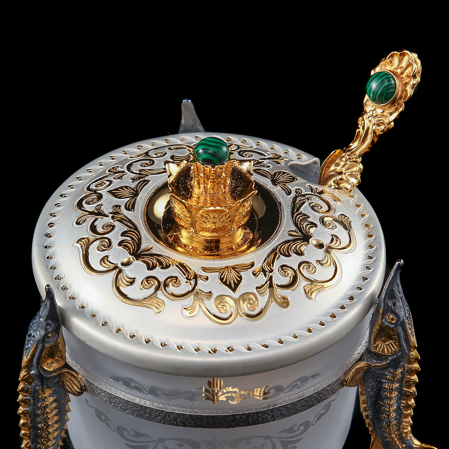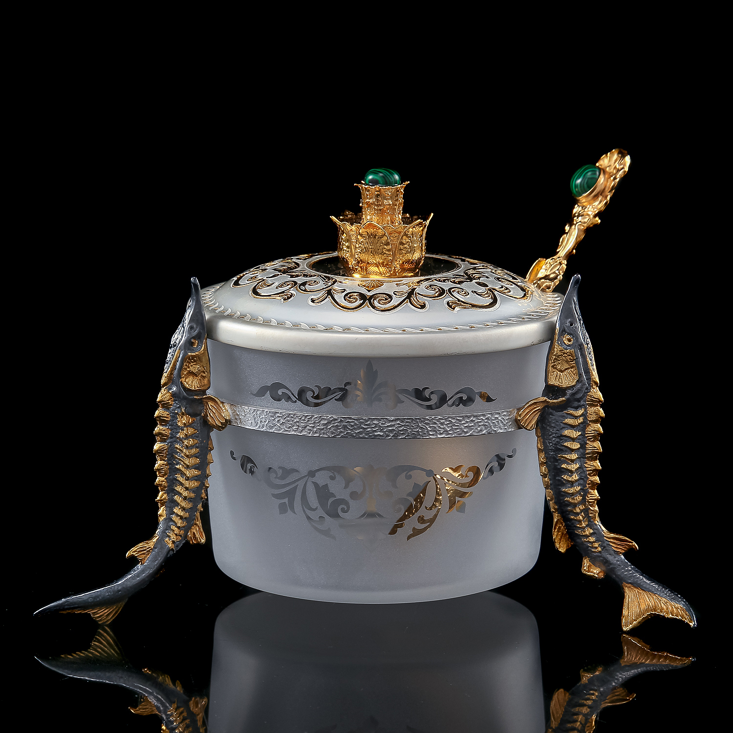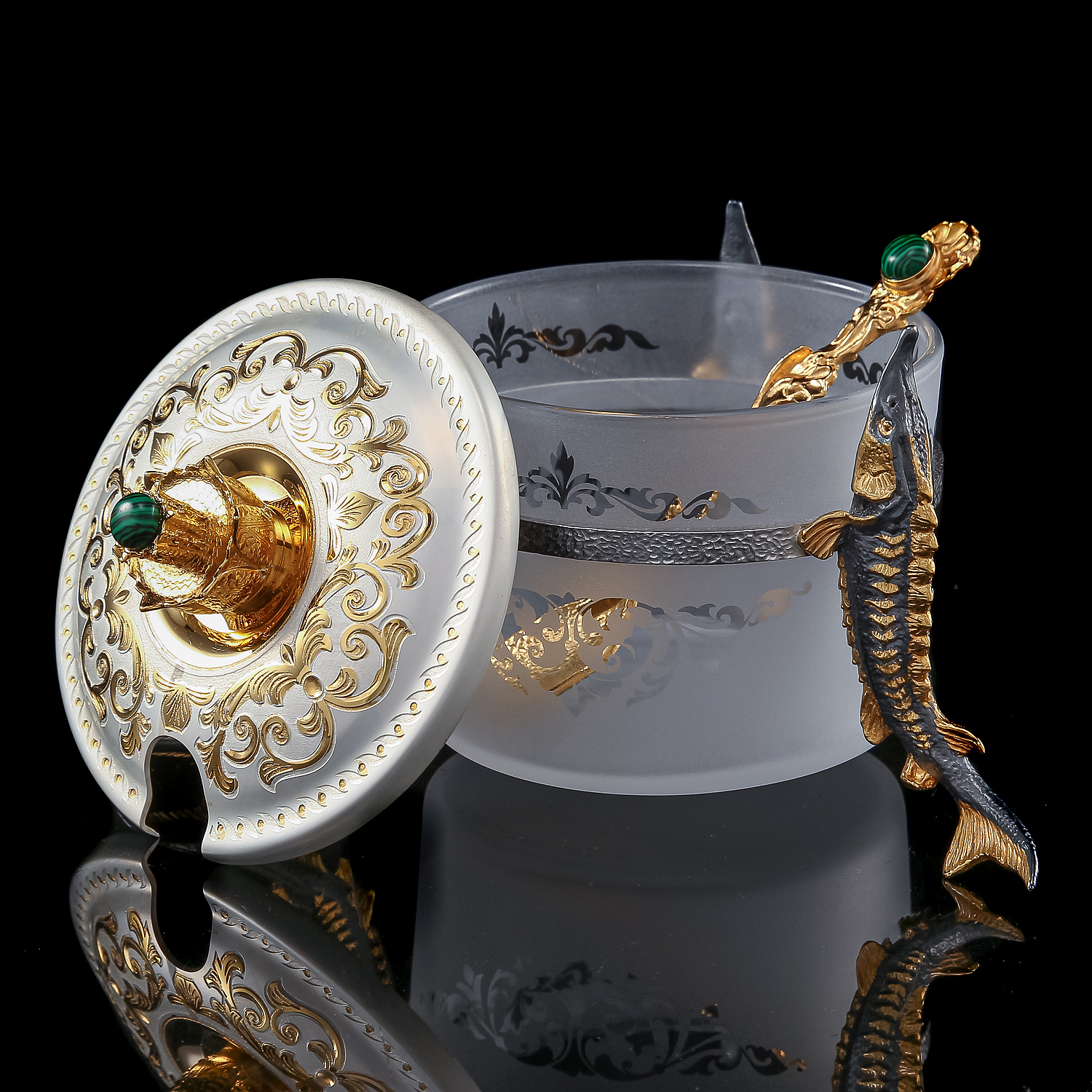 Икорница "Осетр". Златоуст.Материалы: стекло, латунь, серебрение, золото 999,9*, малахит.