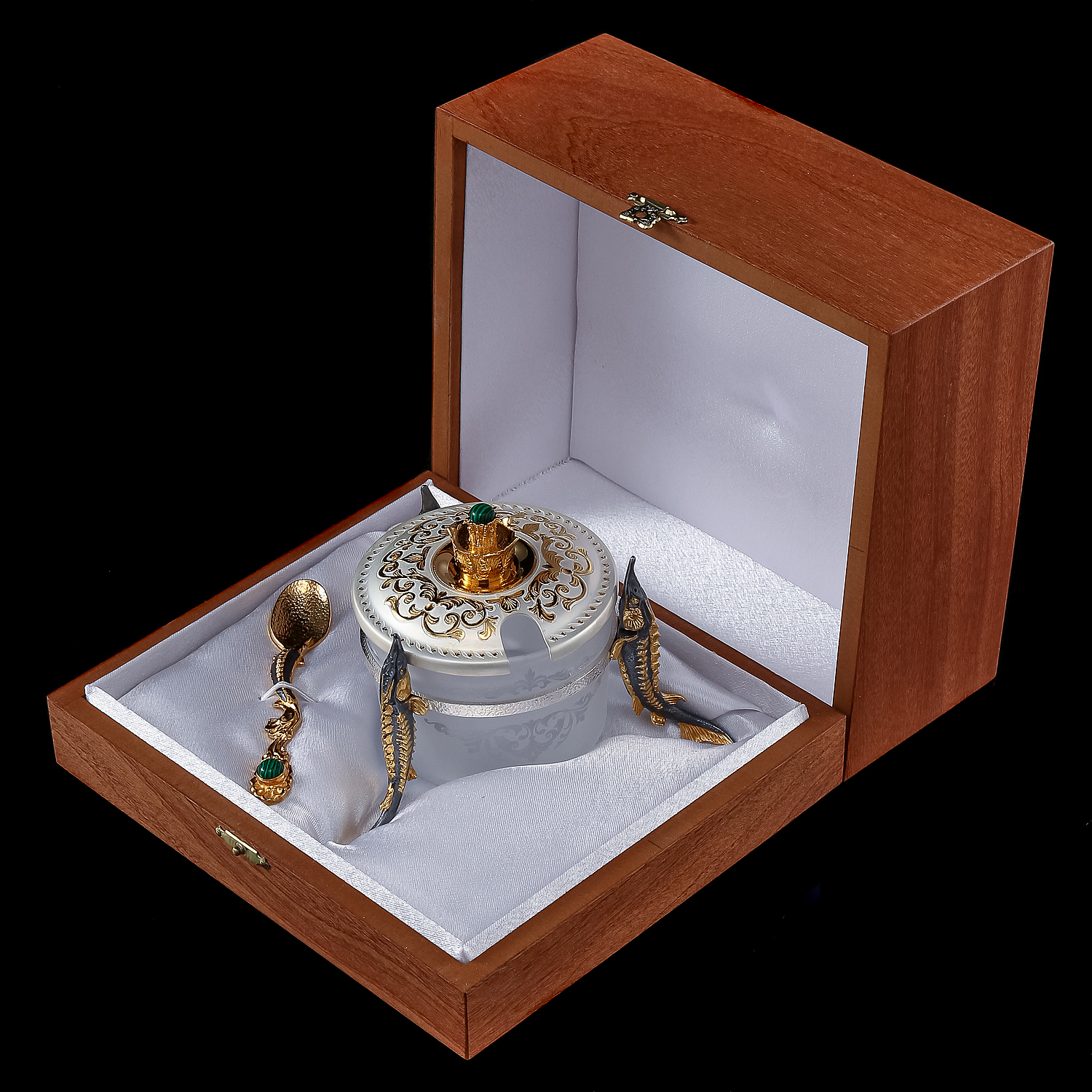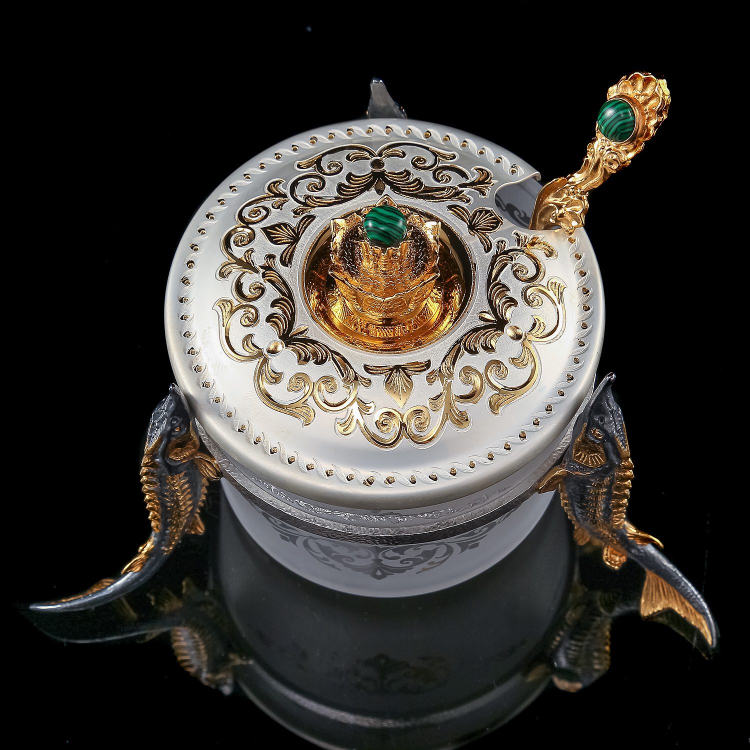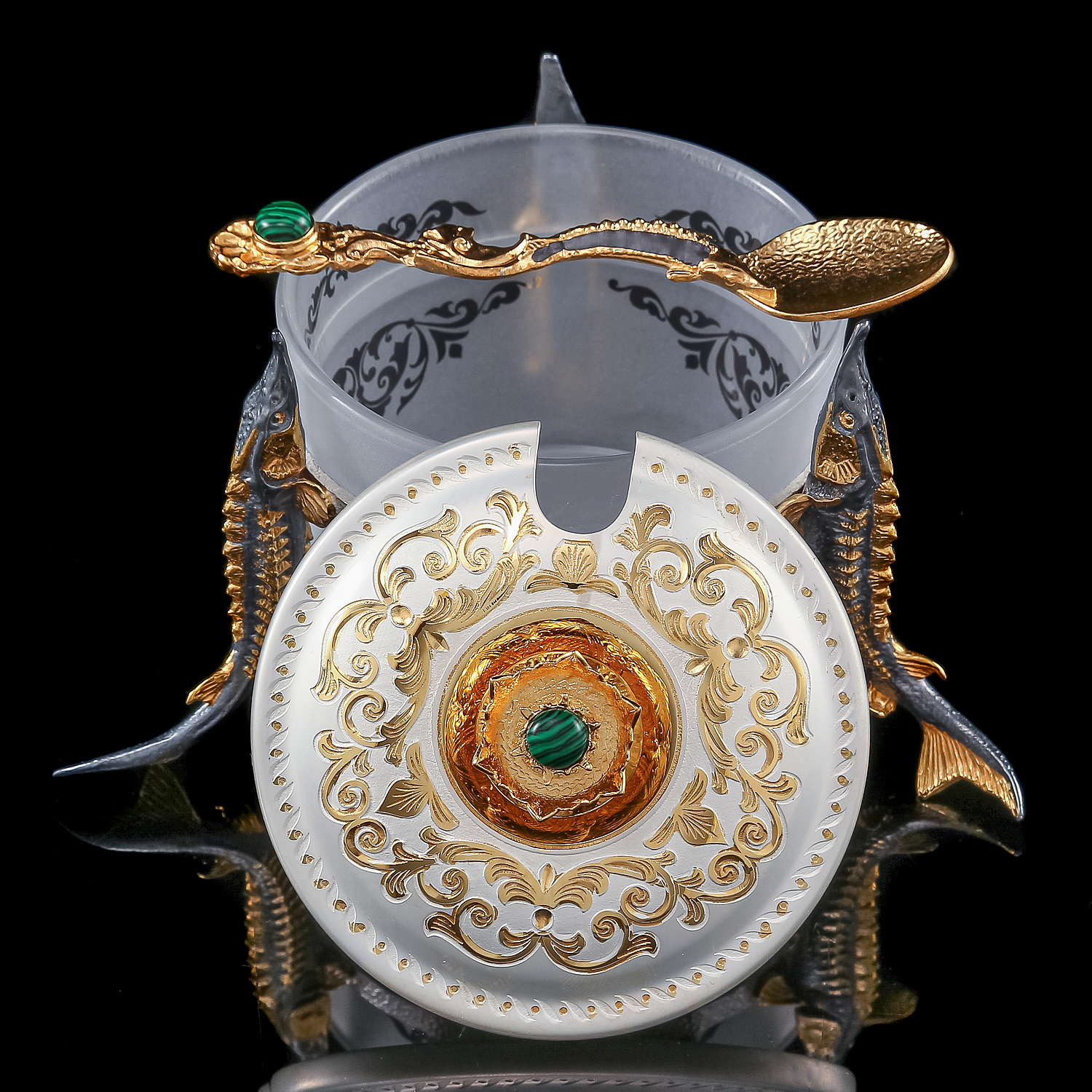 Икорница "Осетр". Златоуст.Материалы: стекло, латунь, серебрение, золото 999,9*, малахит.