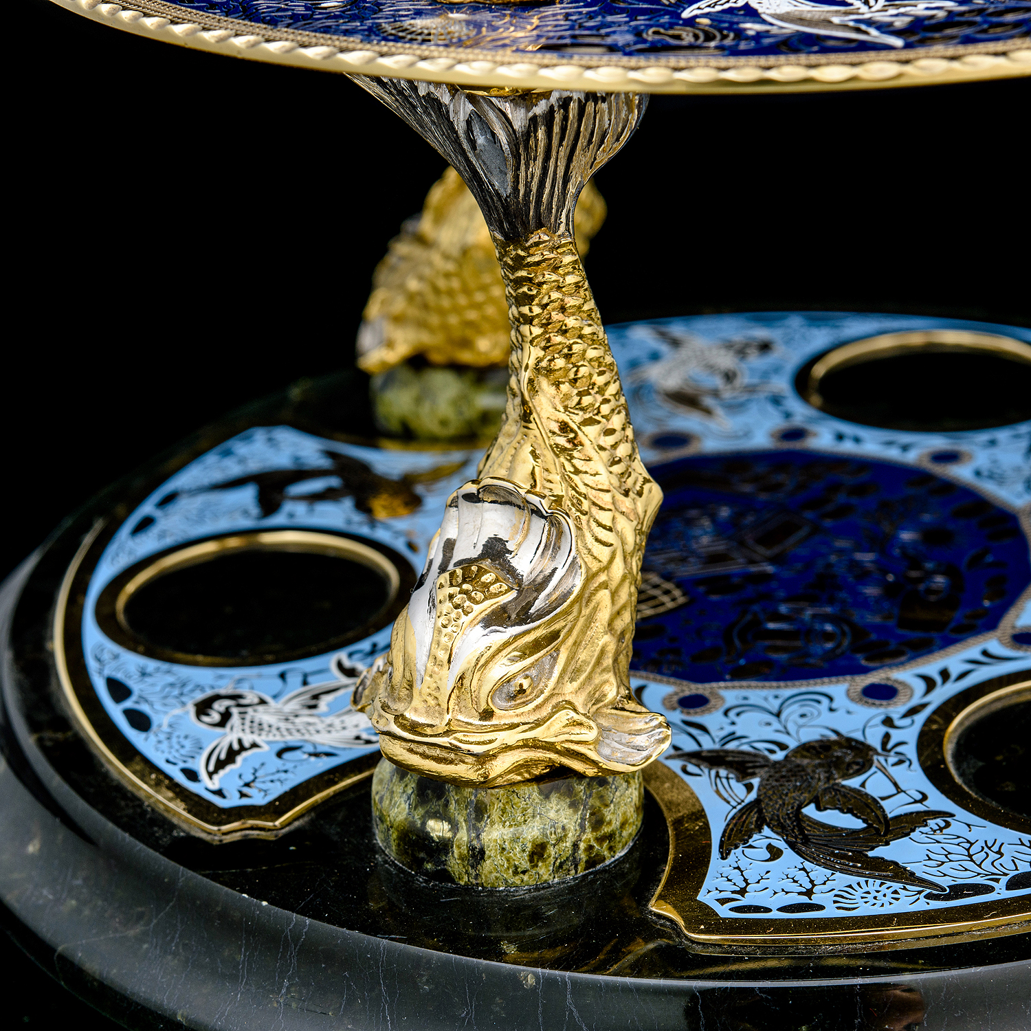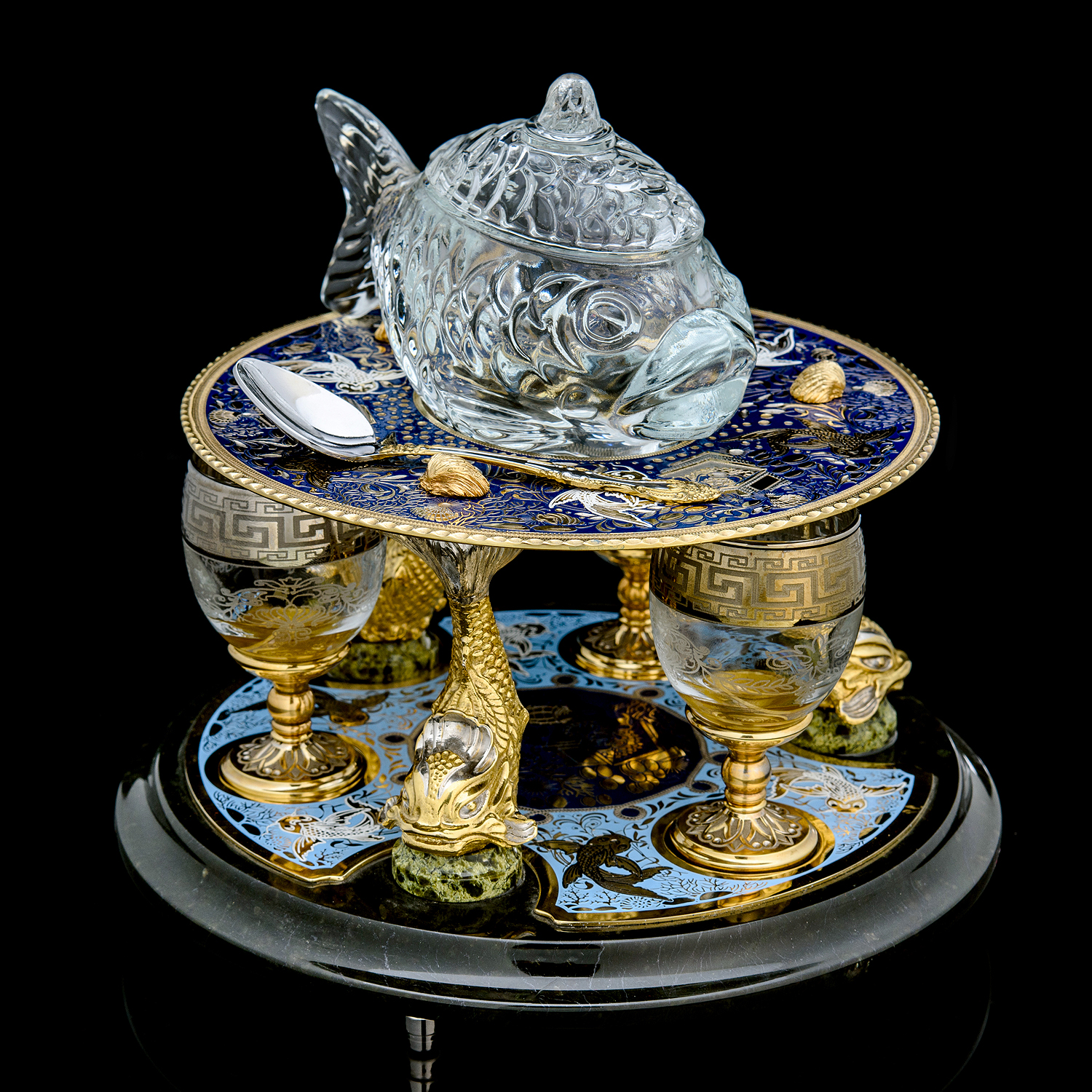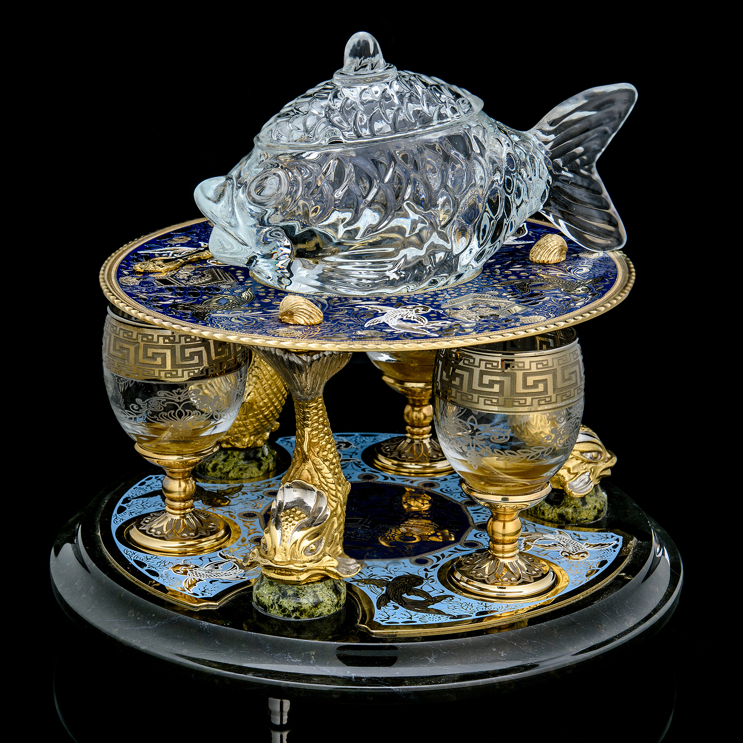 Набор с икорницей и стопками "Инь-Янь". Златоуст.Материалы: хрусталь, латунь, никель, золото 999,9*, эмаль, змеевик.