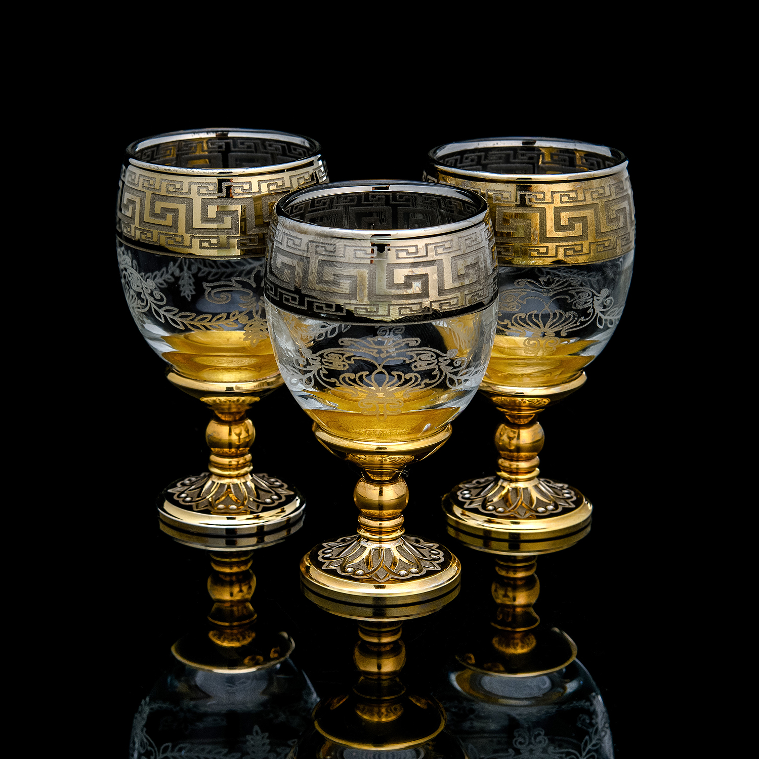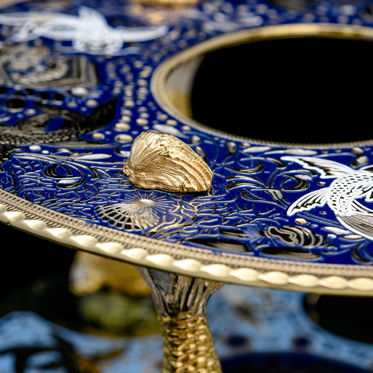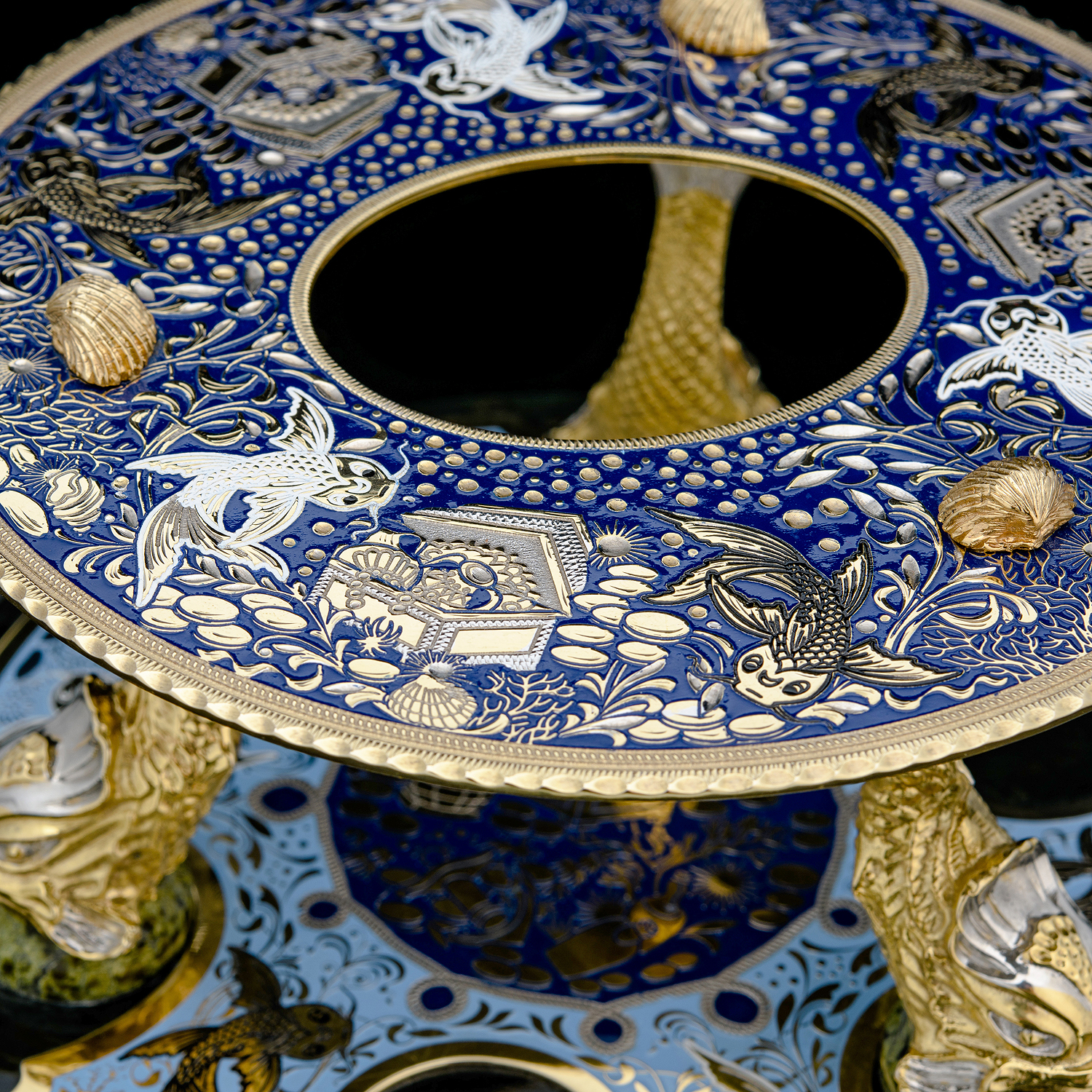 Набор с икорницей и стопками "Инь-Янь". Златоуст.Материалы: хрусталь, латунь, никель, золото 999,9*, эмаль, змеевик.
