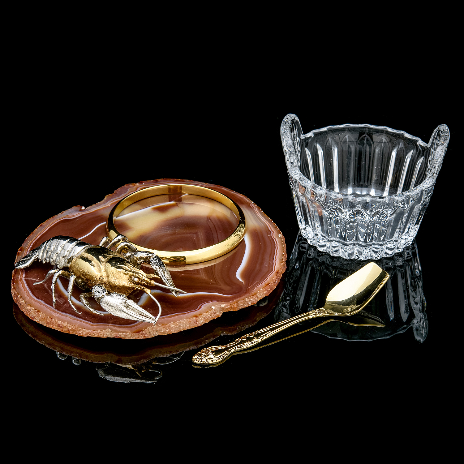 Материалы: латунь, никель, золото 999,9*, хрусталь, агат.
