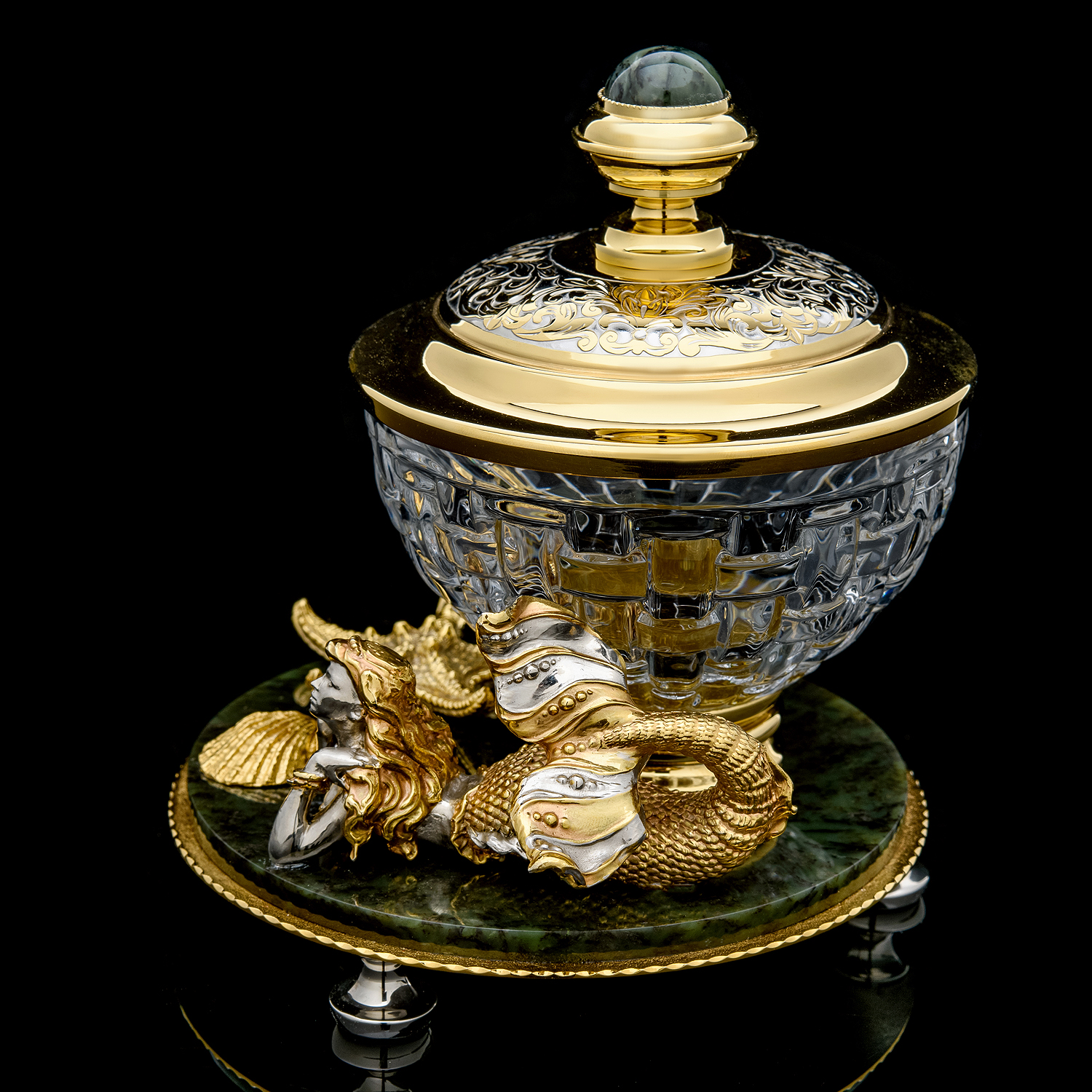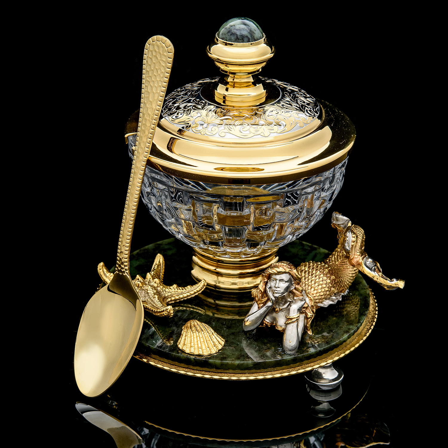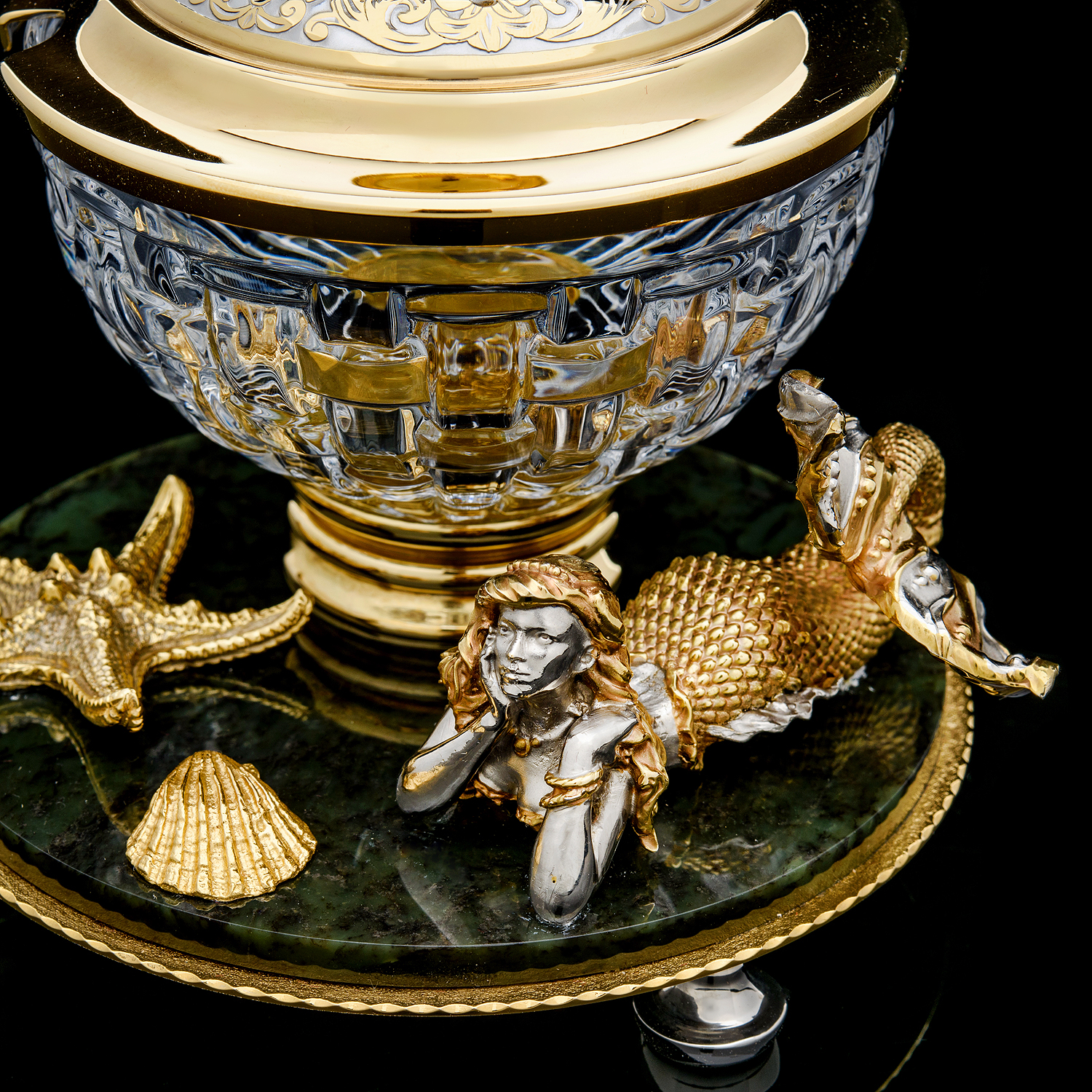Икорница "Русалка". Златоуст.Материалы: латунь, никель, золото 999,9*, хрусталь, нефрит.